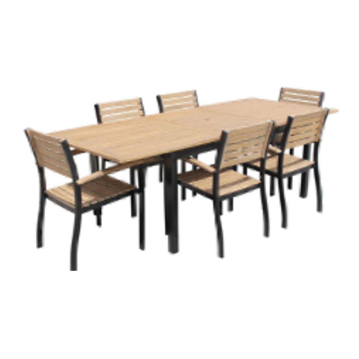 Our Malva 6 seat garden dining set features a stunning modern wood and black metal extendable dining table with 6 matching outdoor dining chairs. A gorgeous combination of materials and colours with a sleek contemporary design means this set will suit a range of styles from modern industrial to more traditional. The table and chairs are all constructed from a sturdy black powder coated aluminium frame with solid eucalyptus wood panels. The wood is responsibly sourced eucalyptus wood with a light teak colour stain and clear lacquer. The table is extendable, with an easy-to-operate butterfly mechanism - simply pull either end of the table to open, and flip out the folding central section - meaning there's plenty of room for entertaining and enjoying al fresco dining! The table and chairs are UV and weather resistant so shouldn't fade. Check out our full outdoor furniture range today to complete your dream garden space! Assembly required - easy to follow instructions are provided. This product is FSC certified, meaning the wood used is sustainably sourced.