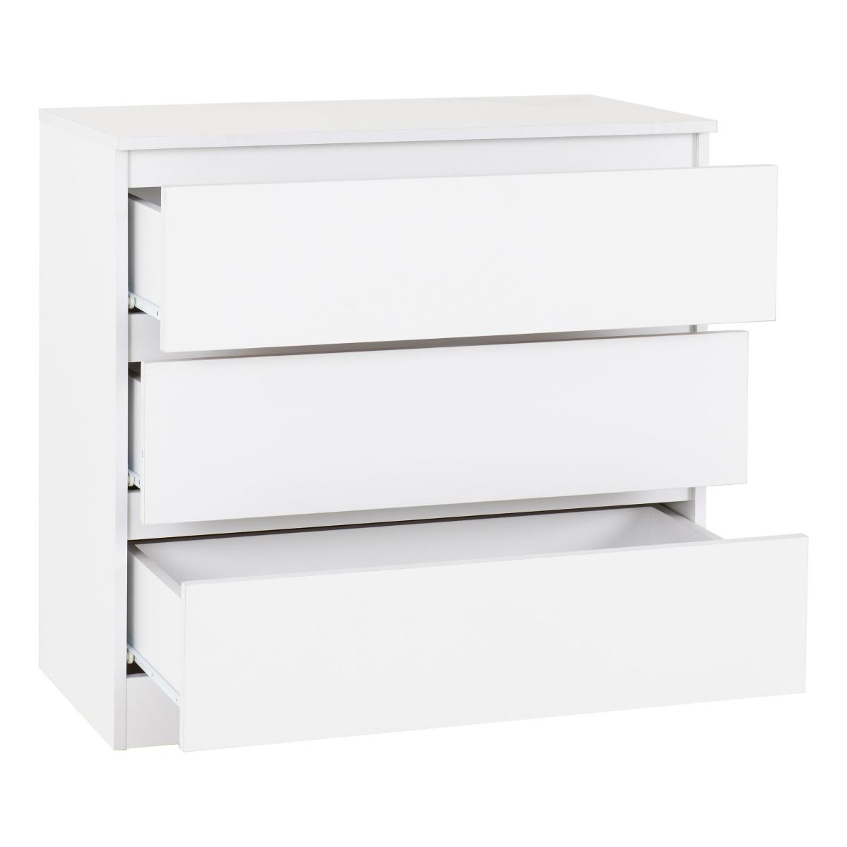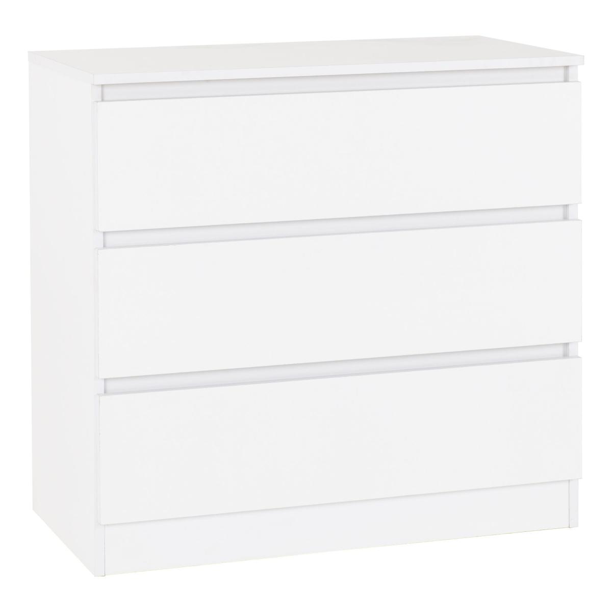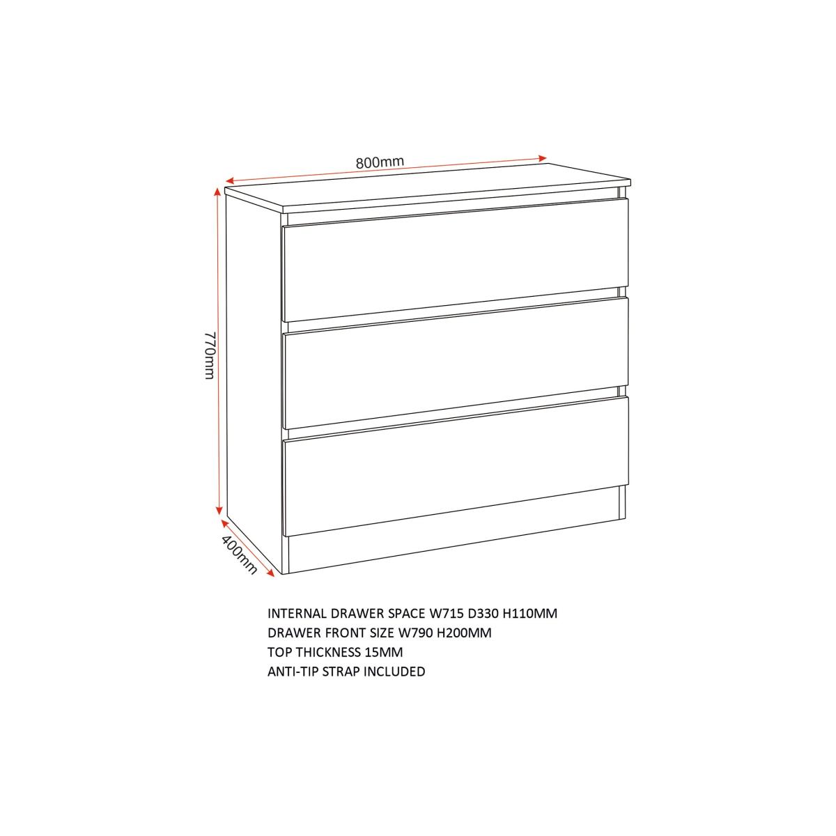 * 3 spacious drawers* Available in multiple wooden finishes* Quick assembly Available in a range of finishes to complement your decor, this chest of drawers blends contemporary style with essential storage capability. With three generously-sized drawers, it offers ample space to neatly organise clothing, accessories, and personal items. The robust construction ensures durability, while the sleek design and minimalist handles add a touch of modern elegance to any bedroom setting.
