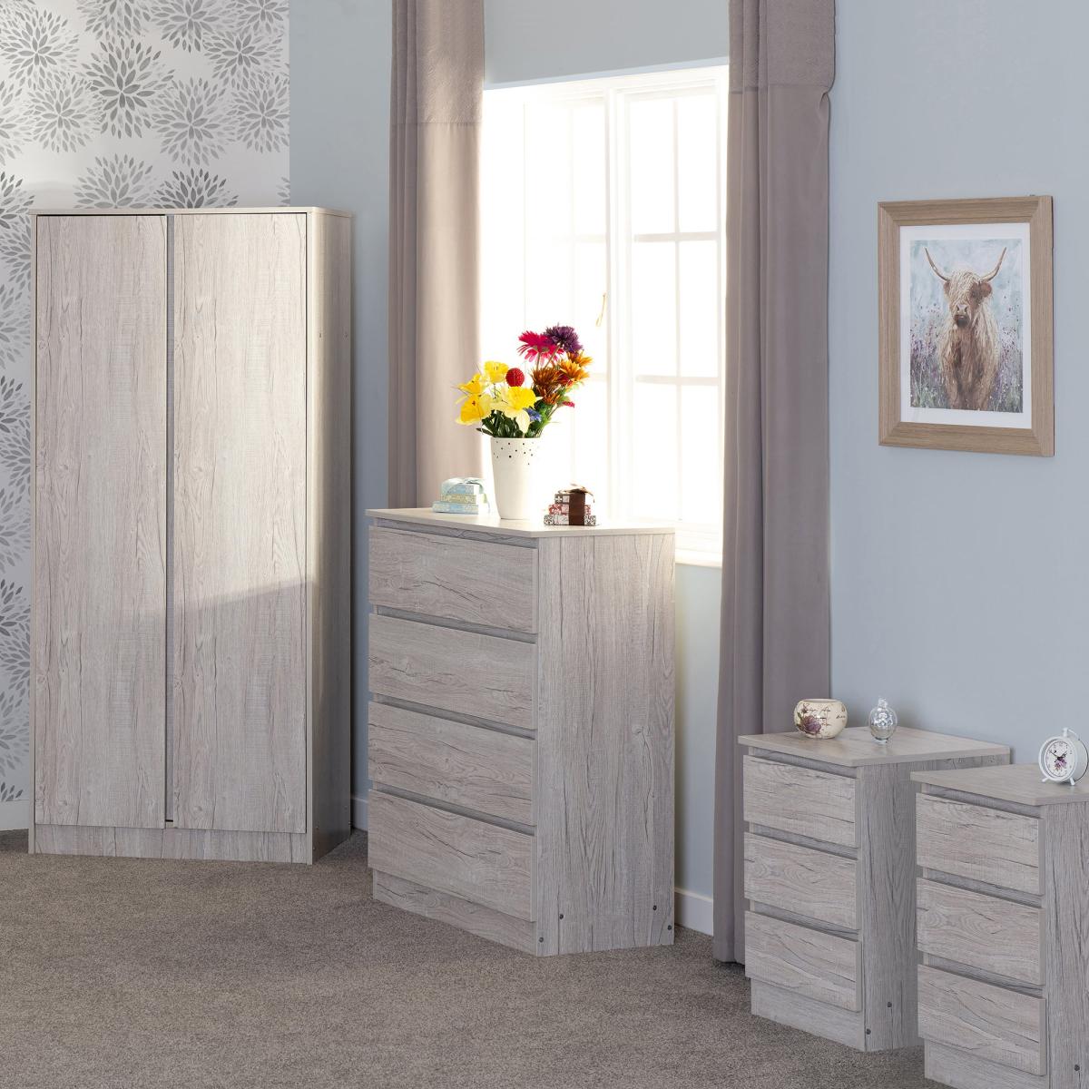 * 1 x Double Wardrobe, 1 x Chest of Drawers and 2 x Bedside Tables* 4 drawer chest, 3 drawer bedside table* Available in multiple wooden finishes* Quick assembly This comprehensive set includes a stylish 2-door wardrobe, a spacious 4-drawer chest, and two versatile 3-drawer bedside tables, each crafted with a commitment to quality and aesthetic appeal. The centerpiece of the set, the Malvern 2-door wardrobe, offers ample storage space for your clothing and accessories, featuring a sturdy hanging rail and convenient shelf for organised storage. Its sleek design and choice of finishes ensure it seamlessly integrates into any bedroom decor, adding a touch of elegance and functionality. Complementing the wardrobe is the Malvern 4-drawer chest, providing additional storage with spacious drawers to keep your clothes neatly folded and easily accessible. Its minimalist profile and smooth-gliding drawers enhance its functionality, while the durable construction promises longevity and reliability. Completing the set are two Malvern 3-drawer bedside tables, perfect for keeping essentials close at hand. Whether used for storing books, lamps, or personal items, these bedside tables offer practicality without compromising on style. Their compact size and modern design make them versatile additions to any bedside arrangement, ensuring a cohesive look throughout your bedroom.