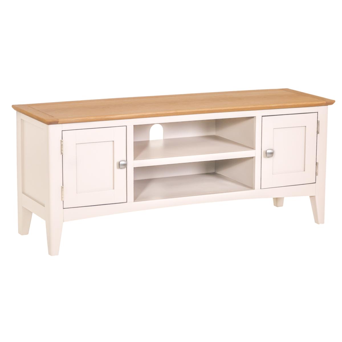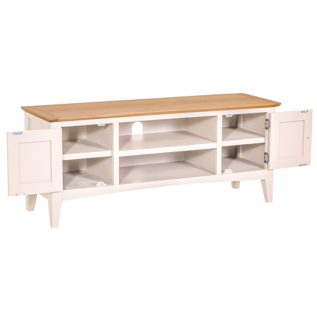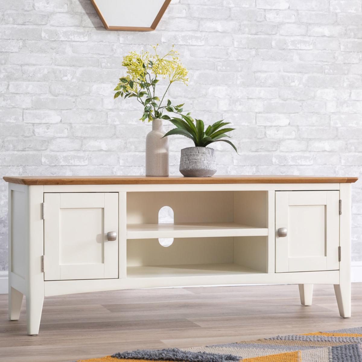 The Malvern Shaker Ivory Painted Oak Large TV Unit allows you to breathe new life into the living room by adding some timeless Shaker style to the picture. With a unique combination of metal and wooden knobs that you can customise with ease, you'll be able to create the functional yet striking TV Stand you've always wanted. Add the ivory painted finish and sleek oak top to the mix, and you have a look that will live long in the memory for all the right reasons. Just what you need when you want your Entertainment Unit to be the star of the show in your new living room.