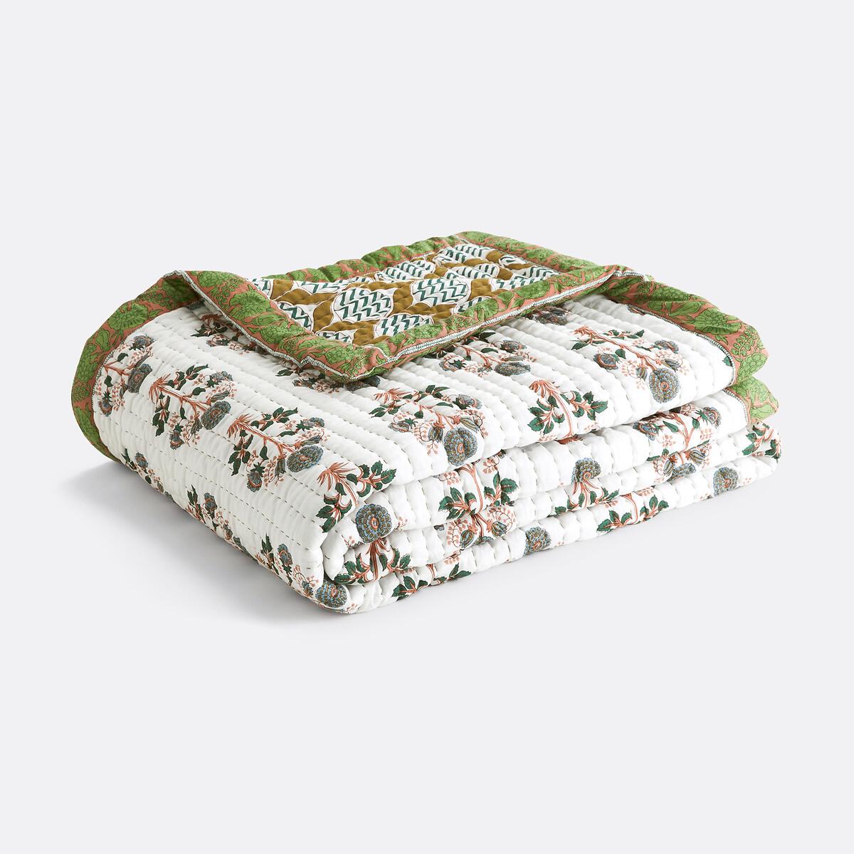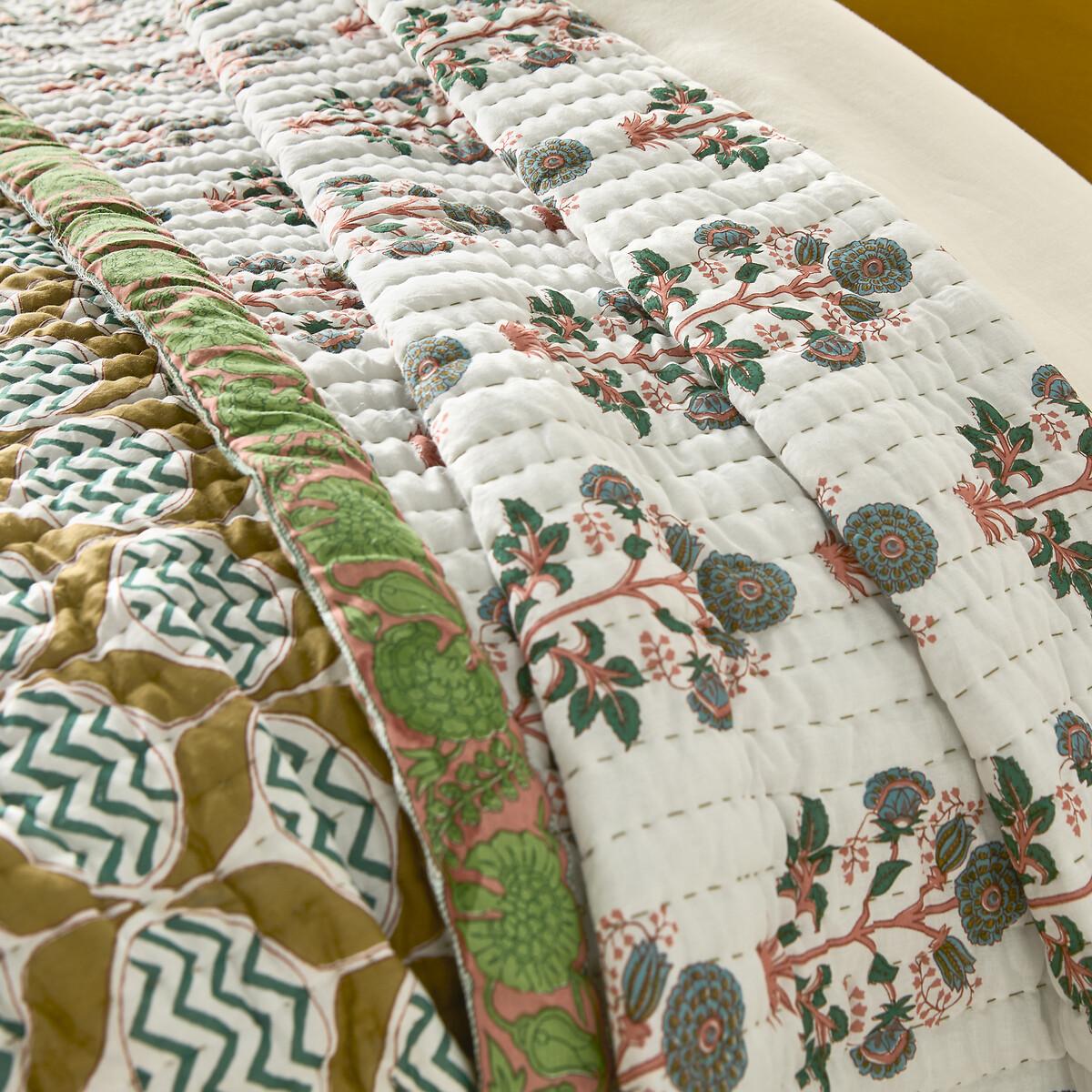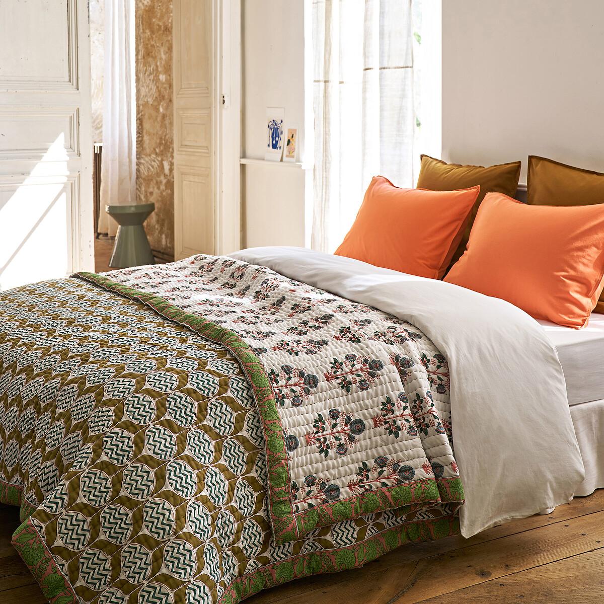 Blooming patterns and block print style prints adorn the Malyam kantha bedspread. The patterns and stitching effects bring bohemian notes to your interior decor. Light, soft and supple, cotton voile is distinguished by its airy appearance. An elegant and delicate material for supreme comfort. Product Details • 100% cotton • Cotton voile • Geometric print on the front, floral pattern print on the back • Kantha style stitching finish and frame on the front and back • Stuffing 100% polyester. Care Advice • Machine washable at 30°CDimensions • 180 x 230cm • 230 x 250cm • OEKO-TEX® Standard 100. Standard 100 certification by OEKO-TEX® tests textile products for harmful substances via an independent, international label.