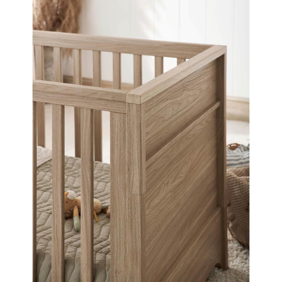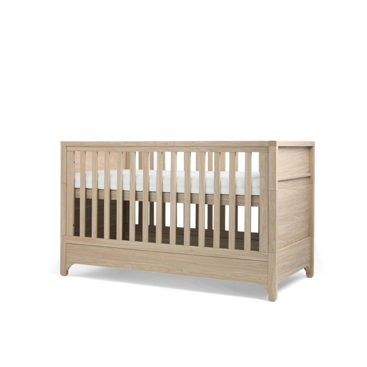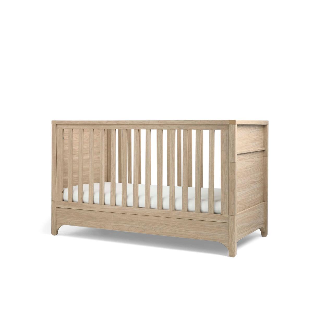 From newborn to toddler, this snug Mamas & Papas cot bed grows with your little one. Featuring curved feet and a warm, natural-oak finish, its timeless style fits seamlessly with any style of décor. The base height is adjustable to three different positions as they begin to stand. When they're ready to move on, remove the sides to convert it into a more grown-up style bed.