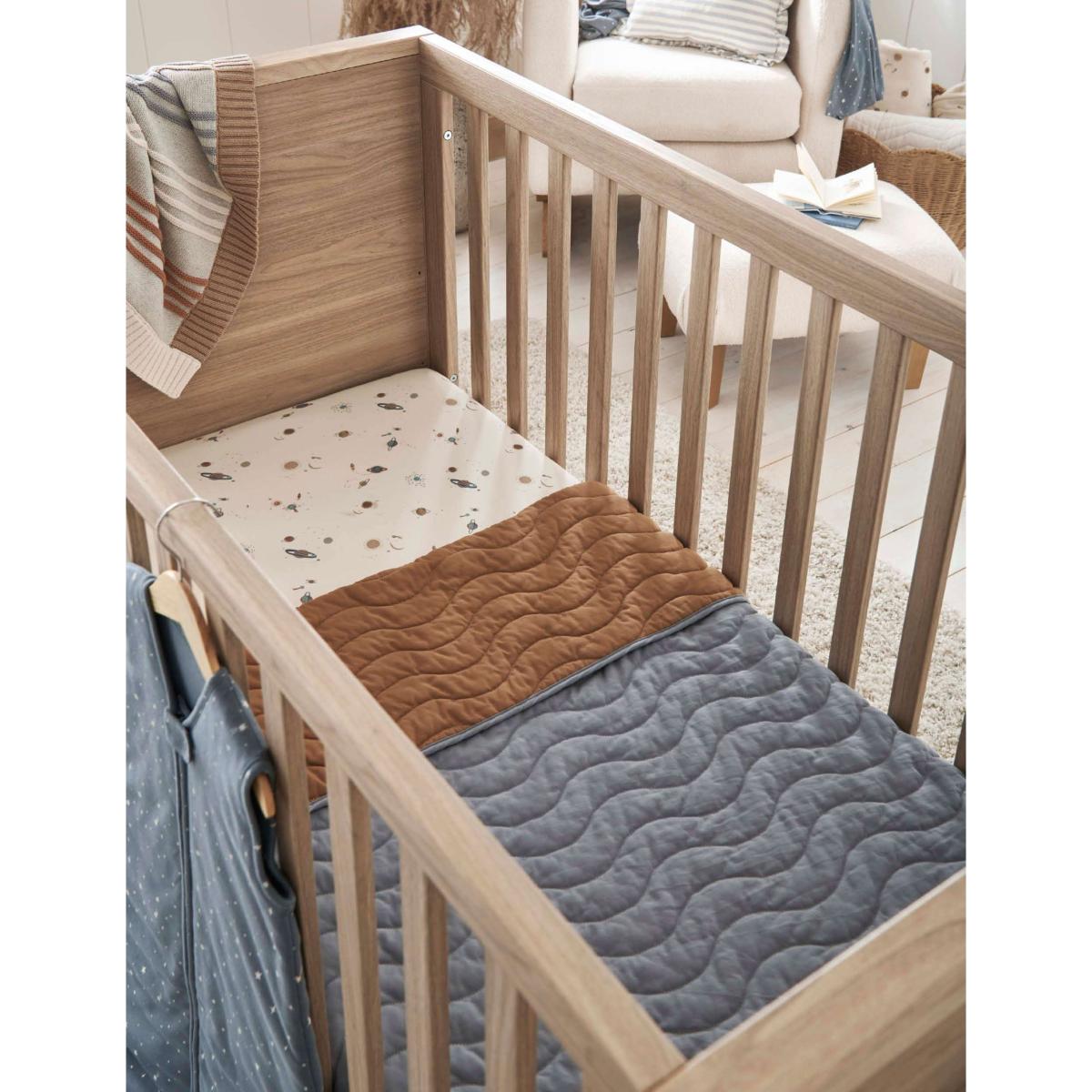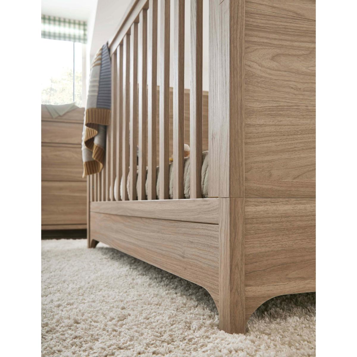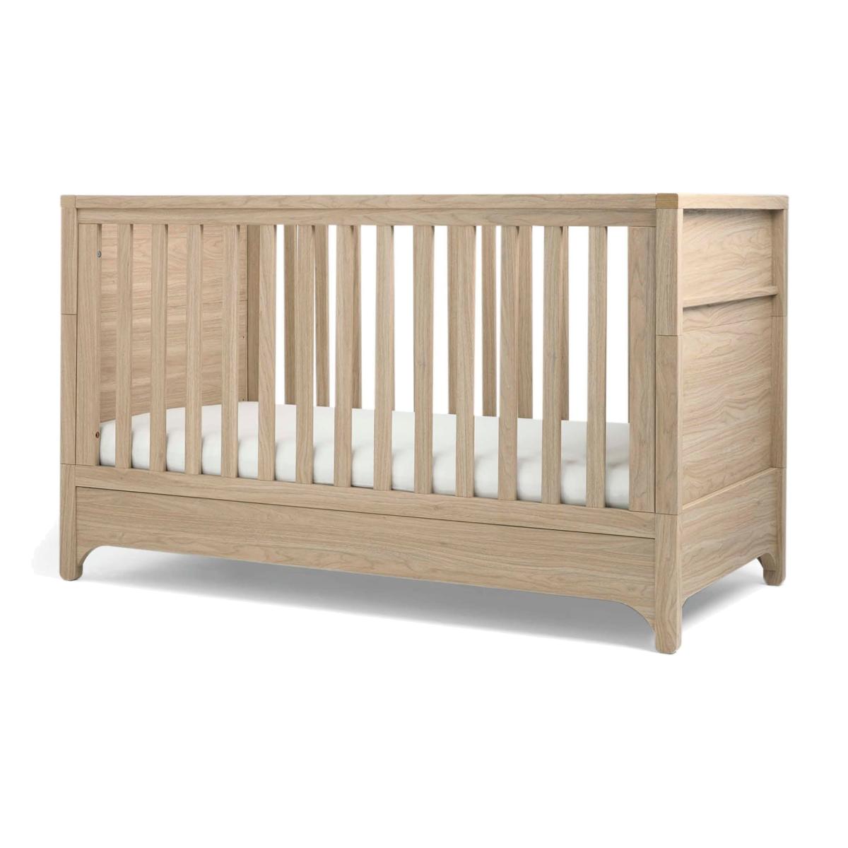 From newborn to toddler, this snug Mamas & Papas cot bed grows with your little one. Featuring curved feet and a warm, natural-oak finish, its timeless style fits seamlessly with any style of décor. The base height is adjustable to three different positions as they begin to stand. When they're ready to move on, remove the sides to convert it into a more grown-up style bed.