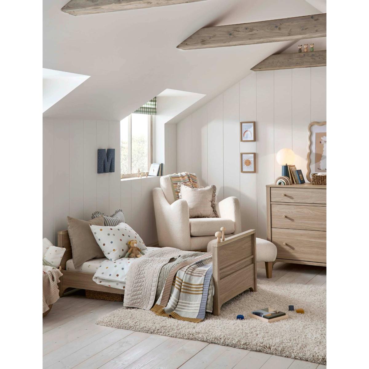 I love this cot frame for its clean, classic lines and versatile design that works well in both modern and traditional nursery settings. Its warm wood tone adds a touch of natural softness, making it easy to pair with a range of colour schemes and accessories. Practical styling tips include adding cosy textiles like a textured blanket or patterned cot sheet to bring personality without cluttering the space. It’s a generous size that suits evolving nursery layouts, and because of its neutral shade, it can seamlessly transition into other rooms as the little one grows. To keep the look fresh, consider pairing it with minimal furniture and some playful or calming accent colours to create a calming, functional environment.