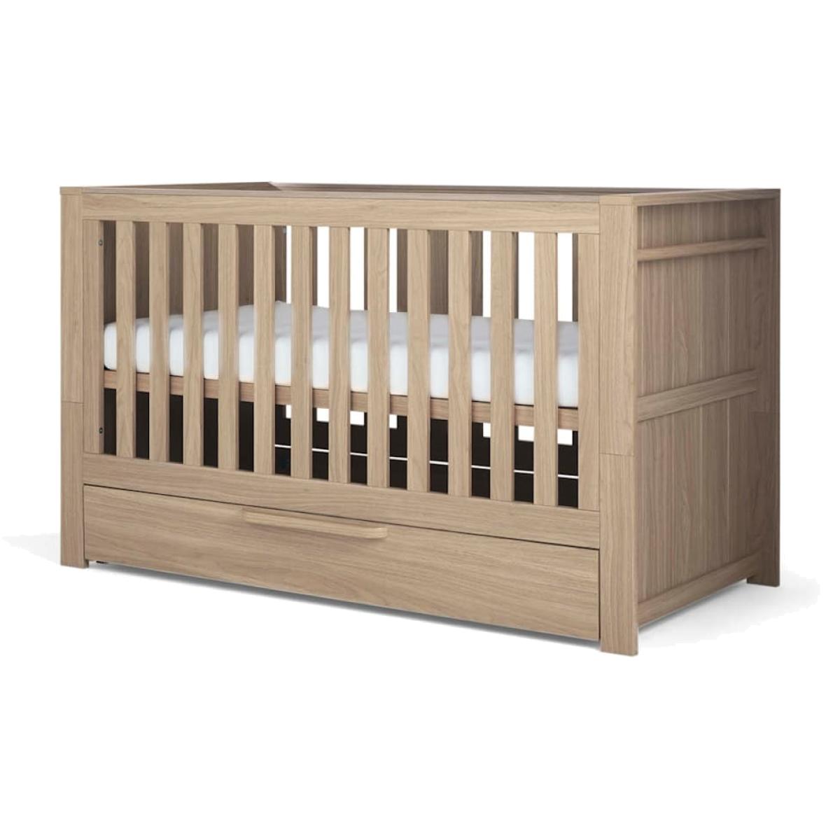 This versatile cot bed from Mamas & Papas will see your little one through their early years. It can be converted from a cot into a toddler bed and a day bed, and has a contemporary natural oak finish. The adjustable base can also be set in two height positions so you can pick up your little one with ease. A full-length drawer and a hanging rail offer a practical storage solution.