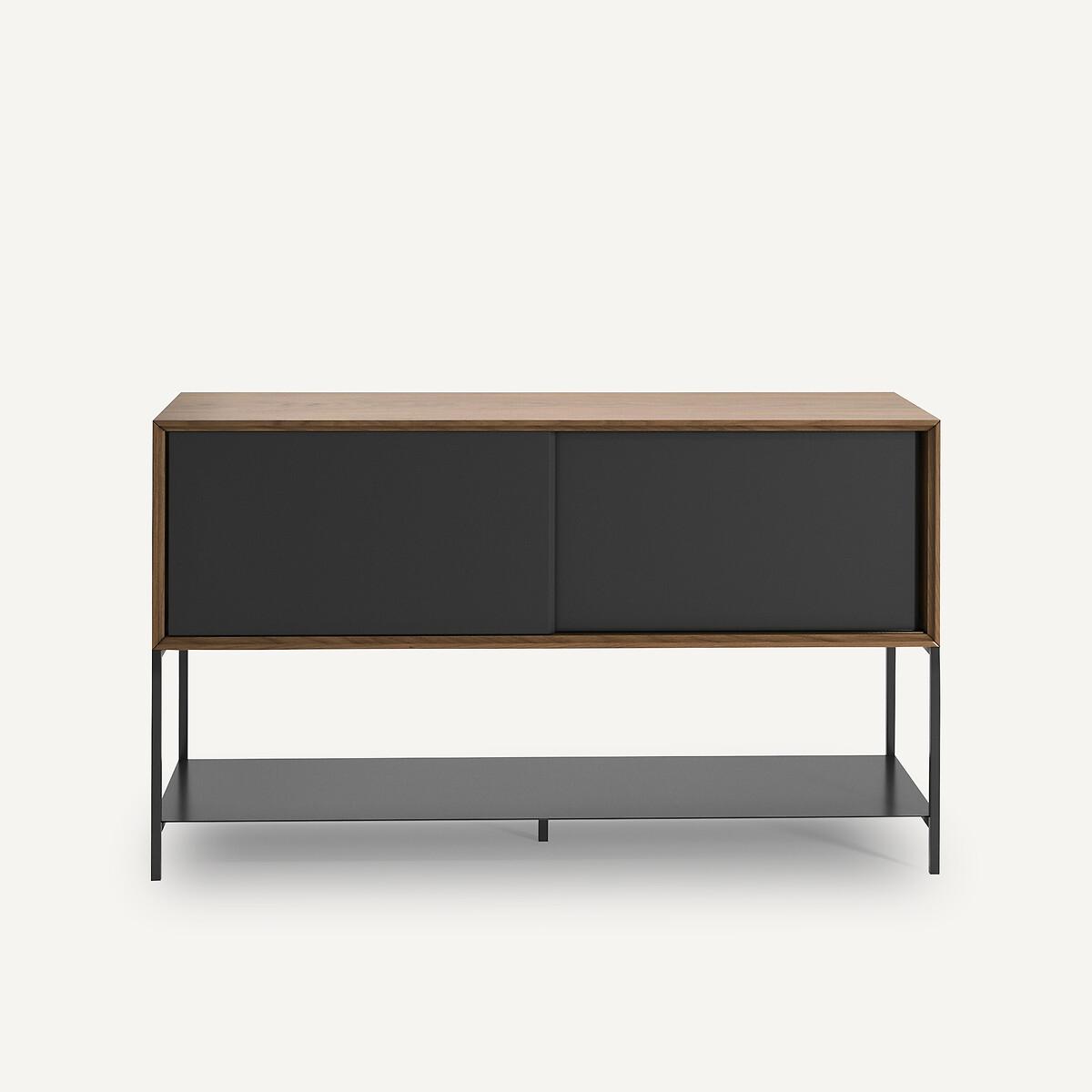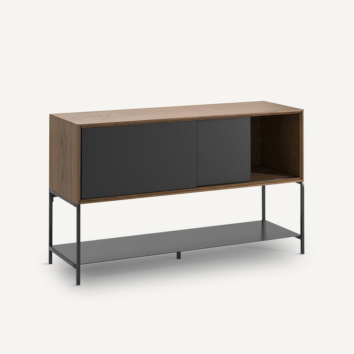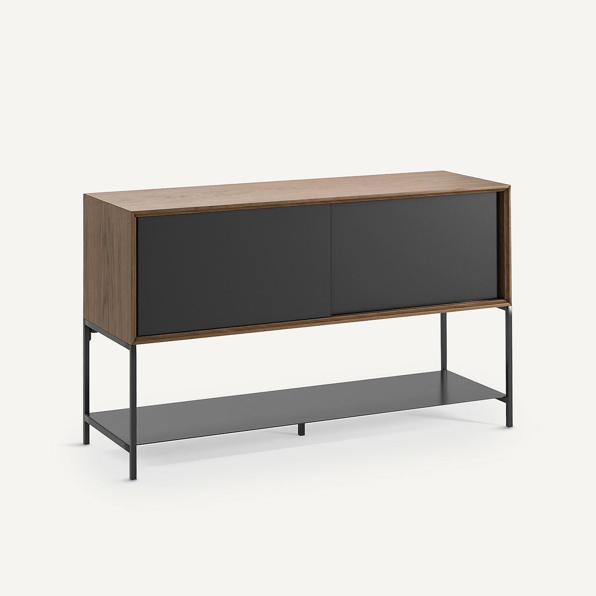 Mambo sideboard. This sideboard boasts a look that’s straight out of the Fifties, stylishly teaming the warmth of walnut veneer with the toughness of metal. Product Details • Structure in stainless steel, black epoxy finish • Box in FSC® walnut veneered particle board, polyurethane finish • Sliding doors in FSC® wood MDF, covered with polyurethane lacquer • 2 compartments • Ready to mount enclosed leaflet Dimensions • L120 x H70 x D39cm • of compartment : L57 x H32 x D39cm • Usable size of each compartment : L57 x H32 x D36cm • WOOD FROM SUSTAINABLY MANAGED FORESTS. FSC® certified wood comes from forests that are environmentally, socially and economically well managed. Parcel Dimensions • L125 x H49 x D43cm • 37kg