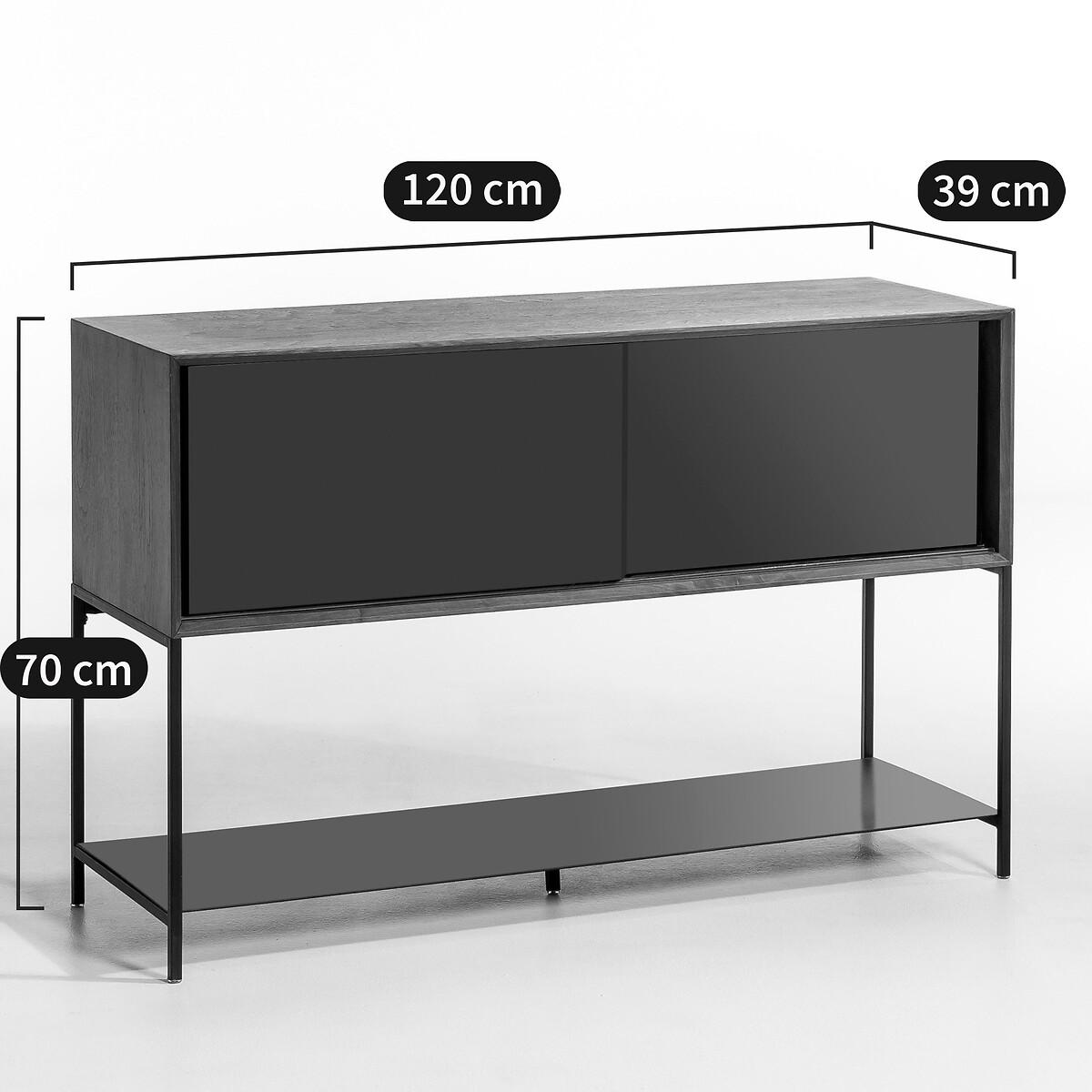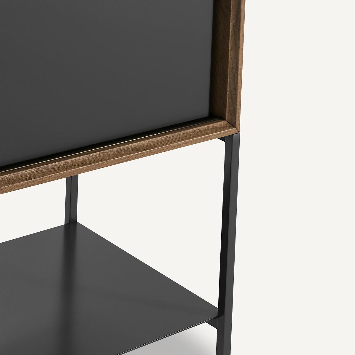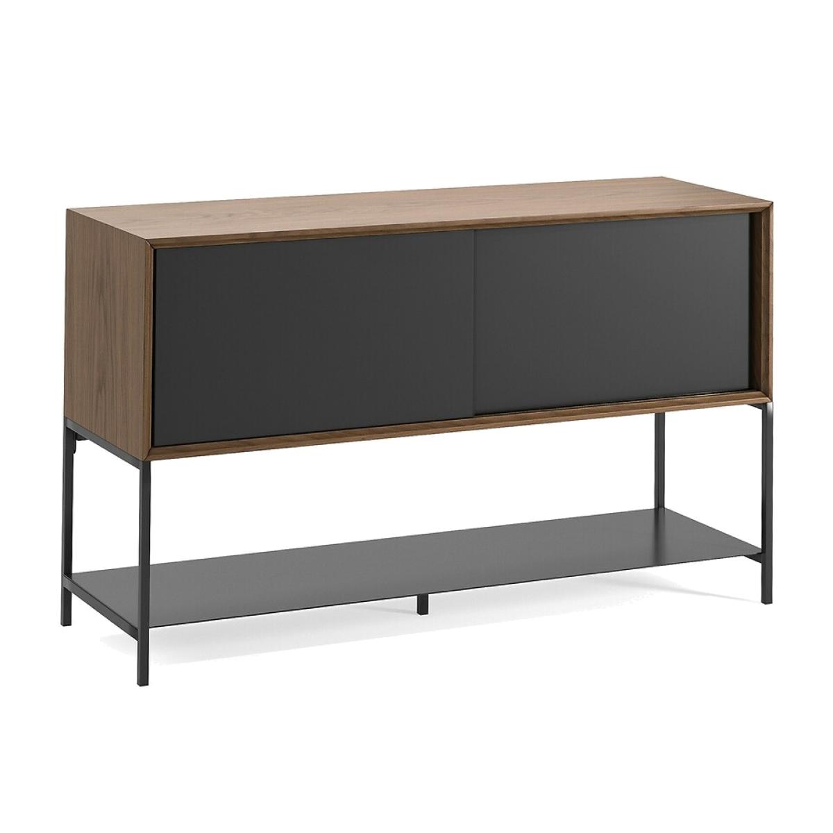 Mambo sideboard. This sideboard boasts a look that’s straight out of the Fifties, stylishly teaming the warmth of walnut veneer with the toughness of metal. Product Details • Structure in stainless steel, black epoxy finish • Box in FSC® walnut veneered particle board, polyurethane finish • Sliding doors in FSC® wood MDF, covered with polyurethane lacquer • 2 compartments • Ready to mount enclosed leaflet Dimensions • L120 x H70 x D39cm • of compartment : L57 x H32 x D39cm • Usable size of each compartment : L57 x H32 x D36cm • WOOD FROM SUSTAINABLY MANAGED FORESTS. FSC® certified wood comes from forests that are environmentally, socially and economically well managed. Parcel Dimensions • L125 x H49 x D43cm • 37kg