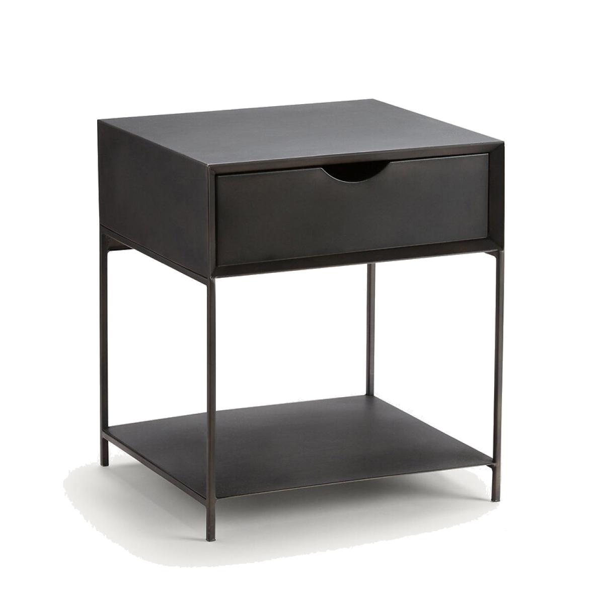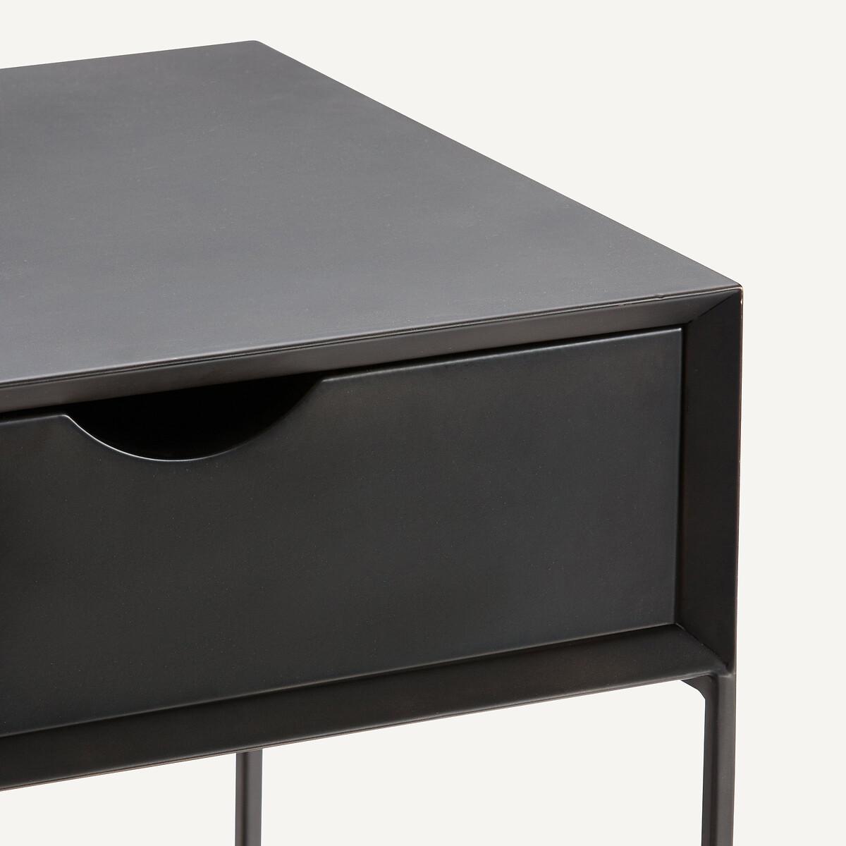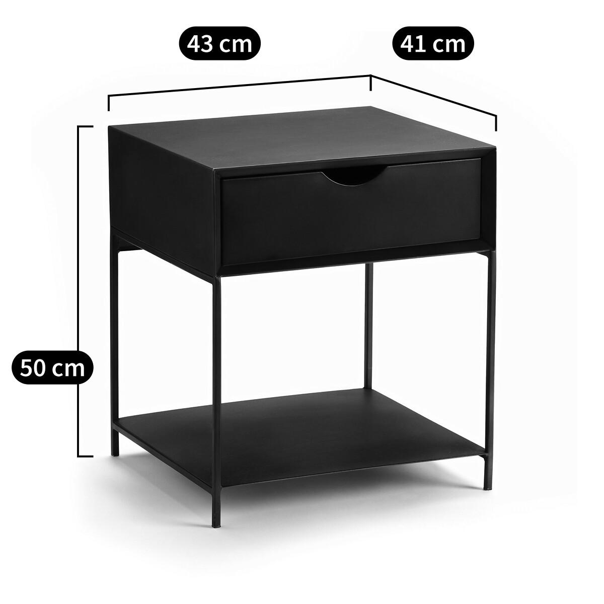 The Mambo metal bedside table. Simple and elegant with a used metal finish, it makes a practical beside table or side table. Product Details • Used epoxy finished steel • 1 drawer • Supplied ready assembled. Dimensions • L43 x H50 x D41cm • Useable drawer dimensions : 39.2 x 11.5 x 38.3cm Parcel dimensions and weight • L55 x H60.5 x D52cm • 18.6kg
