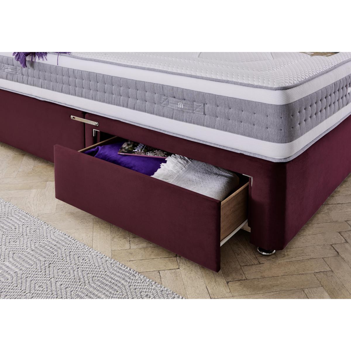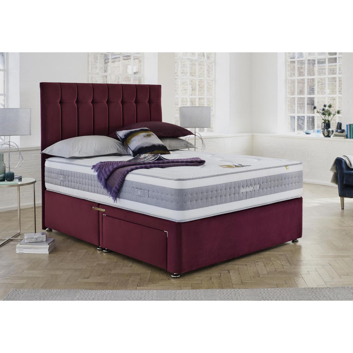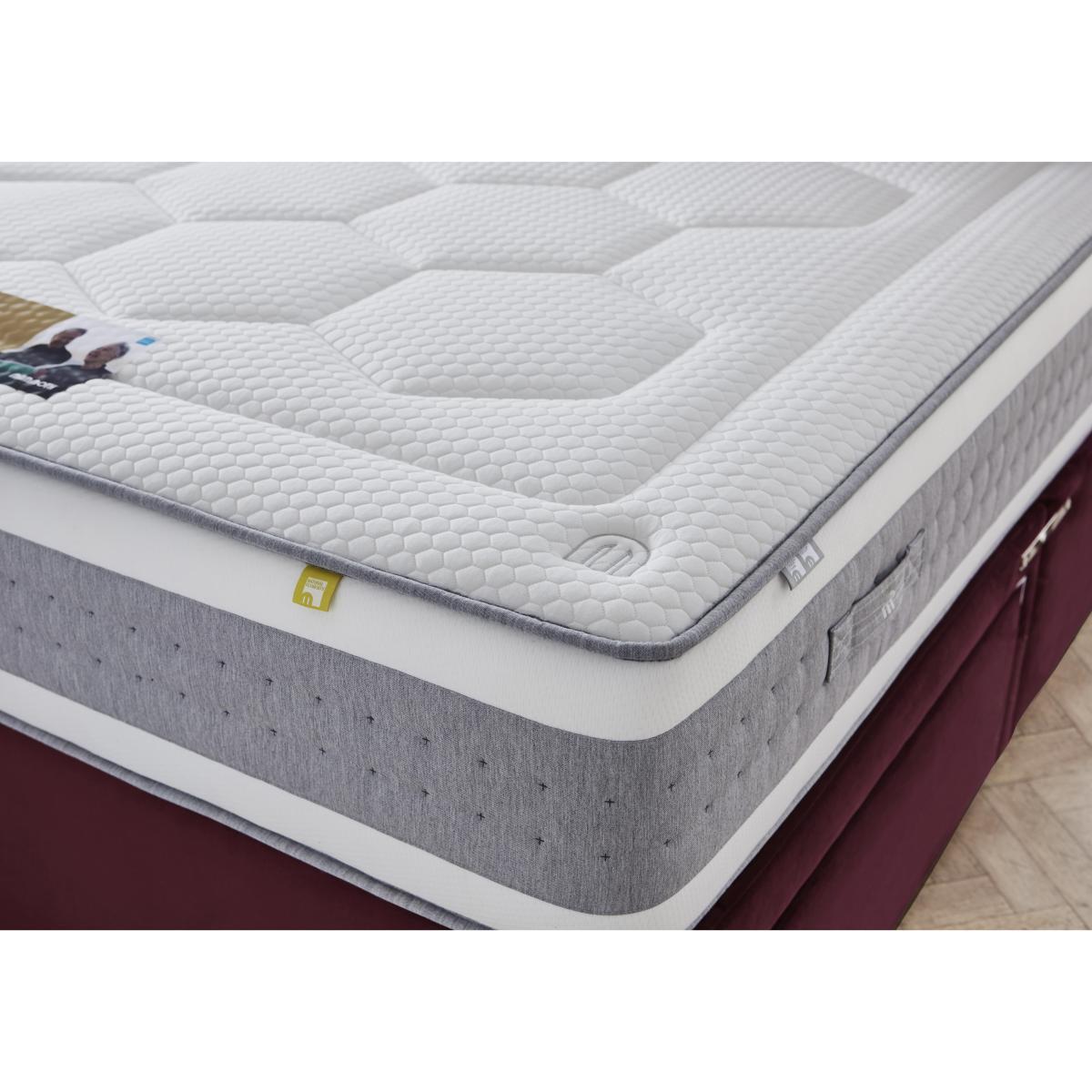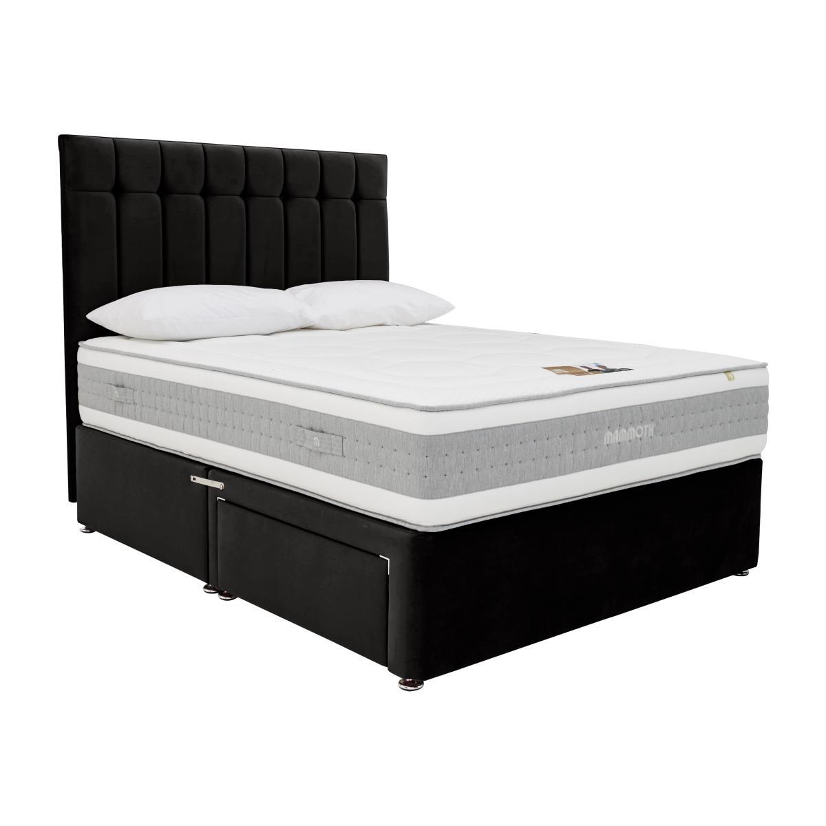 At the heart of the Mammoth Prestige mattress and divan set collection is Mammoth’s body-cushioning Medical Grade™ Foam. This unique material is scientifically proven to improve quality of sleep thanks to its PostureCell™ comfort technology which promotes perfect spinal alignment and absorbs movement while keeping you comfortably cool. The range includes four mattresses, two of which also feature foam-encapsulated pocket springs for optimal support. Beautifully upholstered divan bases offer a choice of optional storage drawer configurations. The Mammoth Prestige collection has been created by Mammoth exclusively for Furniture Village. Made in Britain. Headboard is an optional extra. Mattress with Medical Grade™ Foam plus 2000 pocket springs in king size. Stylish upholstered base has optional storage drawers. Part of the Mammoth Prestige collection, only at Furniture Village. Designed for style as well as comfort, the Mammoth Prestige Pocket 2000 divan set brings together advanced sleep technology with finely-tailored upholstery. The 29 cm medium-feel mattress features a 7 cm layer of Mammoth’s Medical Grade™ Foam. Arranged into seven pressure-relieving zones, this foam is castellated for air flow and has PostureCell™ technology that improves spinal alignment. The same technology also absorbs any motion from a partner for more restful sleep. And unlike ordinary memory foam, Medical Grade Foam does not retain heat – so you stay cool and comfortable all night long. Exceptional support comes from 2000 foam-encapsulated pocket springs in king size and foam-encapsulated borders. This hypoallergenic mattress has a cover made of Tencel™, an eco-friendly, moisture-wicking fabric. It’s set on a stylish divan base that comes with a choice of optional storage drawer configurations and is upholstered in a wide choice of fabrics. Exclusive to Furniture Village, the British-made Mammoth Prestige Pocket 2000 divan set is part of the Mammoth Prestige collection. Product images are representative. Find out more. Please note. The mattress should be aired for four hours after delivery to freshen and remove any aroma from storage. It may take time for your mattress to attain its full size once the springs have settled to the correct position. This is due to the mattress being upright during transit. Settlement of fillings and indentations caused by body weight compressing the fillings are natural and not considered defects. This can be minimised by regular rotating. Product images are representative. Find out more. We recommend the use of a mattress protector.