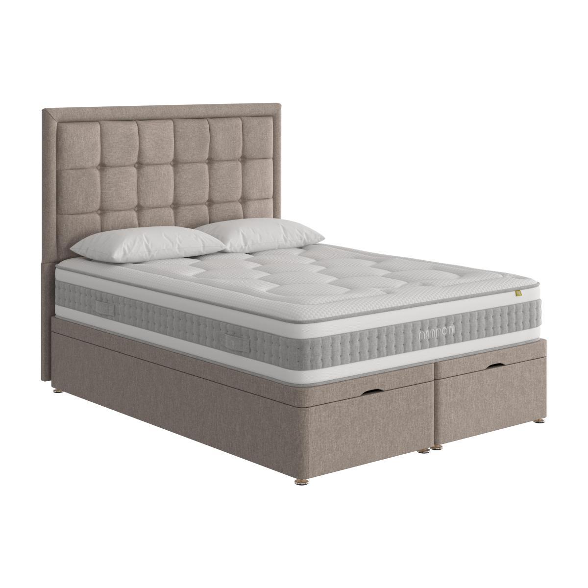 Offering the perfect blend of cooling and cushioning Mammoth Medical Grade™ Foam with high-quality pocket spring support, the mattresses and divan sets in the Mammoth Prestige Pocket Plus 4000 range are designed to support the sleep and health needs of elite athletes – and anyone who demands a wonderful night’s sleep. Made in Britain exclusively for Furniture Village by Mammoth, this well-crafted collection offers a wide choice of mattresses, divan sets with optional storage drawers, and both side- and end-opening ottoman divan sets. Mattress comfort plus spacious storage – this Furniture Village-exclusive divan set has it all. And remember, Mammoth Medical Grade™ Foam is the choice of elite athletes for its ability to disperse heat and relieve pressure. Why you'll love it. Superior Mammoth ottoman divan set with Medical Grade™ Foam and pocket springs. Mammoth mattresses are the choice of the nation’s elite athletes. Cooler than memory foam, Medical Grade™ Foam is scientifically proven to improve sleep. Relieves pressures, absorbs motion and encourages spinal alignment. Features Mammoth’s PostureCell™ technology. Castellated mattress structure encourages air flow and disperses heat. With 4000 pocket springs in king size arranged in seven zones. Hypoallergenic. Platform-top base has end-opening ottoman storage space. Designed in partnership with the Chartered Society of Physiotherapy. Made in Britain exclusively for Furniture Village. What you need to know. Mattress type: Mammoth Medical Grade™ Foam and pocket spring. Depth: 29 cm. Firmness: Medium feel, although may feel firmer at first. Springs: 4000 pocket springs in king size. Pillow top: No. Fillings: 9 cm of Mammoth Medical Grade Foam with PostureCell™ comfort technology. Borders: Velvet central panel, loop stitching, tape edge on top and bottom. Cover: Polyester with natural fibres in upper surface. Requires turning: No. Base type: Platform top with end-opening ottoman storage. Sizes: Single, small double, double, king and super king. Mattress care: Air for 4 hours before using to remove any odour. Allow at least 4 hours for mattress to attain its full size. Indentations caused by settlement of fillings or body weight are normal and are not considered defects. If used on a slatted bed frame, slats must be no more than 7.5 cm apart. Spaces wider than this may cause excess dipping of the mattress and invalidate the guarantee. Always use a mattress protector. Rotate regularly. Divan base care: Take care when opening and closing the ottoman base and do not sit on the bed with the ottoman in the raised position. Clean upholstery weekly using a soft brush or vacuum with the curtain attachment. Professional cleaning advised for oil- and grease-based stains.