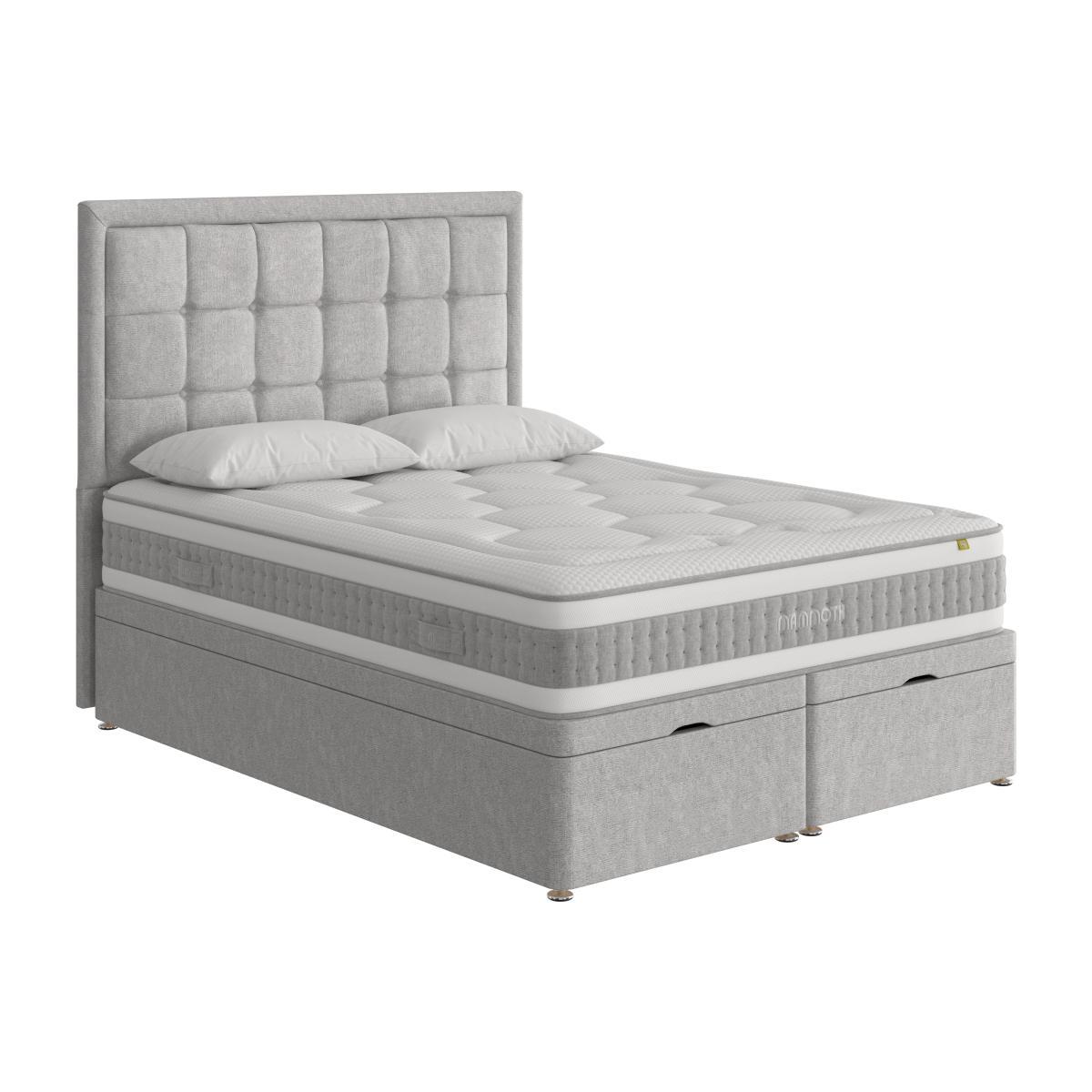Offering the perfect blend of cooling and cushioning Mammoth Medical Grade™ Foam with high-quality pocket spring support, the mattresses and divan sets in the Mammoth Prestige Pocket Plus 4000 range are designed to support the sleep and health needs of elite athletes – and anyone who demands a wonderful night’s sleep. Made in Britain exclusively for Furniture Village by Mammoth, this well-crafted collection offers a wide choice of mattresses, divan sets with optional storage drawers, and both side- and end-opening ottoman divan sets. Mattress comfort plus spacious storage – this Furniture Village-exclusive divan set has it all. And remember, Mammoth Medical Grade™ Foam is the choice of elite athletes for its ability to disperse heat and relieve pressure. Why you'll love it. Superior Mammoth ottoman divan set with Medical Grade™ Foam and pocket springs. Mammoth mattresses are the choice of the nation’s elite athletes. Cooler than memory foam, Medical Grade™ Foam is scientifically proven to improve sleep. Relieves pressures, absorbs motion and encourages spinal alignment. Features Mammoth’s PostureCell™ technology. Castellated mattress structure encourages air flow and disperses heat. With 4000 pocket springs in king size arranged in seven zones. Hypoallergenic. Platform-top base has end-opening ottoman storage space. Designed in partnership with the Chartered Society of Physiotherapy. Made in Britain exclusively for Furniture Village. What you need to know. Mattress type: Mammoth Medical Grade™ Foam and pocket spring. Depth: 29 cm. Firmness: Medium feel, although may feel firmer at first. Springs: 4000 pocket springs in king size. Pillow top: No. Fillings: 9 cm of Mammoth Medical Grade Foam with PostureCell™ comfort technology. Borders: Velvet central panel, loop stitching, tape edge on top and bottom. Cover: Polyester with natural fibres in upper surface. Requires turning: No. Base type: Platform top with end-opening ottoman storage. Sizes: Single, small double, double, king and super king. Mattress care: Air for 4 hours before using to remove any odour. Allow at least 4 hours for mattress to attain its full size. Indentations caused by settlement of fillings or body weight are normal and are not considered defects. If used on a slatted bed frame, slats must be no more than 7.5 cm apart. Spaces wider than this may cause excess dipping of the mattress and invalidate the guarantee. Always use a mattress protector. Rotate regularly. Divan base care: Take care when opening and closing the ottoman base and do not sit on the bed with the ottoman in the raised position. Clean upholstery weekly using a soft brush or vacuum with the curtain attachment. Professional cleaning advised for oil- and grease-based stains.