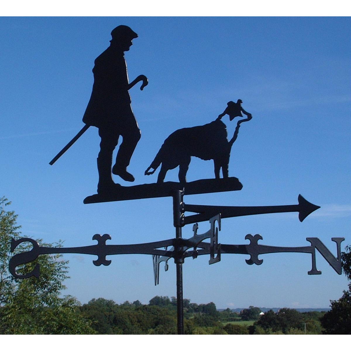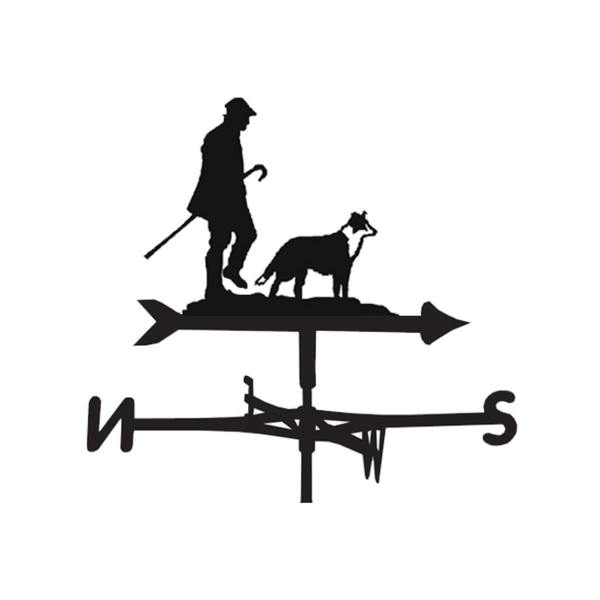 I love this dog-and-man weathervane for its charming, nostalgic appeal-perfect for adding character to both traditional and country-style exteriors. It works particularly well on cottage or farmhouse facades, where its whimsical silhouette can complement rustic, weathered finishes or classic brickwork. To style it effectively, consider placing it on a modest pitched roof or garden shed, allowing it to serve as a focal point without overwhelming the overall look. Pairing it with garden accessories like vintage planters or wooden furniture will enhance its quaint, timeless vibe. Practical tip: ensure it’s securely mounted, given its outdoor setting, so it can sway gracefully in the wind without issue.