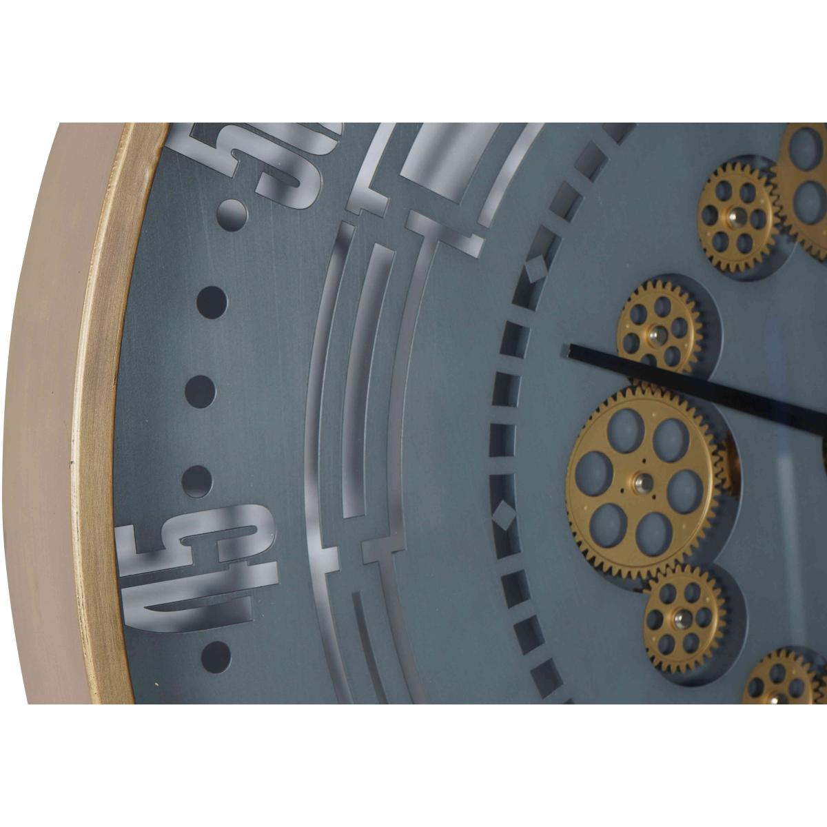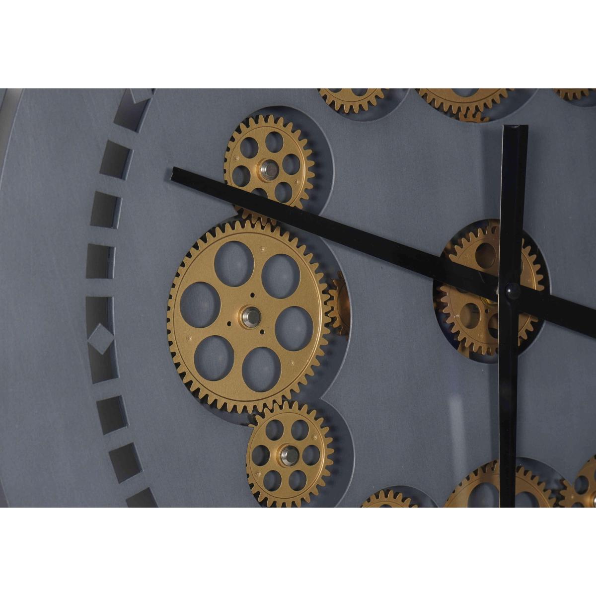 Innovative and creative, this industrial-style wall clock in grey and gold features mechanical cogs and precision-cut details. Why you'll love it Strikingly detailed wall clock with moving cogs. Industrial style. Deep circular frame and cogs have an antique gold finish. Precision-cut design details and numerals reveal the wall behind. Light grey face protected by glass for easy cleaning. This wall clock is part of the Furniture Village home accessories collection. What you need to know Made of iron. Requires 3 x AA batteries, not included. Batteries should be changed twice a year. For indoor use only. To clean, simply dust with a soft cloth. Avoid wax-based cleaning products. Do not spray glass cleaning products directly onto the clock face. Dimensions Diameter: 75 cm (30 in). Depth: 7 cm (3 in).