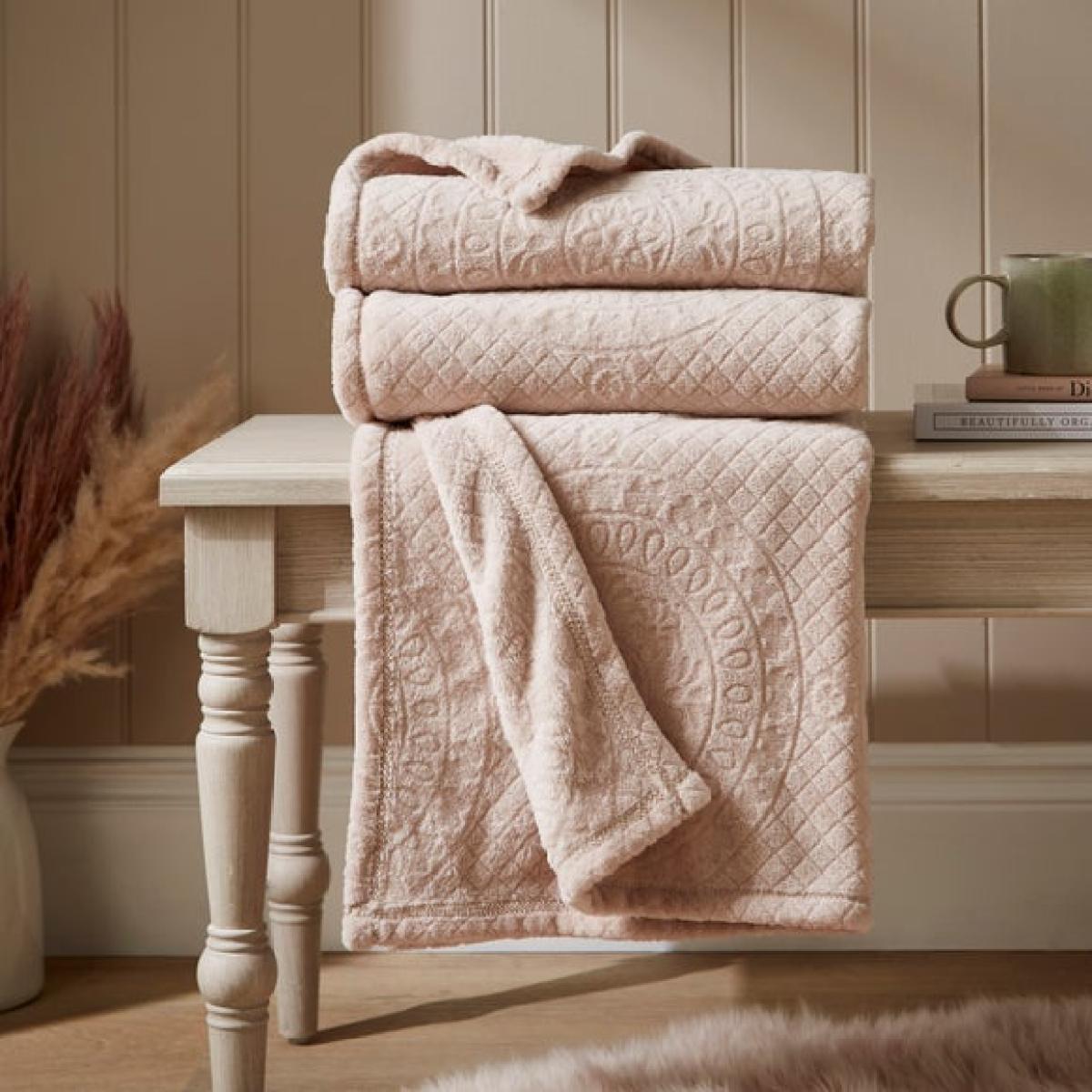 * Mandalay pattern * Choice of colours * Soft, plush fleece * Two sizes available Add warmth and texture to your space with the Mandalay Fleece Throw, available in soft mushroom or ivory tones. The embossed mandala pattern adds a real global style, and the plush fleece fabric offers an irresistibly cosy feel, perfect for curling up year-round. Choose from two sizes, ideal for draping over sofas, layering on beds or snuggling on the sofa. Finished with reinforced edges for long-lasting durability, and machine washable for easy care, it’s a stylish and practical addition to any room.