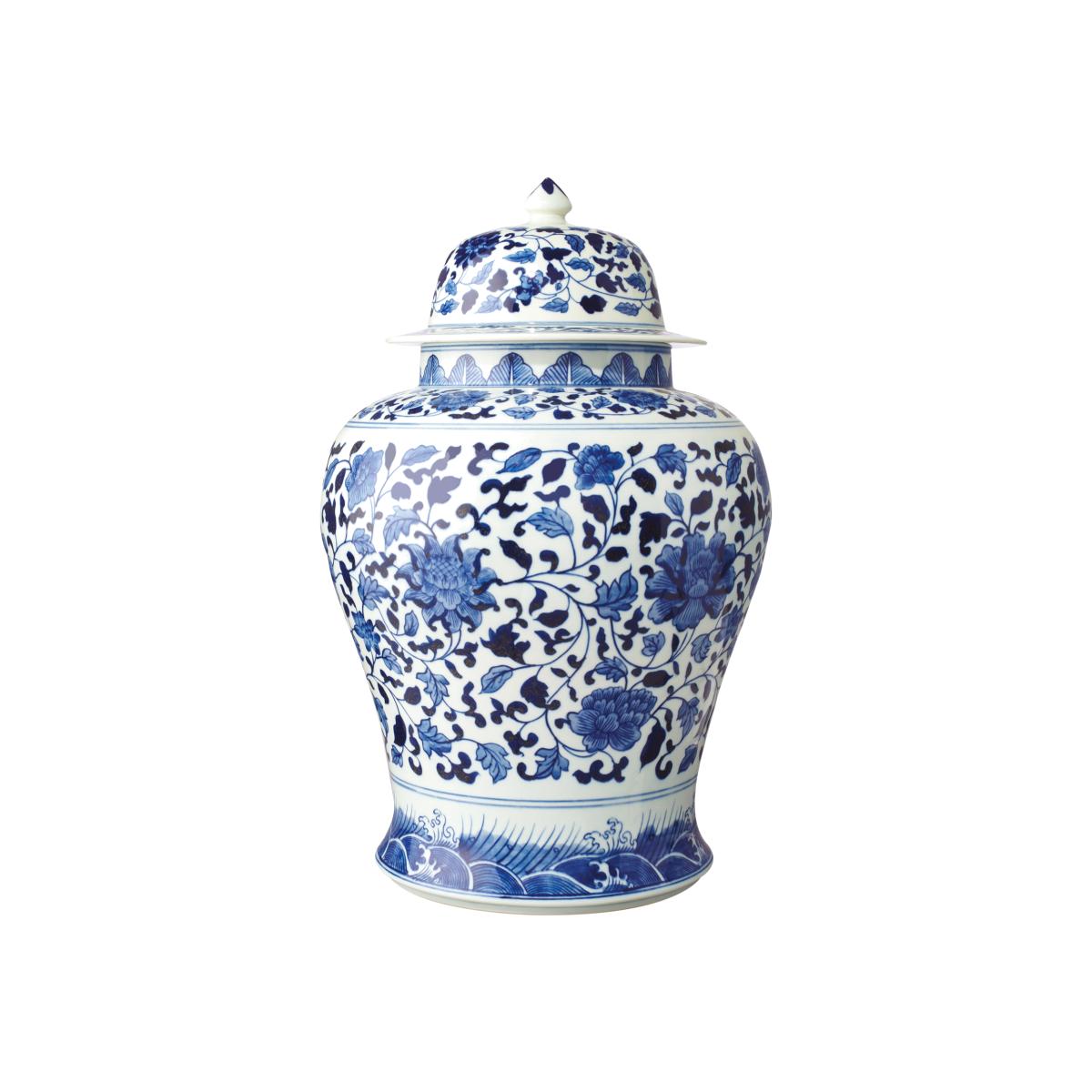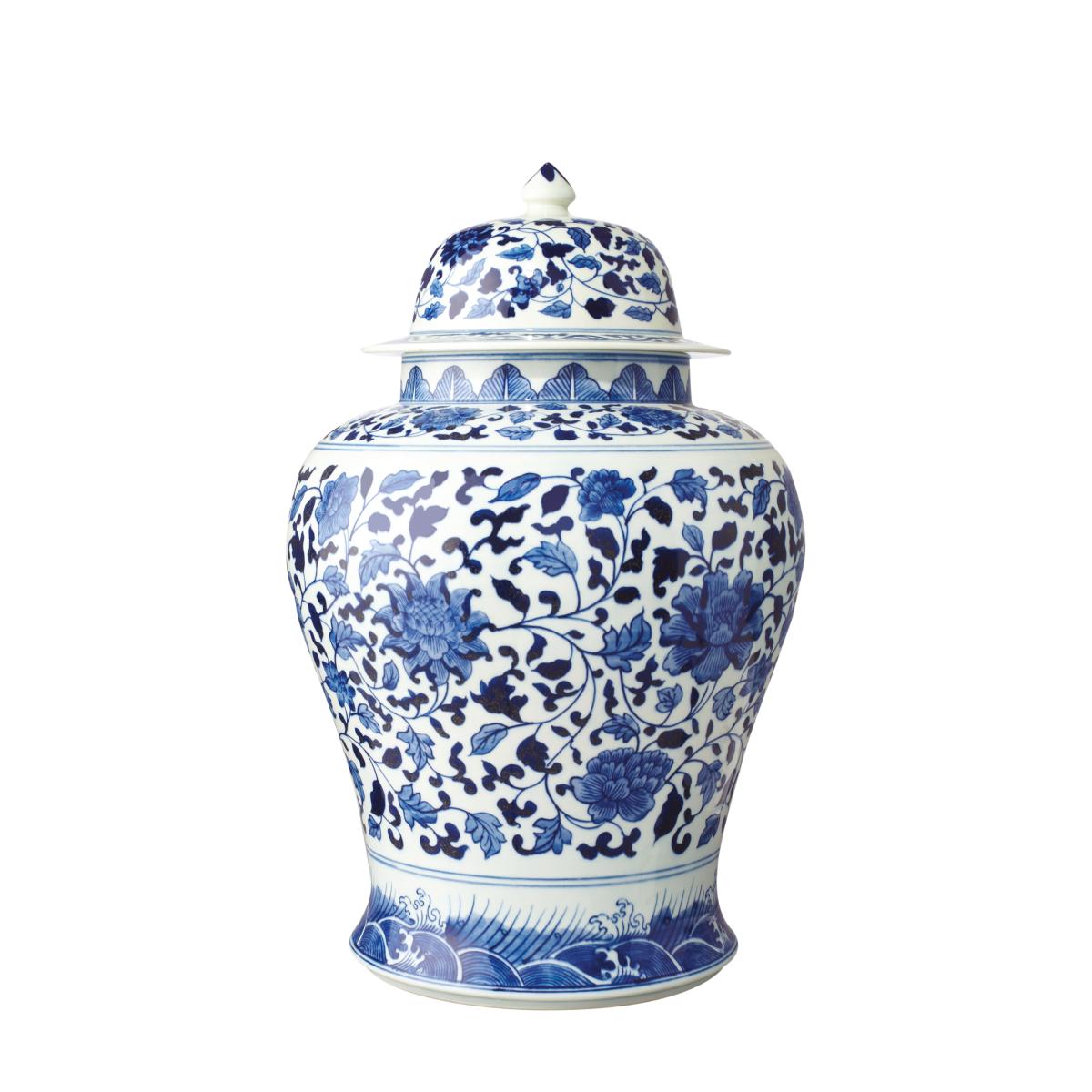 A lidded jar of impressive scale that will make a dramatic feature when displayed as a centrepiece or on a console table. Hand-painted with a traditional Chinese peony design.
