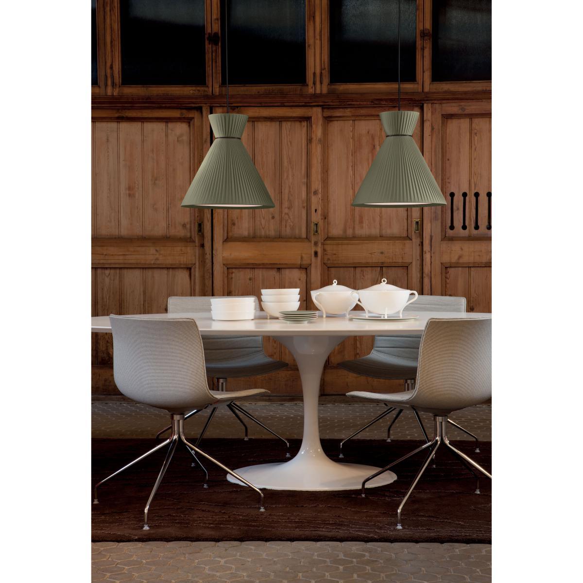 The incredibly elegant Mandarina pendant is decorated with a wonderful pleated fabric. The regular ripples which cross its ribbon fabric evoke a delicate pleated dress. Mandarina offers a wonderful interplay of shadows and light thanks to the different thicknesses of the fabric in the folds. The effect is splendid: vivid, vibrant, soft and warm, the light seems to come alive with movement. Mandarina is characterised by its pretty curved outline. Its narrow neck is highlighted by a fine ring which adorns it like a delicate jewel. The lampshade is enclosed below by a white polycarbonate diffuser-disk which ensures optimal lighting with no glare. Mandarina will elegantly blend into modern or traditional interiors and will be equally at home in private and public spaces!.