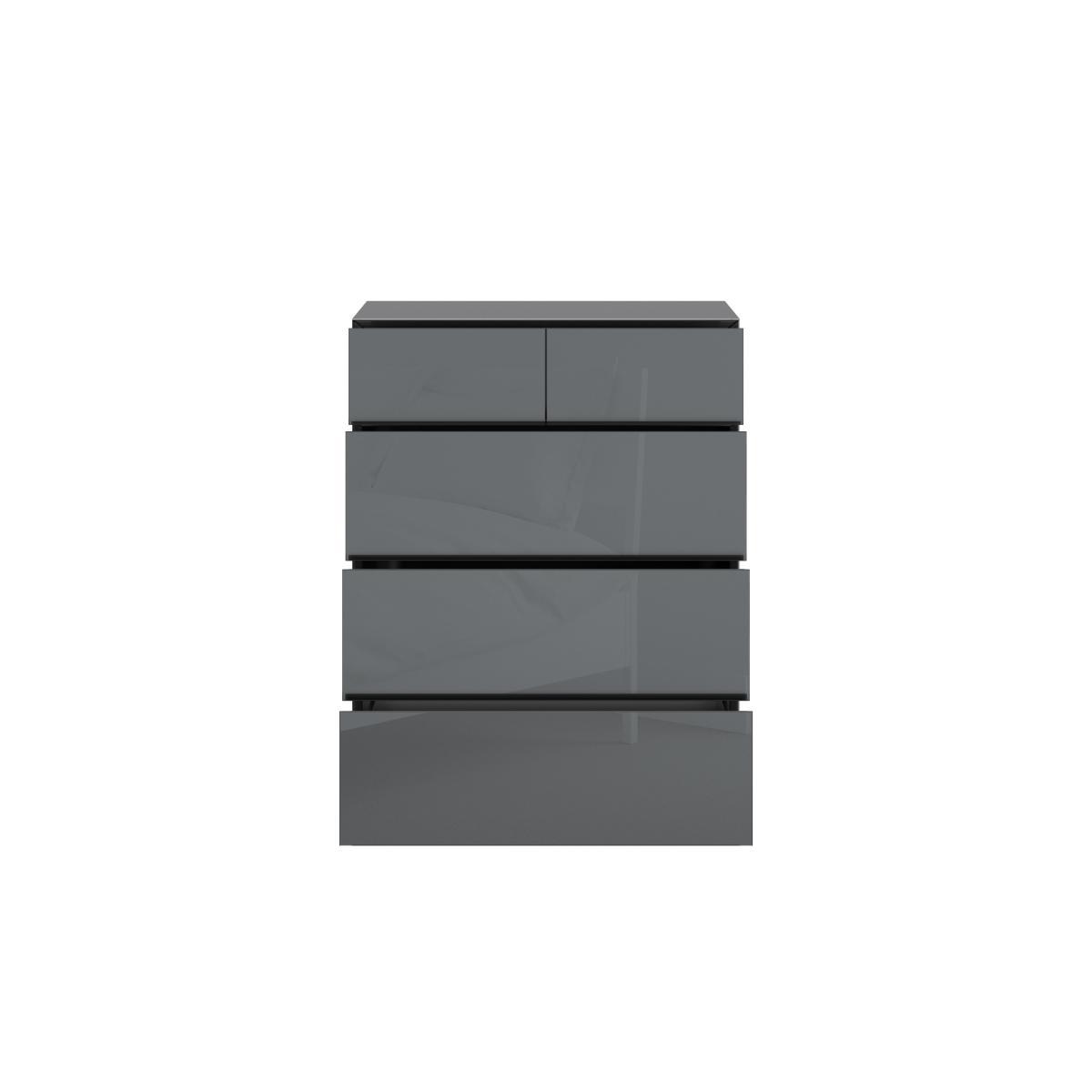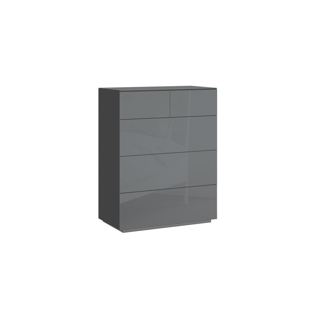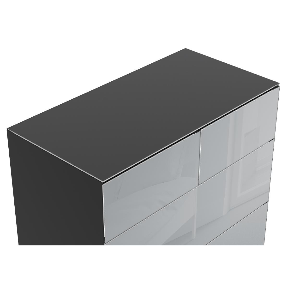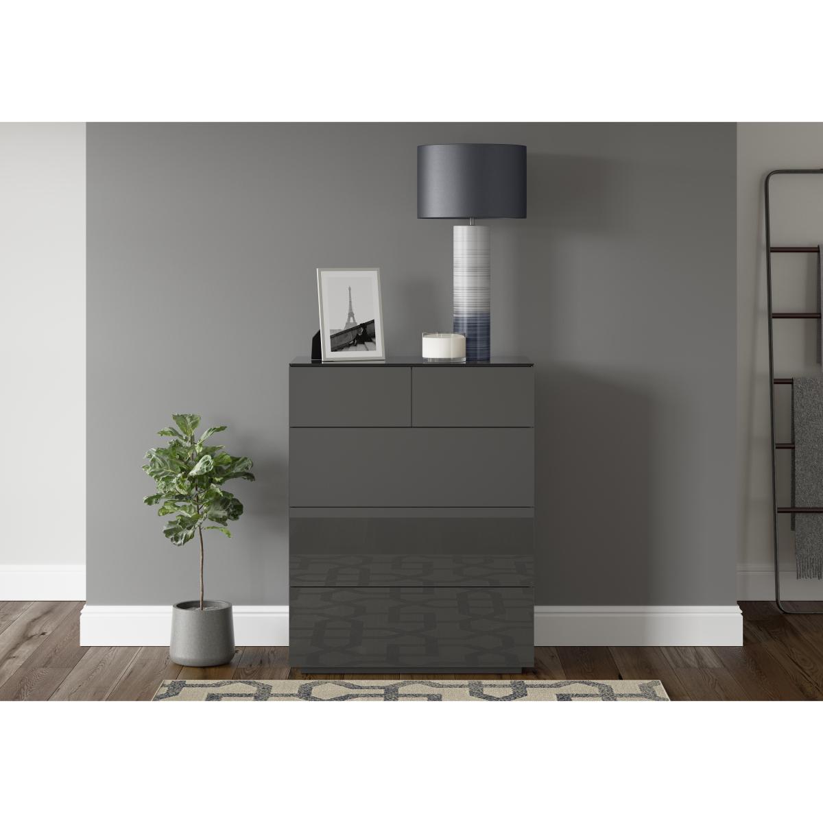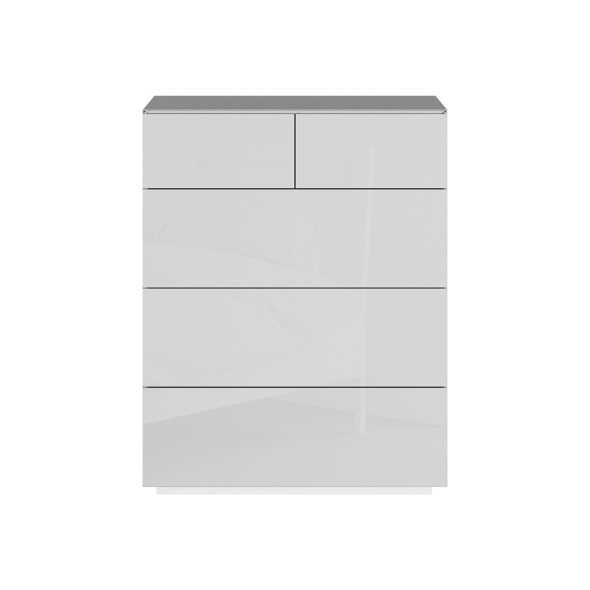Modern and luxurious, Mando glass bedroom furniture comes in white or grey colourways, coordinating perfectly with the Rauch Formes range. We love the clean silhouettes, push-to-open drawers and bevelled edges. One of the bedside cabinets even includes a hidden charger so you can power up your phone while you sleep. Choose Mando bedroom furniture for high-end designer style at an affordable price. Go for modern luxury, at an affordable price. This gorgeous glass chest of drawers has a sleek silhouette and five roomy push-to-open drawers. In white or grey. Why you'll love it. Glass chest of drawers with luxurious modern appeal. Useful storage in 5 roomy push-to-open drawers. 2 smaller drawers above, 3 wide drawers below. Sleek silhouette, no drawer handles. In a choice of white and grey. The colours coordinate with the Rauch Formes range. Great value price for designer style. A Furniture Village exclusive. What you need to know. Arrives fully assembled. MDF and glass construction. The glass has bevelled edges. 5 push-to-open drawers with smooth runners. Care for glass by wiping with a damp, microfibre cloth to remove finger marks. Only use furniture polish and cleaning materials suitable for glass. Avoid abrasive cleaners. Do not place heavy items on glass. While glass is water resistant, using coasters is recommended. Glass can scratch, so take care when placing items on a glass surface. For deep scratches, seek professional advice. Part of the Mando bedroom range. WARNING!. Furniture can tip over unexpectedly and cause injury. This item should be fixed to a wall using the anti-tip kit provided with the furniture. Be sure to use the correct wall fixings suitable for the walls in your home.