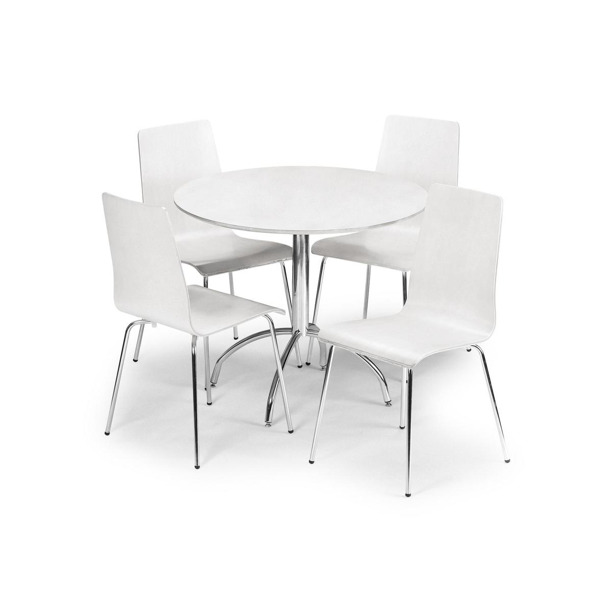 The Mandy Table in White makes a great addition to even the smallest dining room. Compact and attractive with slim chrome legs, it will complement any modern living space. The white finish goes with white or coloured furniture, making this table highly versatile. Please note: Picture for illustrative puproses only. Chairs not included. Please note, unfortunately we cannot deliver this item to the Channel Islands.