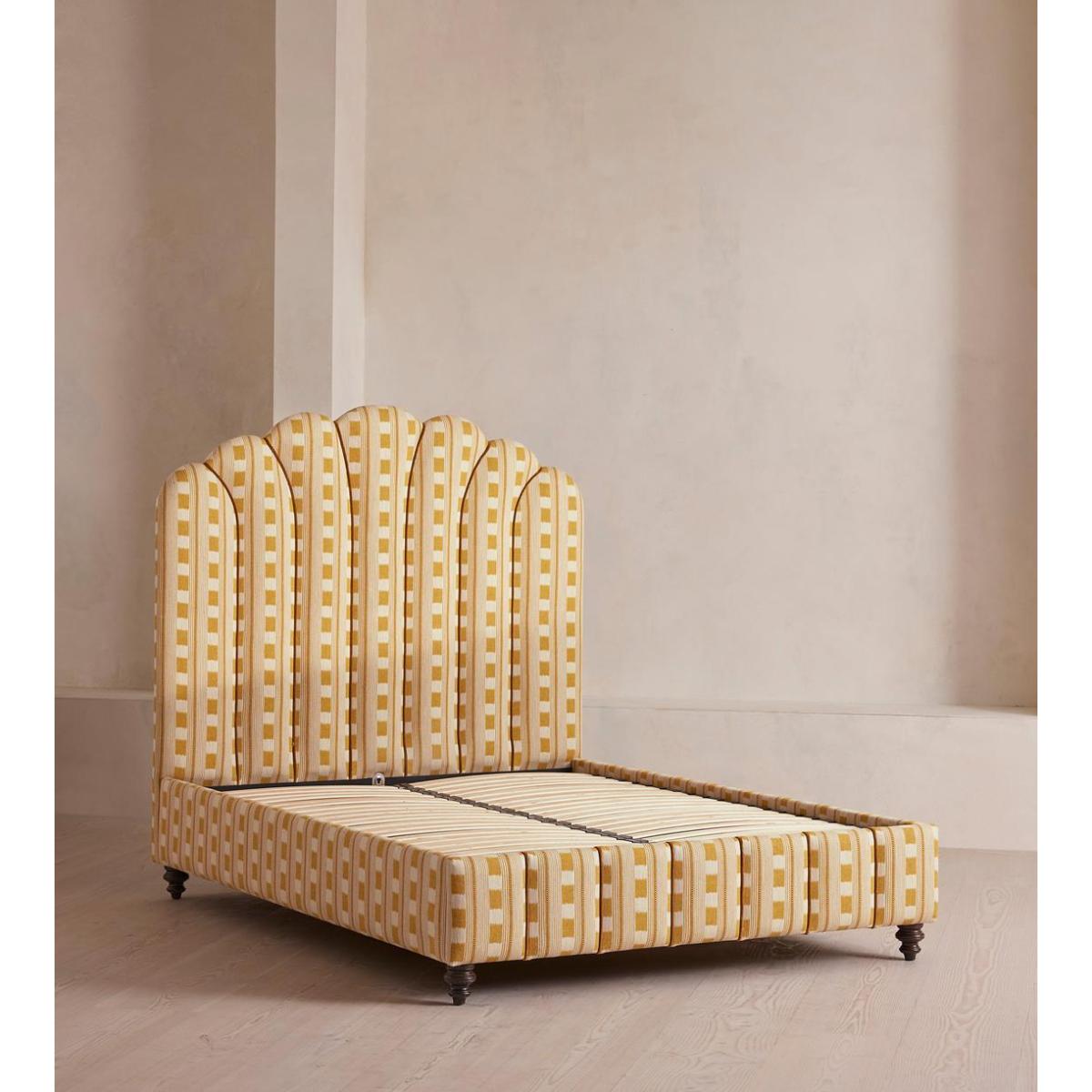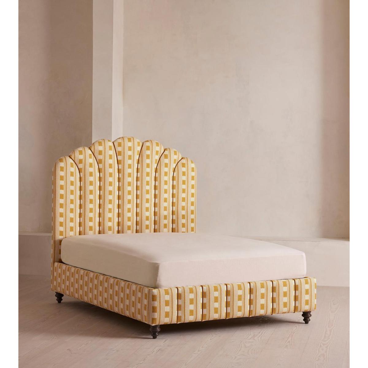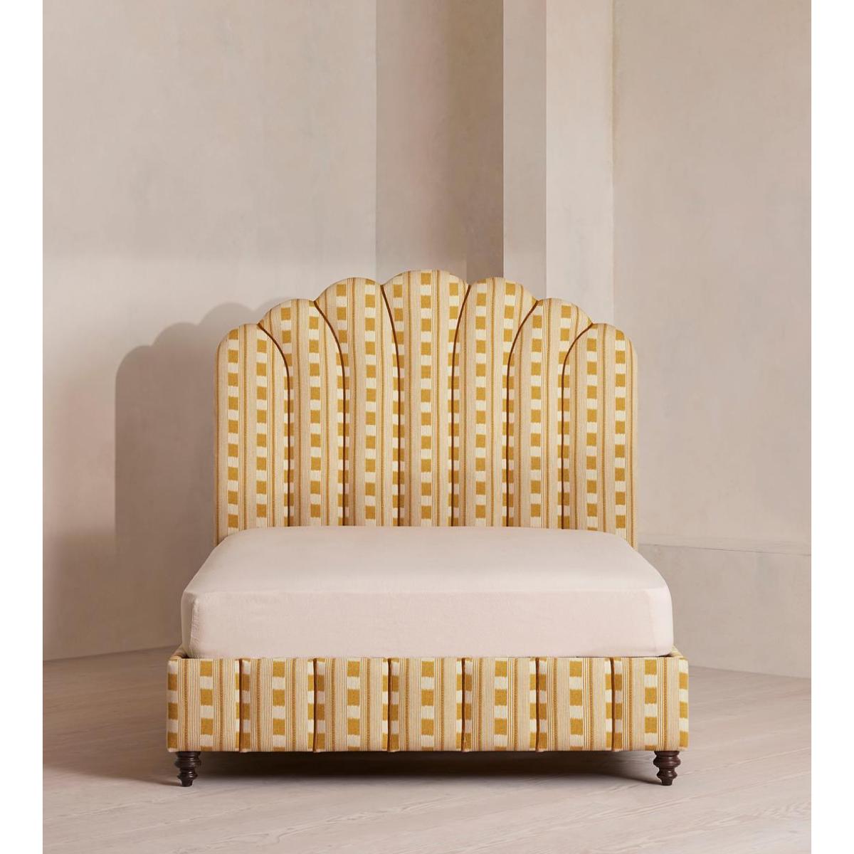An Art Deco-inspired fan headboard with piping detail characterises our Manette bed to create a focal point in your own bedroom. Handmade in the UK by skilled craftspeople, this interpretation showcases upholstery in Kit Kemp's 'Lost & Found' fabric, designed in collaboration with Christopher Farr. The pattern features a repetition of dotted stripes and squares in a warm lemon shade. Resting on turned hardwood feet, this style sits low to the floor for ease and comfort. Emperor bed Art Deco-inspired fan headboard Piping detail Upholstered in 'Lost & Found' fabric by Kit Kemp and Christopher Farr Available in other colours and fabrics Dark stained and turned hardwood feet Pair with our Hypnos Emperor Mattress Handcrafted in the UK Inspired by Kettner's