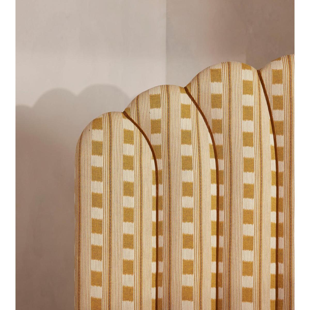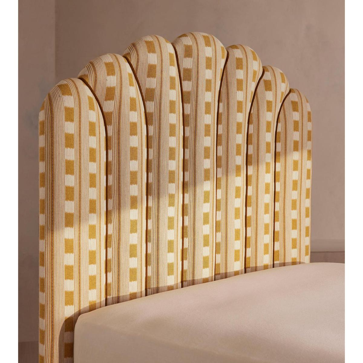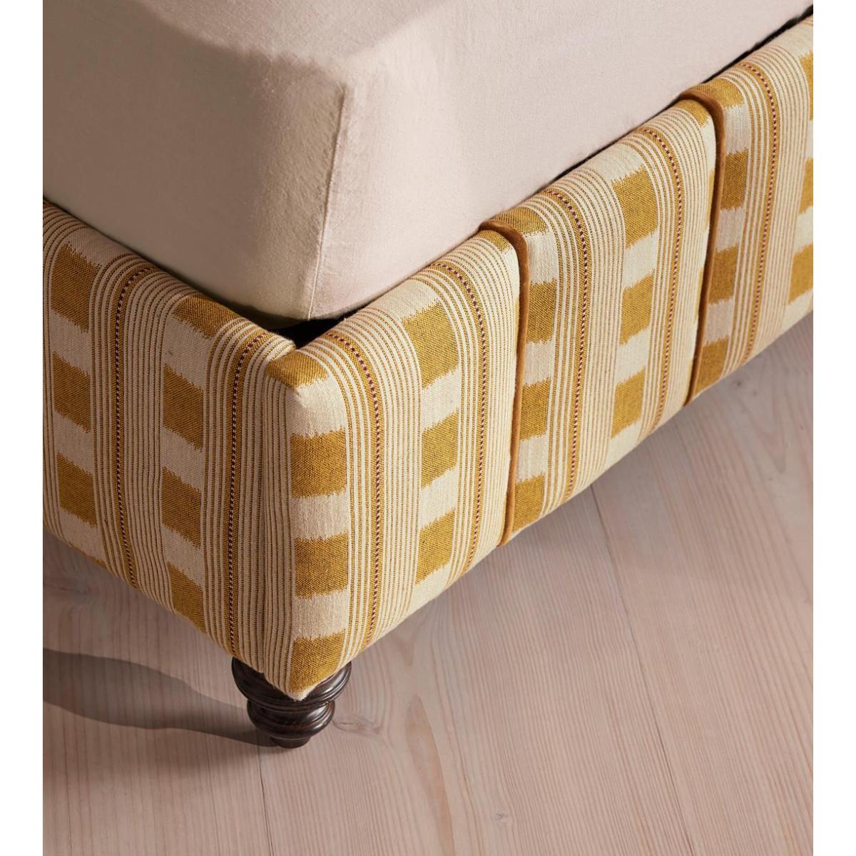 An Art Deco-inspired fan headboard with piping detail characterises our Manette bed to create a focal point in your own bedroom. Handmade in the UK by skilled craftspeople, this interpretation showcases upholstery in Kit Kemp's 'Lost & Found' fabric, designed in collaboration with Christopher Farr. The pattern features a repetition of dotted stripes and squares in a warm lemon shade. Resting on turned hardwood feet, this style sits low to the floor for ease and comfort. Emperor bed Art Deco-inspired fan headboard Piping detail Upholstered in 'Lost & Found' fabric by Kit Kemp and Christopher Farr Available in other colours and fabrics Dark stained and turned hardwood feet Pair with our Hypnos Emperor Mattress Handcrafted in the UK Inspired by Kettner's