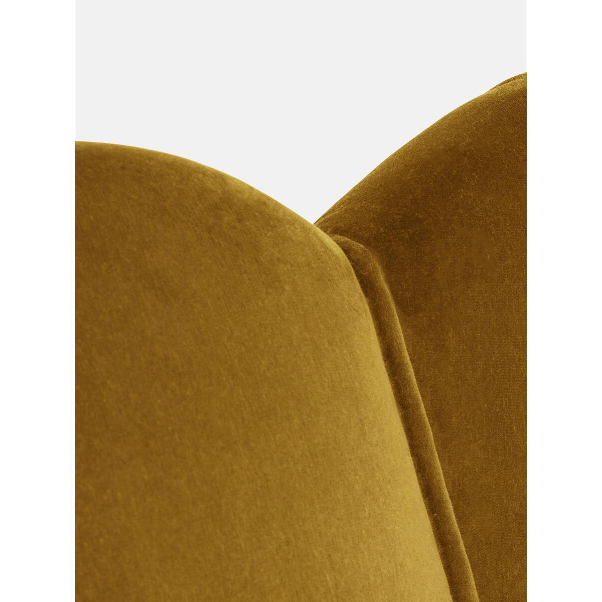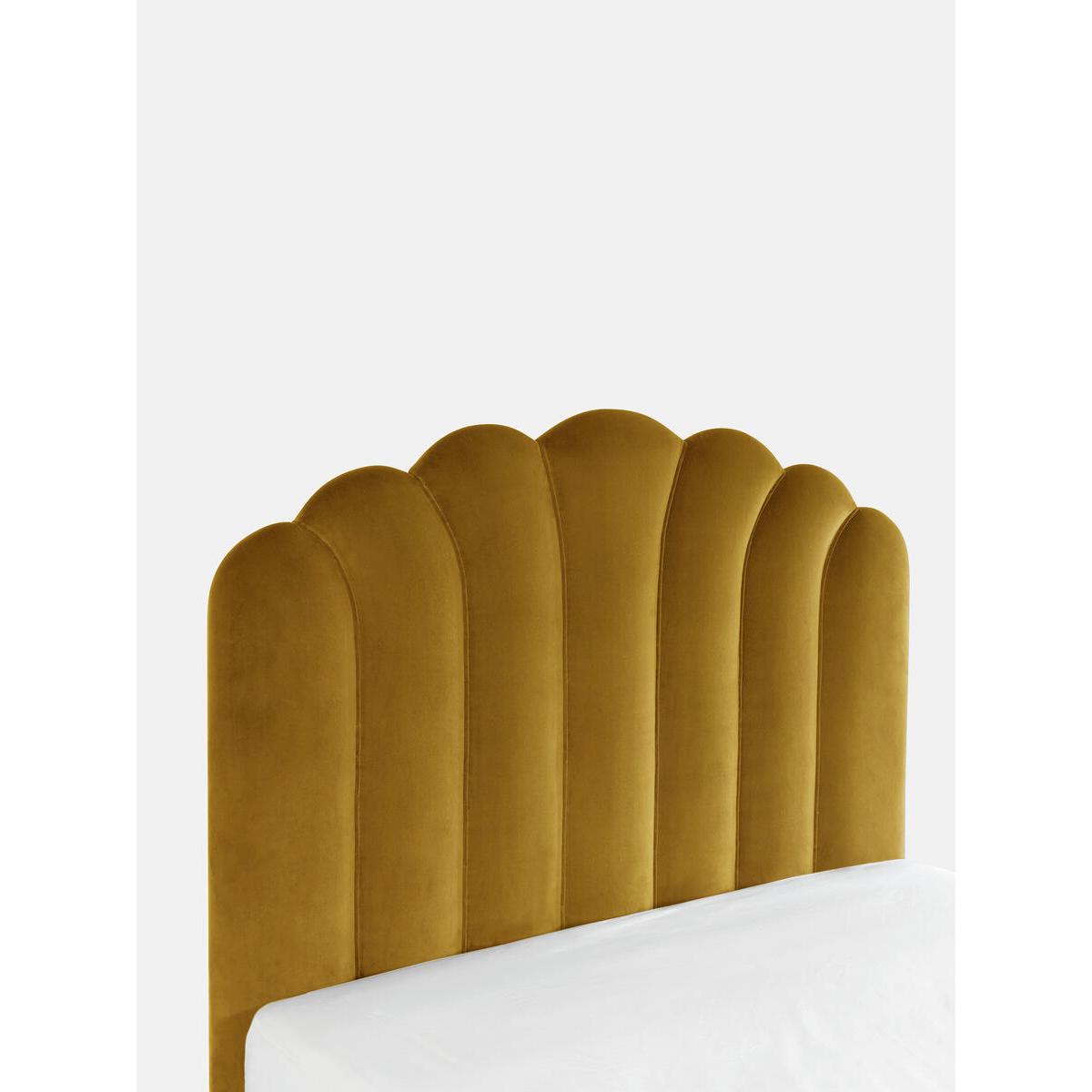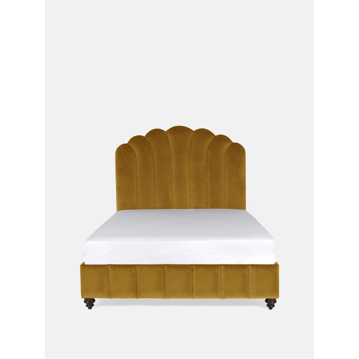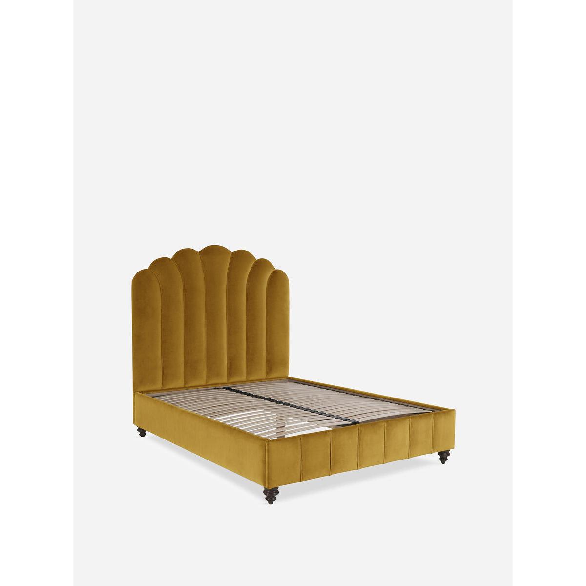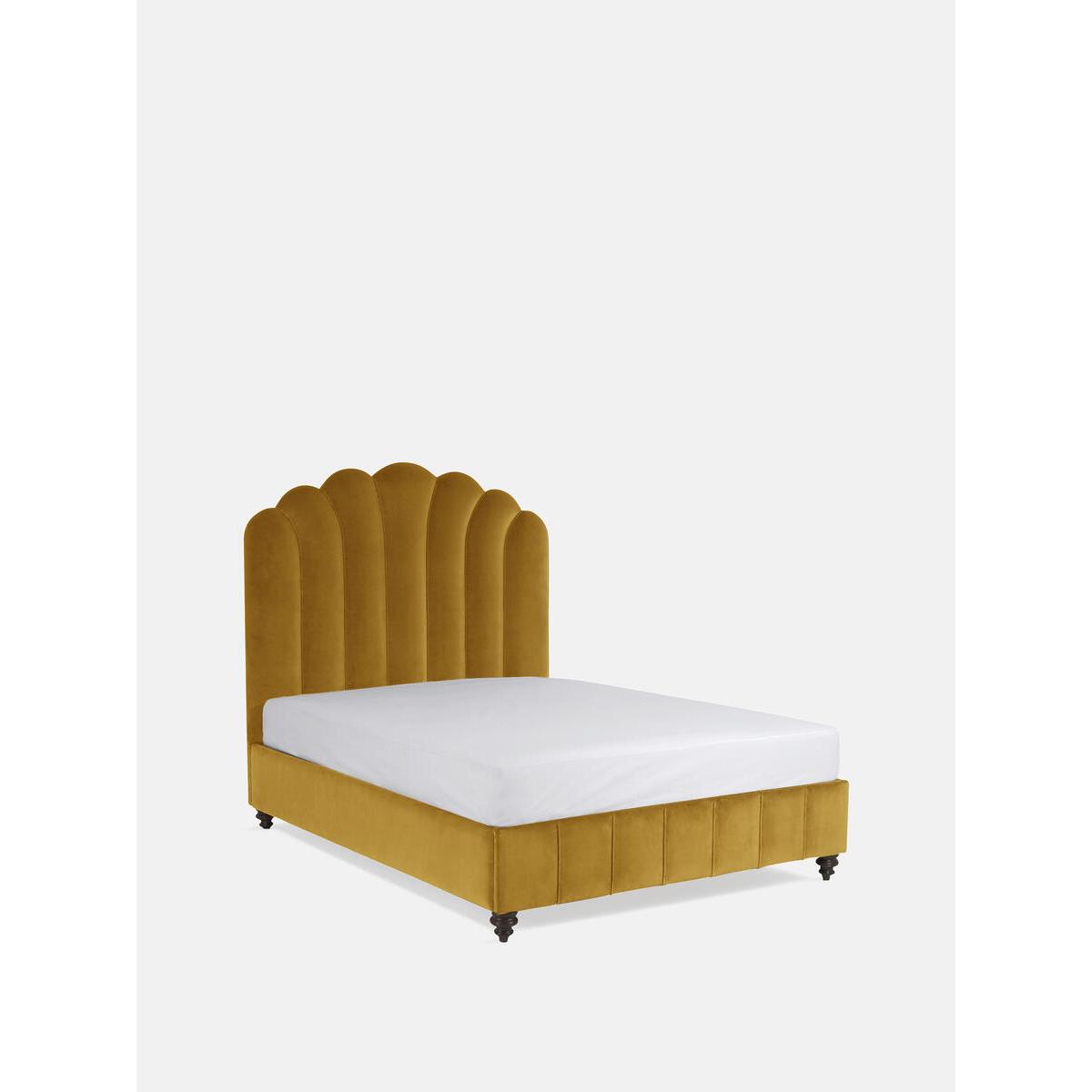 I love this bed because of its luxurious velvet finish and the bold ochre colour, which instantly elevates any bedroom. The scalloped, upholstered headboard adds a touch of elegance while maintaining a modern feel. It works exceptionally well in eclectic, contemporary, or vintage-inspired interiors, especially when paired with muted or neutral tones for a sophisticated look. Practical styling tips include layering your bedding with textured throws and cushions to soften the bold colour, and pairing it with neutral nightstands to let the bed be the statement piece. Its size makes it ideal for spacious rooms, allowing for plenty of room to experiment with colour and textiles around it.