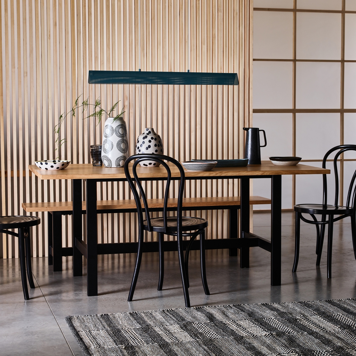 Inspired by industrial designs, the Manford solid oak dining table with black metal frame is strong and stable with clean, crisp lines. Made in Vietnam, the solid oak top showcases the natural beauty of the grain and is finished with a hardwearing matt lacquer for protection. Its powder coated metal legs add a contemporary finish. A co-ordinating Manford dining bench is also available to create a stylish, streamlined look.