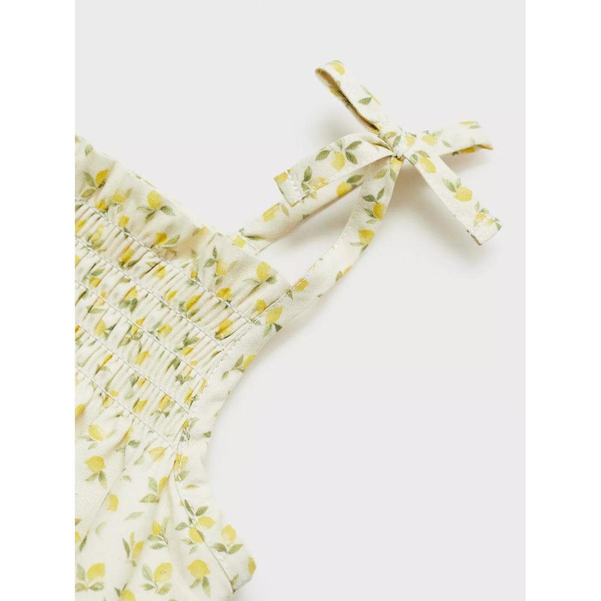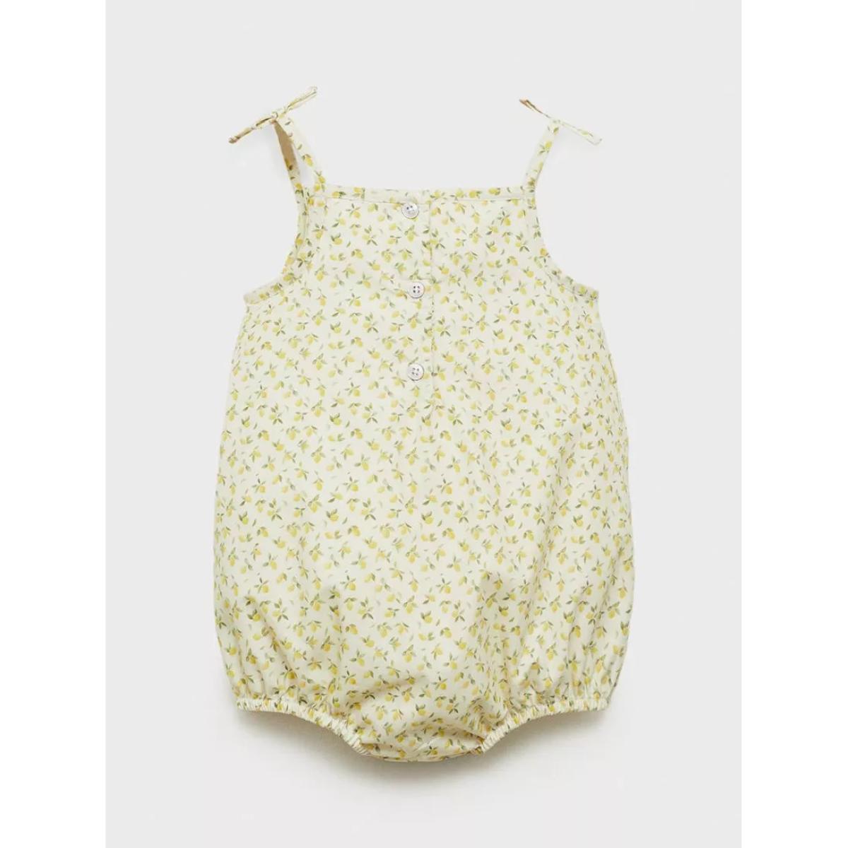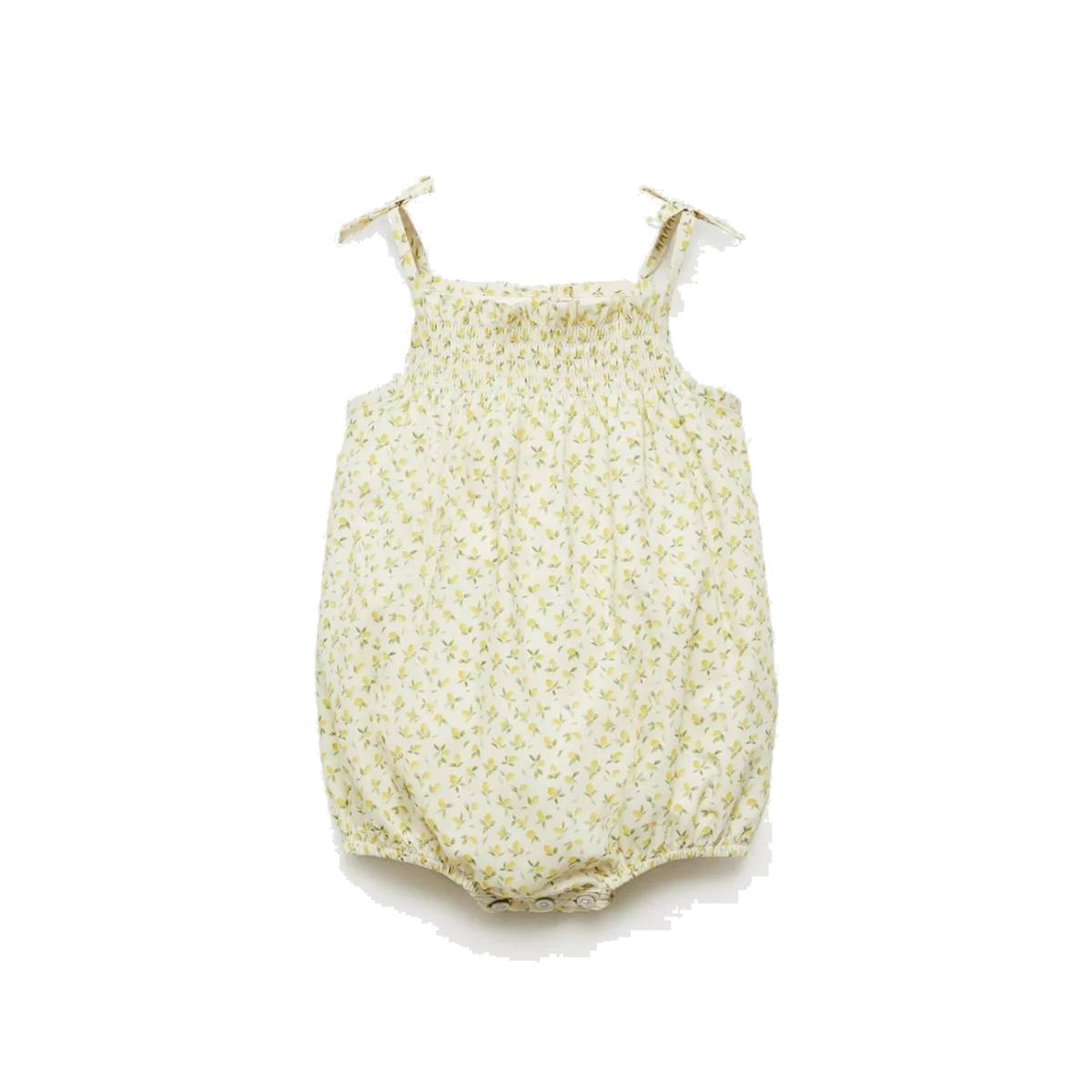 Ditsy print romper made in 100% cotton fabric with press stud fastenings for easy dressing. Includes: spaghetti straps, inner lining, honeycomb patterned detailing and a decorative bow finish.
