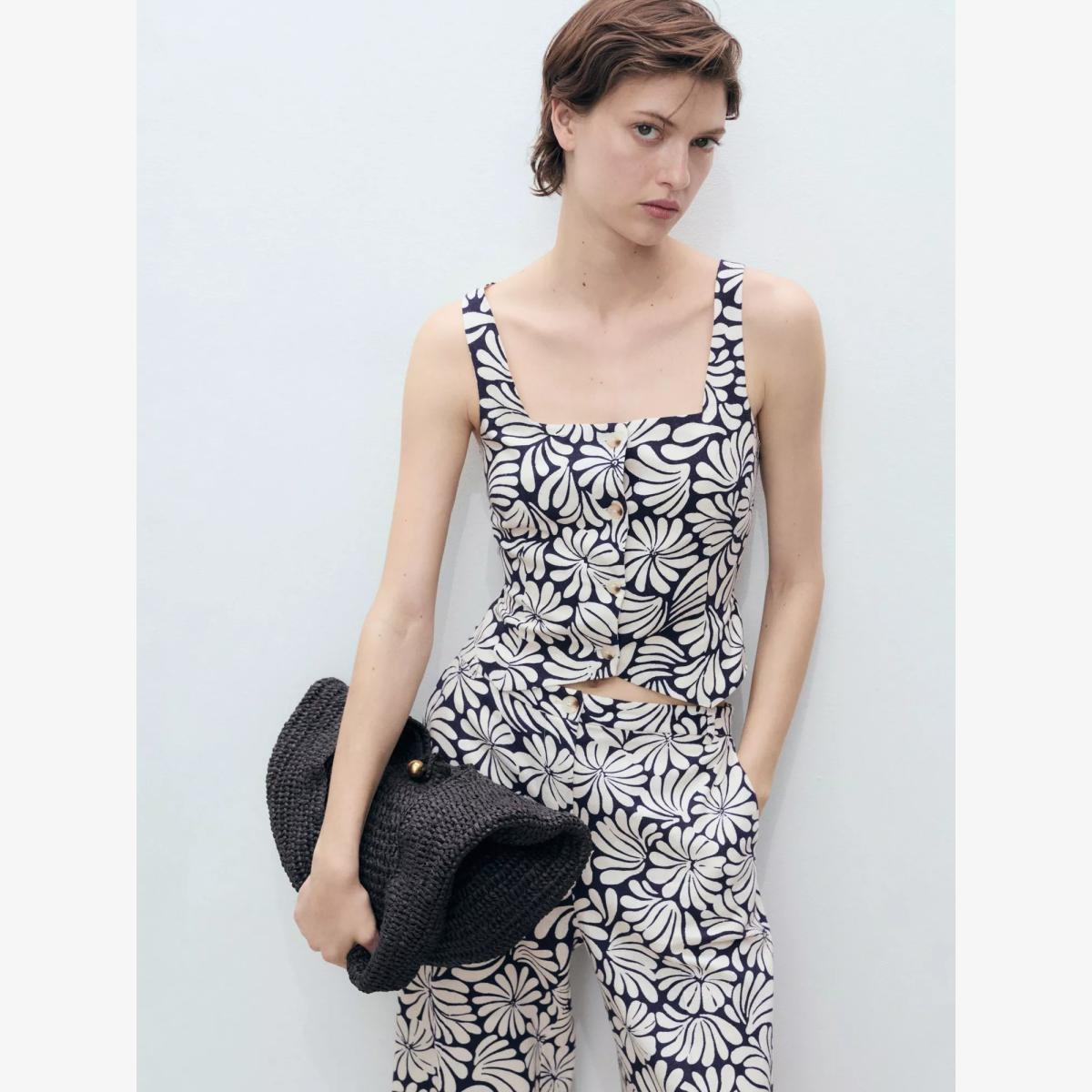 Mango’s linen-blend tank top offers cool comfort and effortless style for summer days. Its floral pattern and cropped design make it perfect for outings or lazy afternoons. Clever details like a square neckline and button fastening bring a fresh twist to a timeless piece.