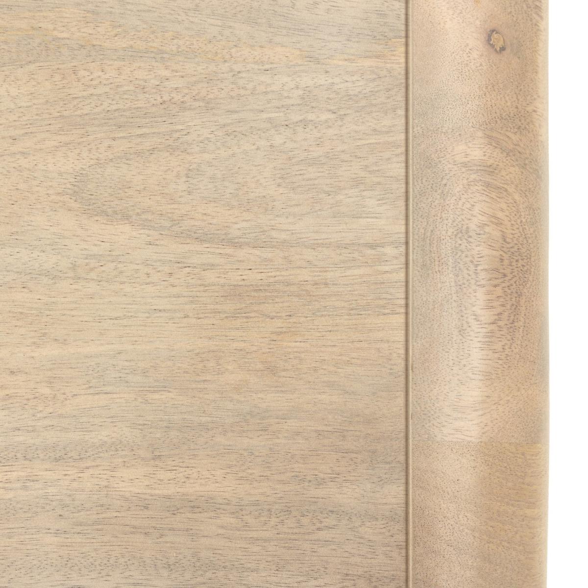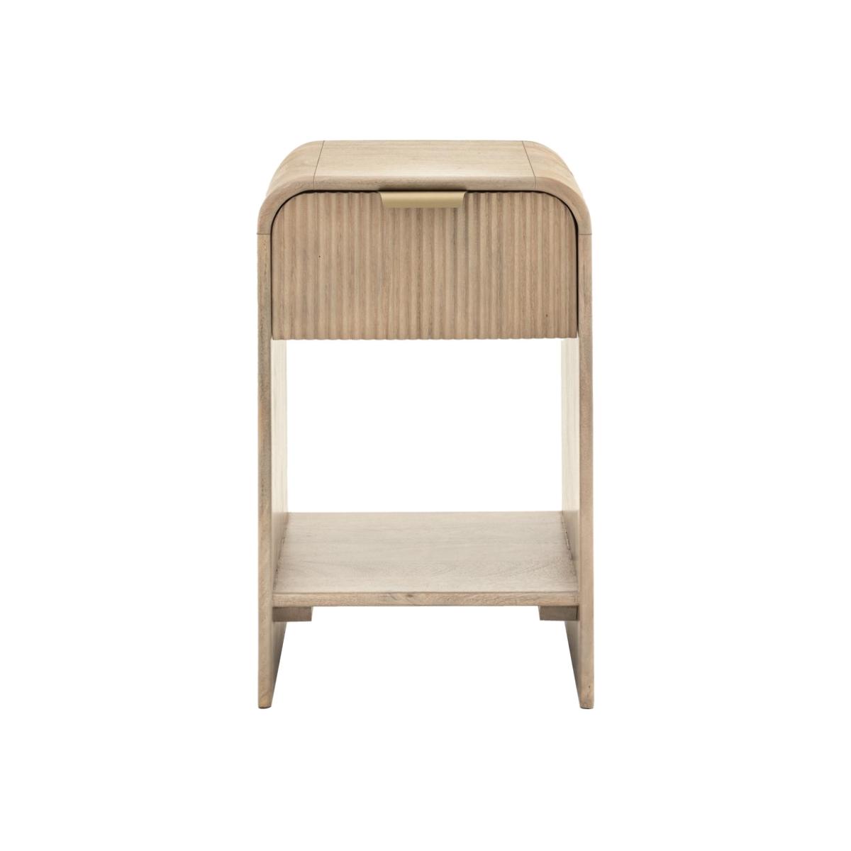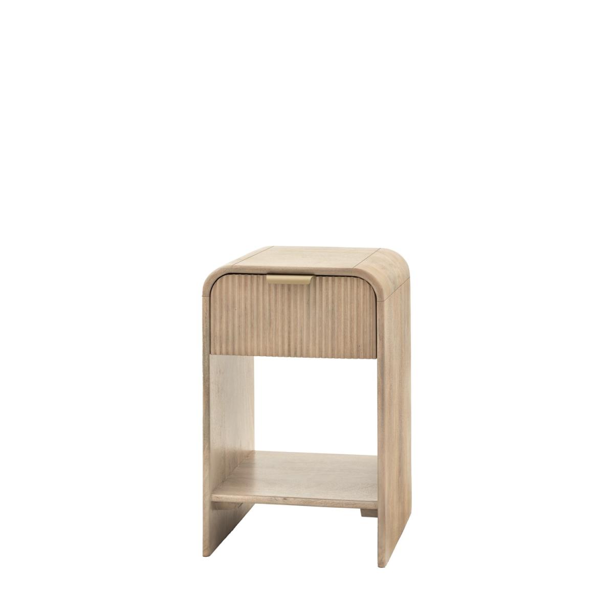 The soft, rounded edges create a sleek and contemporary aesthetic, adding a touch of sophistication to your bedroom. The textured fluted detailing on the drawer elevates the overall design, bringing depth and character to this bedside table. This stylish feature enhances modern and classic interiors alike. Designed to keep your bedside essentials neatly organized, the roomy drawer is perfect for storing everything from books and chargers to personal items, keeping your space clutter-free. The additional lower shelf provides even more storage space for decorative accents, bedtime reads, or even a small storage basket, allowing for both function and style. Crafted from high-quality wood, this bedside table is built to last. The strong frame provides excellent stability, making it a reliable addition to your bedroom for years to come. Upgrade your bedroom with this sophisticated bedside table, combining form and function in perfect harmony. The beautifully curved design and fluted drawer bring a refined touch, while the spacious storage options keep your nighttime essentials organized. Whether placed beside your bed or used as an accent table, this piece enhances any bedroom with its timeless charm. Dimensions: H55 x W35 x D40 cm Package dimensions: H66 x W50 x D45 cm Product weight: 9.46 kg Material: Mango wood and brass Finish: Mango Wood Assembly required: No Due to the nature of the natural wood, each piece will be unique due to the variation of the real wood grain.