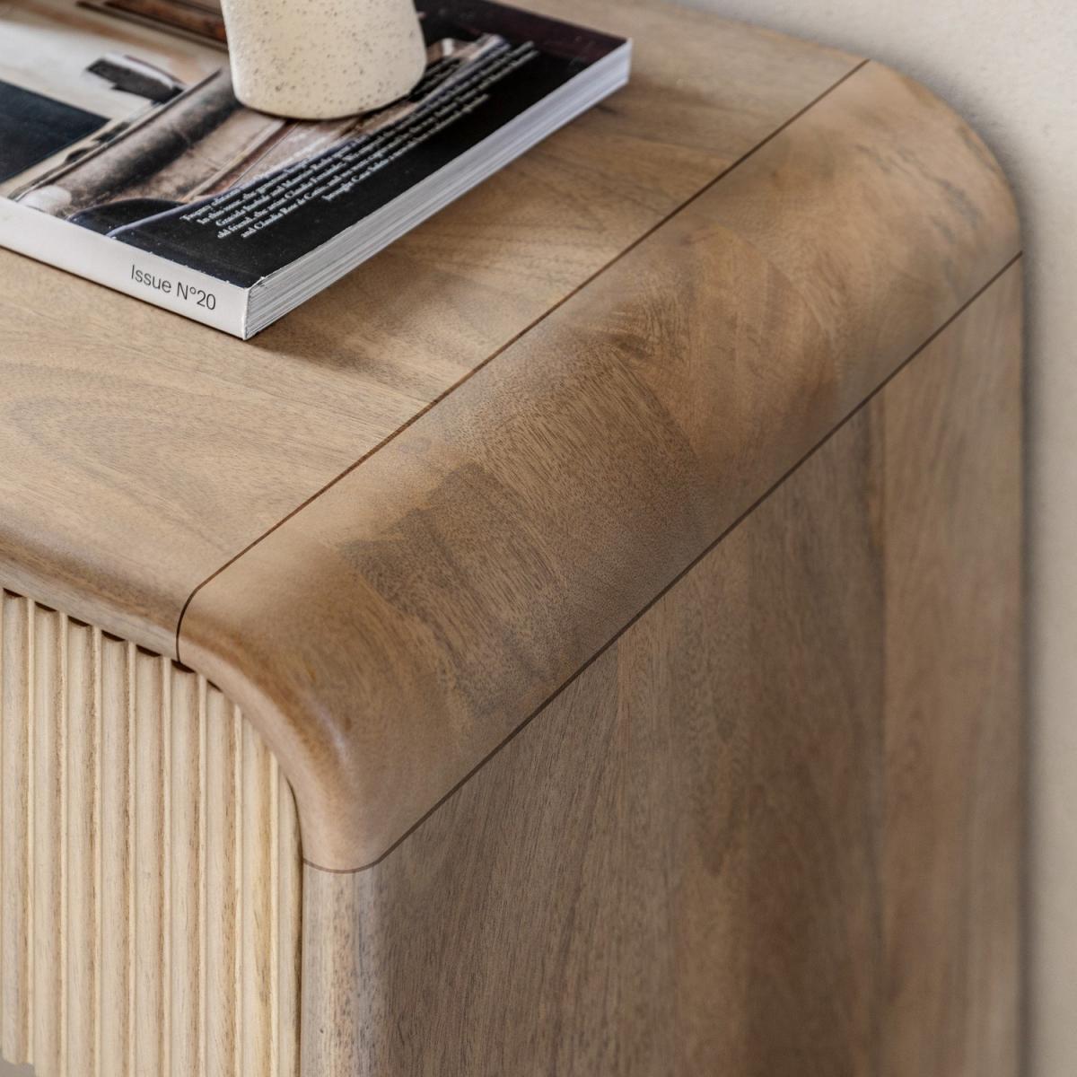 The softly rounded edges give this console table a refined and contemporary feel, adding a sleek and sophisticated touch to any space while ensuring a smooth, seamless finish. The beautifully detailed fluted drawers create a stunning focal point, adding depth and character to the design. Designed for practicality, the two drawers offer ample space to store small essentials such as keys, mail, stationery, or everyday necessities, keeping your space neat and clutter-free. The spacious bottom shelf provides the perfect place for books, baskets, or decorative accessories, offering both style and functionality while keeping items easily accessible. Whether placed in an entryway, hallway, or living room, this console table fits effortlessly into various spaces, making it a stylish and practical storage solution for any home. This 2-drawer console table combines stylish design with practical storage, making it an ideal addition to any entryway, living room, or hallway. Its curved top and fluted drawer fronts add a contemporary touch, while the spacious drawers and open shelf provide essential storage. Whether used as a hallway organizer or a stylish display table, this piece enhances any home with its elegance and versatility. Dimensions: H80 x W110 x D38 cm Package dimensions: H89 x W118 x D45 cm Product weight: 30.82 kg Material: Mango wood and brass Finish: Mango Wood Assembly required: No Due to the nature of the natural wood, each piece will be unique due to the variation of the real wood grain.