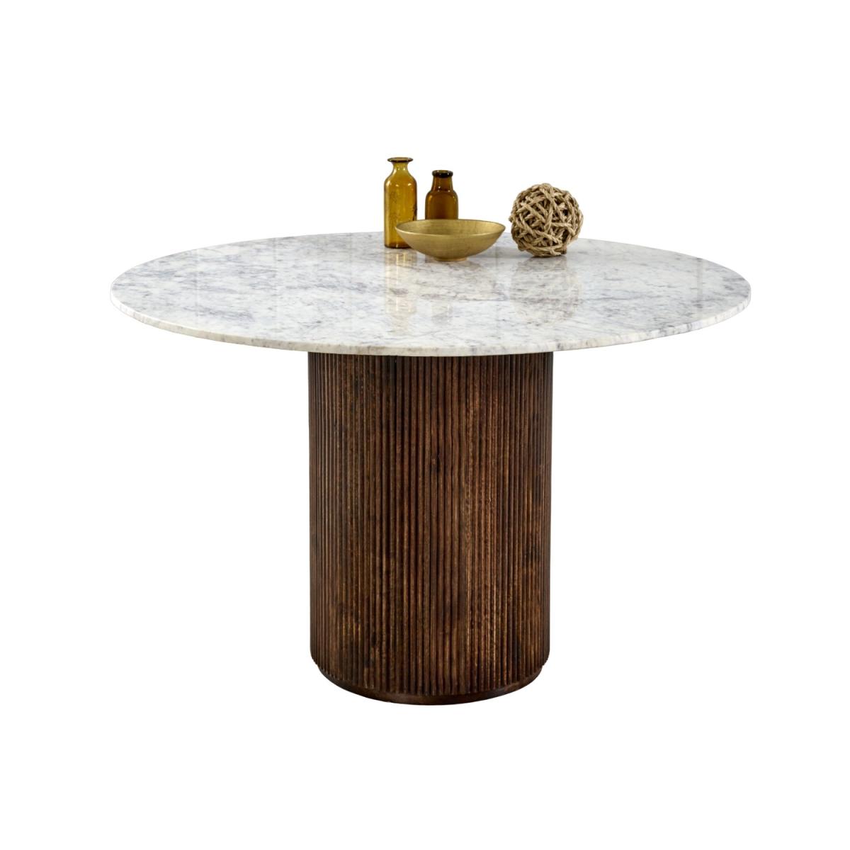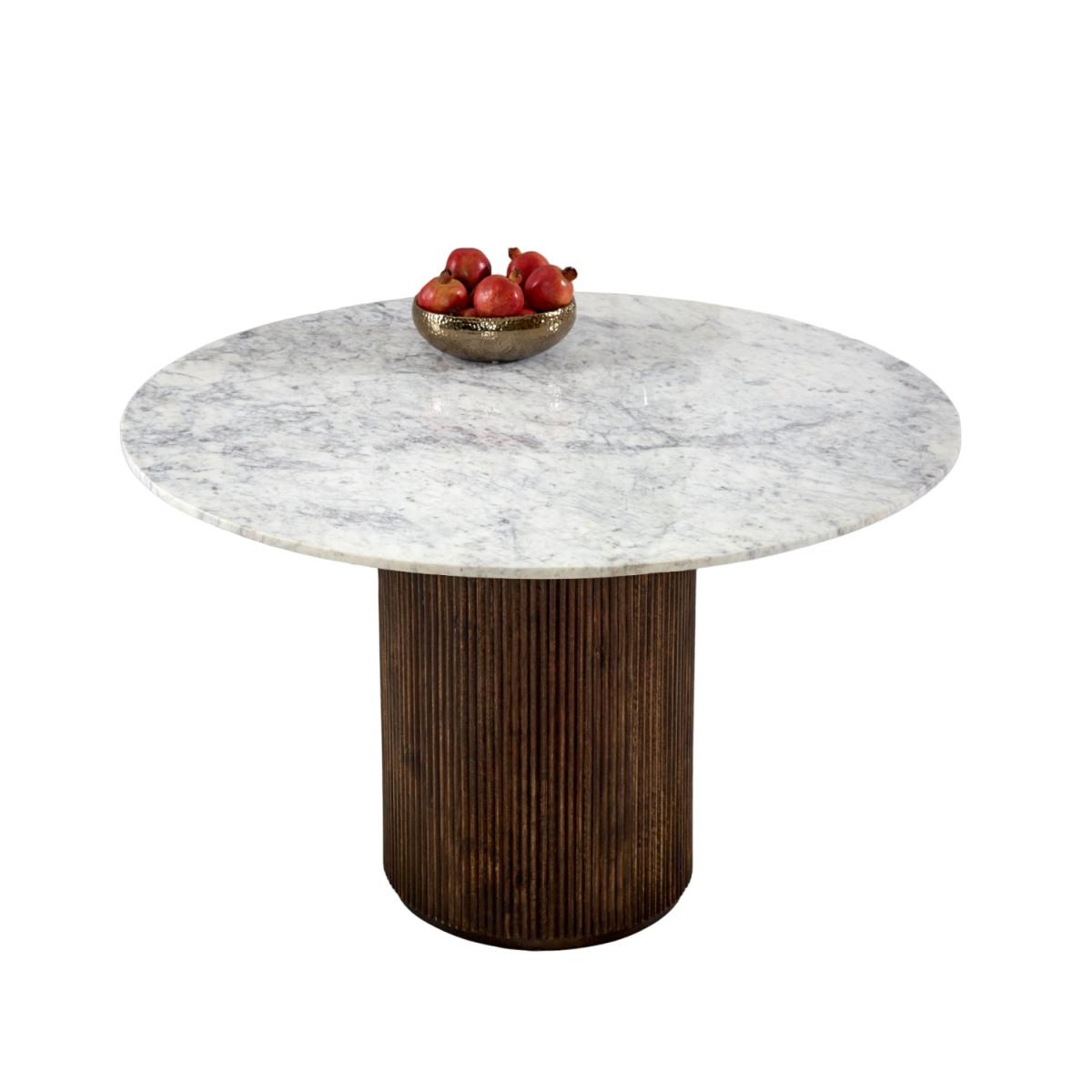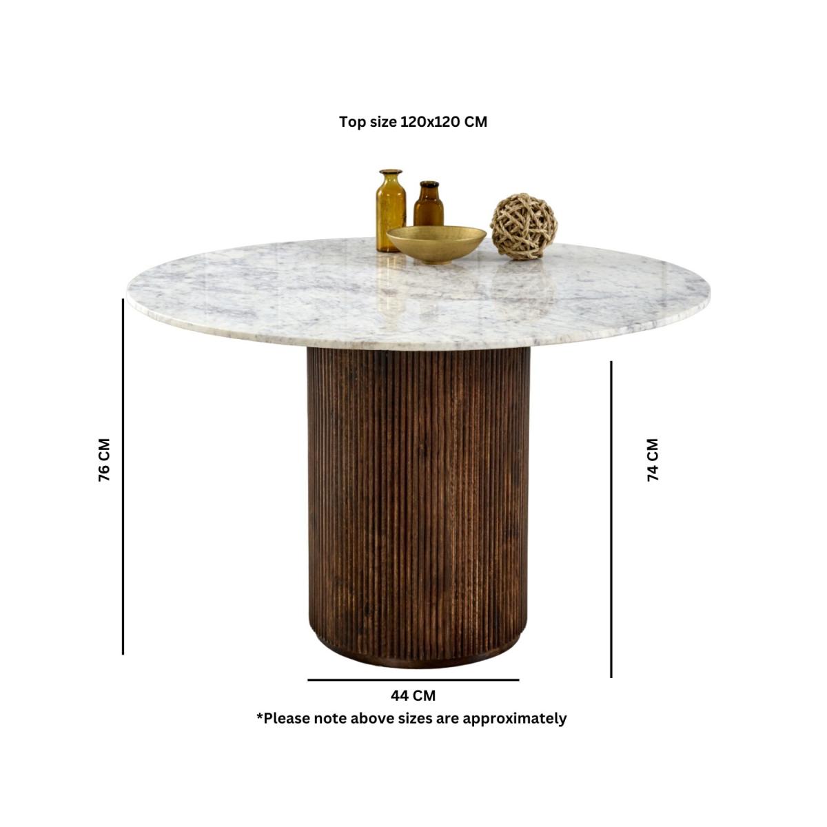 Dimensions:W120 x D120 x H76 cm This round dining table is the smaller version in this range and has the matching coffee table available which would be perfect for a lounge / diner. The stunning simplicity of the natural marble with the fluted wooden pedestal are exquisite and will certainly be a statement piece in your home. Completely handmade by our skilled craftsmen in India using eco friendly materials. Made from 100% mango wood and natural marble. Features: Mango wood Natural marble Wooden pedestal Matching items available Some assembly required