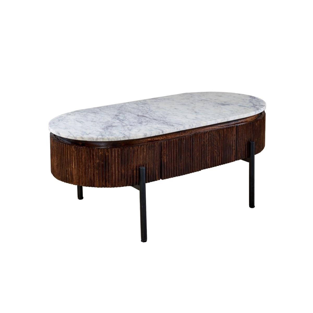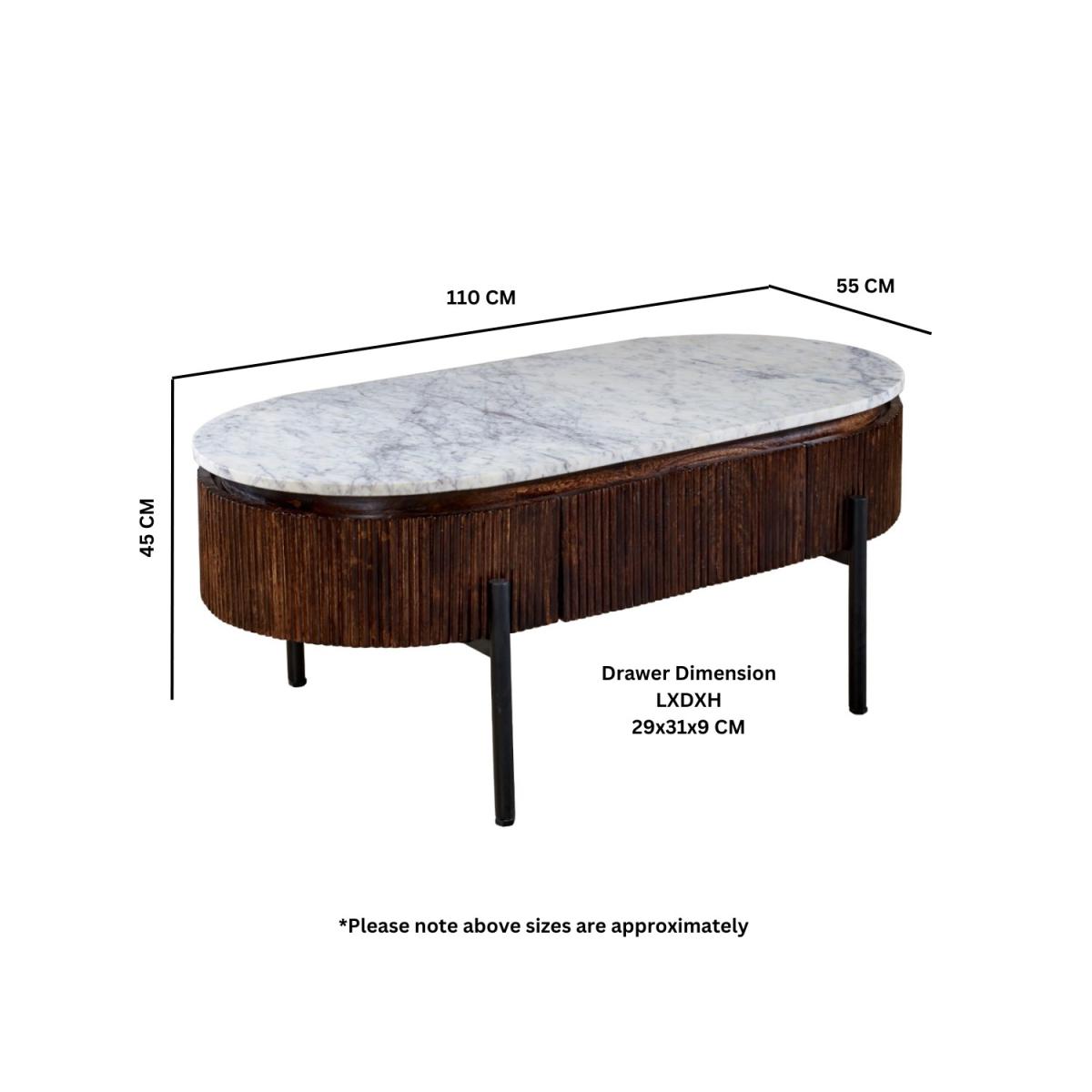 Dimensions:W110 x D55 x H45 cm This exquisite oval coffee table with drawer will add a touch of elegance and style to your home. The marble top will stand the test of time and the eyecatching artwork fluted wood surround compliments it perfectly along with 2 drawers large enough to hold any tv remotes, coasters etc. Sturdy metal legs complete the look of this item which is completely handmade by our skilled craftsmen in India using eco friendly materials. Made from 100% mango wood and natural marble. Features: Mango wood White marble top Metal legs Matching items available Some assembly required