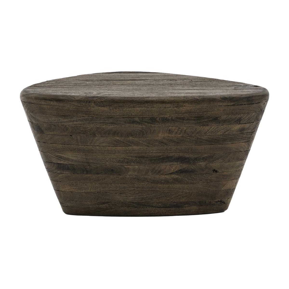 Dimensions:W70 x D53 x H36 cm This stunning mango wood side table has the most unusual triangular shape with a patinated laminated angled base, which is hollow underneath, making it light & easy to move around. A matching coffee table is available. Features: Dark wood Triangular Matching items available