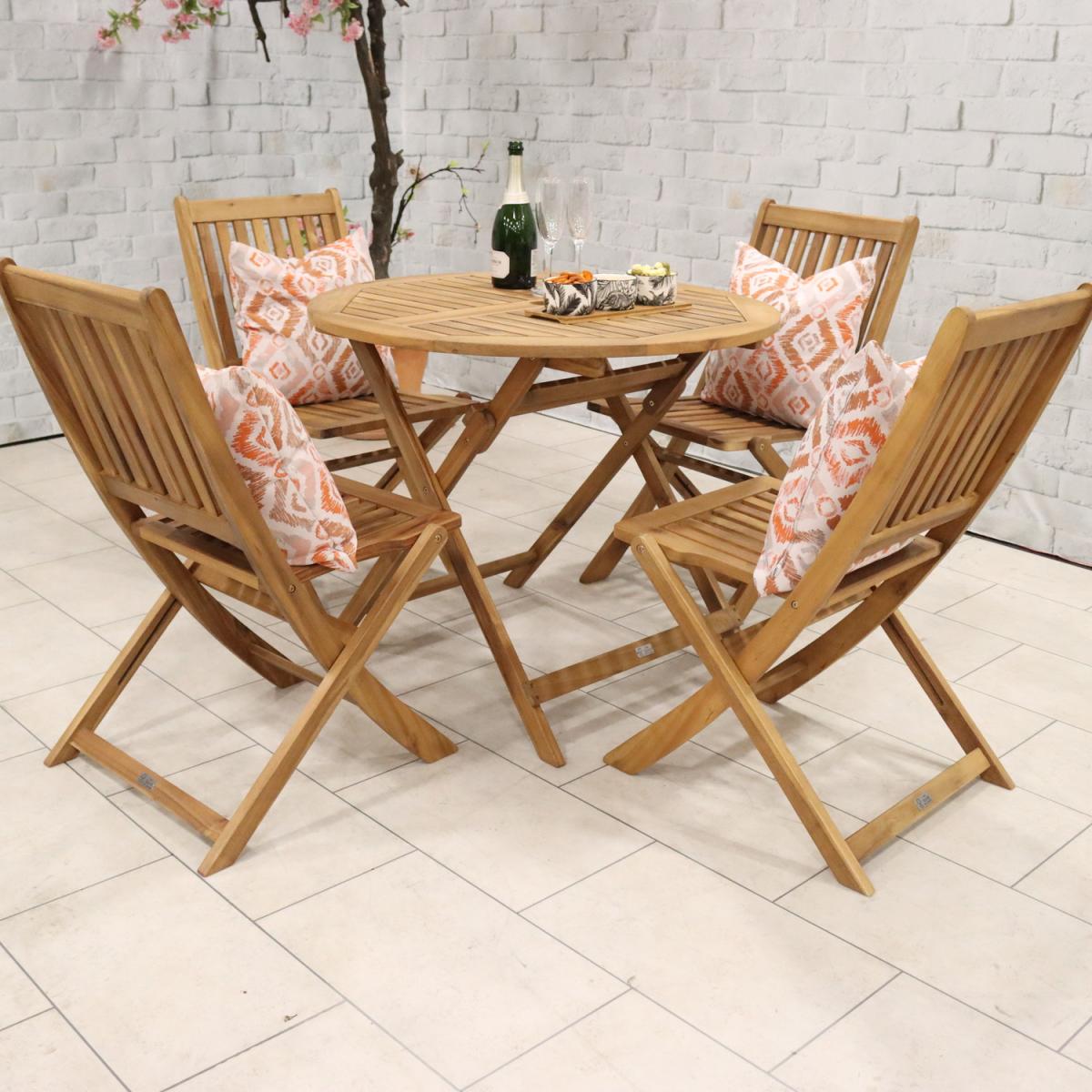 This Manhattan 4-seater dining set with 4 folding chairs will add timeless style to any outdoor space at an affordable price. Consisting of 90cm round folding table and 4 Manhattan chairs it is perfect for folding away for easy storage. Our 100% Acacia hardwood is perfect for creating high-quality furniture due to its warm tones and natural beauty. The acacia tree grows very slowly which makes the wood incredibly hard and durable allowing the furniture to be used for many years. The Manhattan 4 Seater set is perfect for your patio or small outdoor areas it will be a lovely addition to any outdoor space.