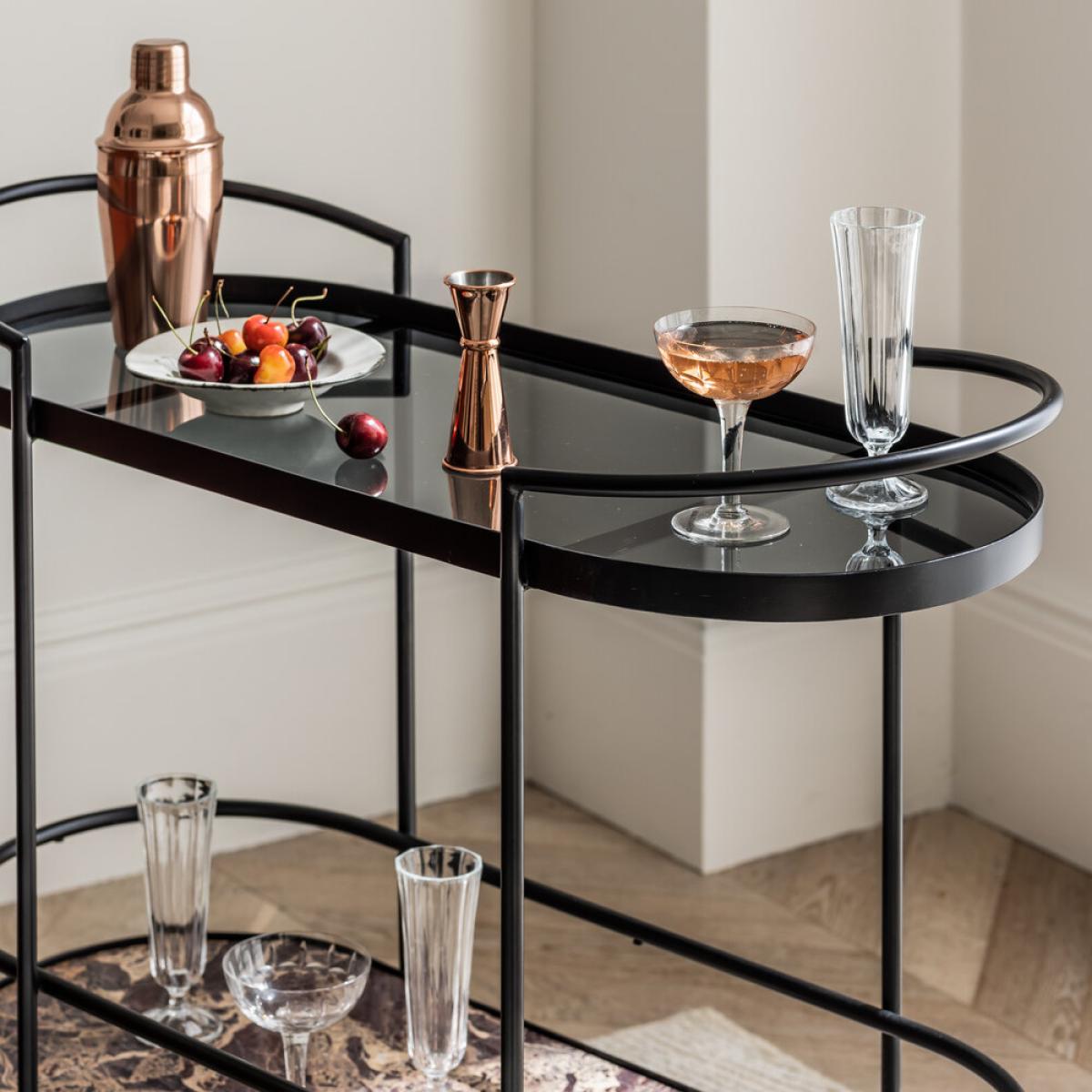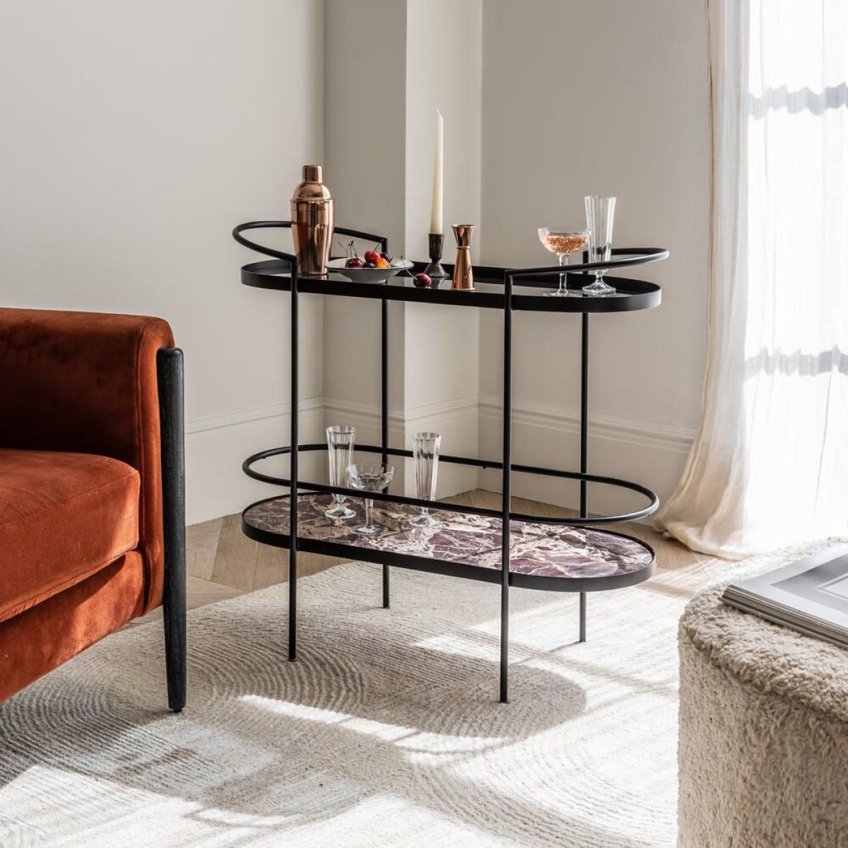 For anyone who loves to entertain, our Manhattan Marble Drinks Trolley is a practical and easy-to-use serving trolley oozing luxury and glamour. The black glass top, unique rust-coloured marble shelf and black metal frame have an art-deco look that fits effortlessly into a mid-century or industrial-style interior while the elongated lozenge shape has a lovely vintage and retro feel. It’s also really practical, as the sides help keep bottles and glassware safely stored until needed.