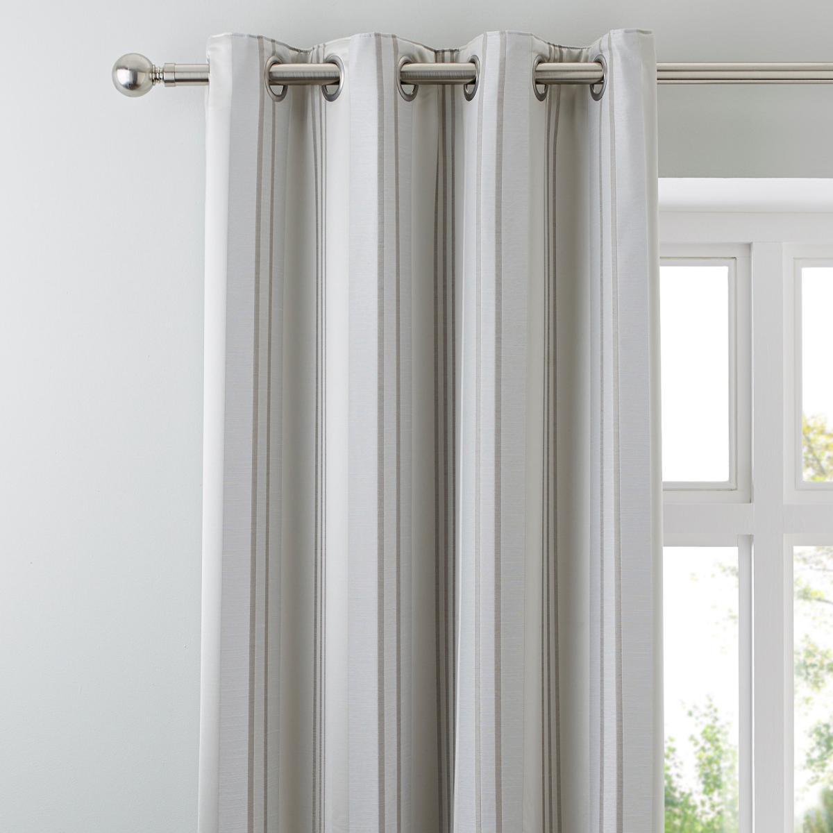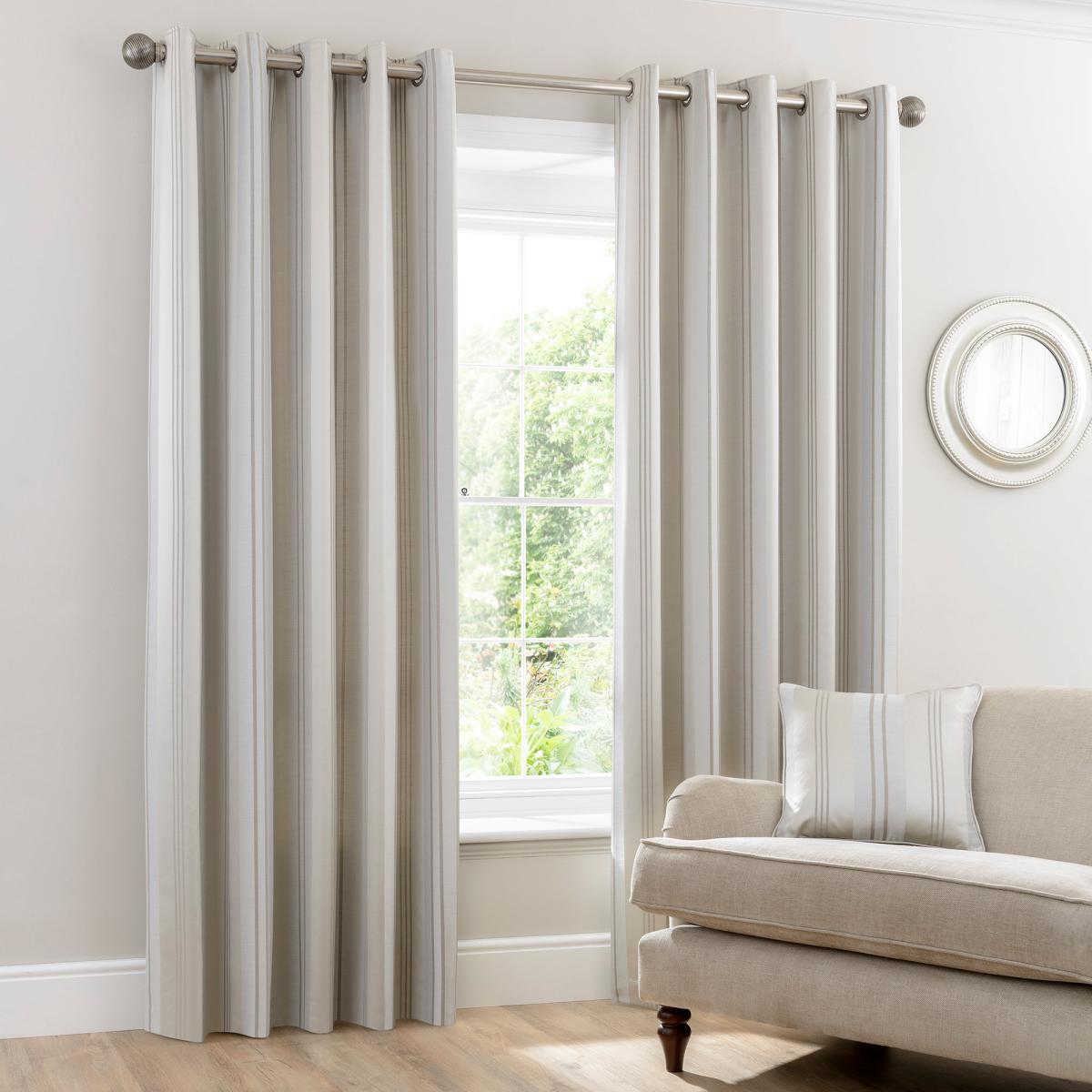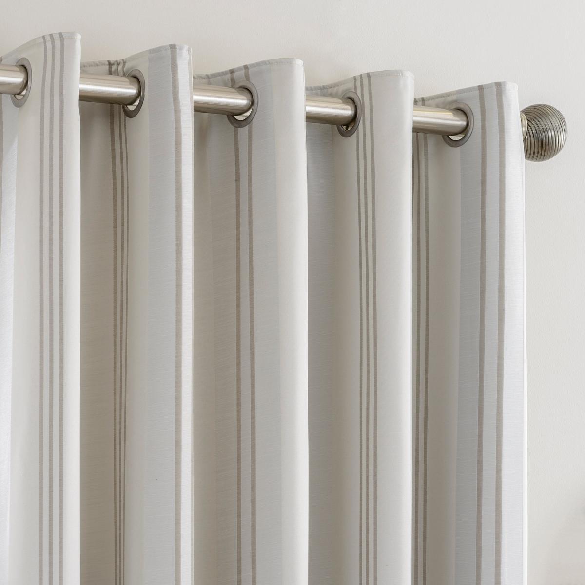 Interlined to provide a thicker fuller finish that will enhance their look and drape, this pair of stylish curtains have been designed with a modern stripe pattern in a natural colourway that will easily coordinate with any home style. Complete with an eyelet header suitable for use with a curtain pole, these curtains are made from strong and durable polyester and are available in a choice of sizes. The coordinating Manhattan cushion is sold separately. Please note: these curtains are sold as a pair.
