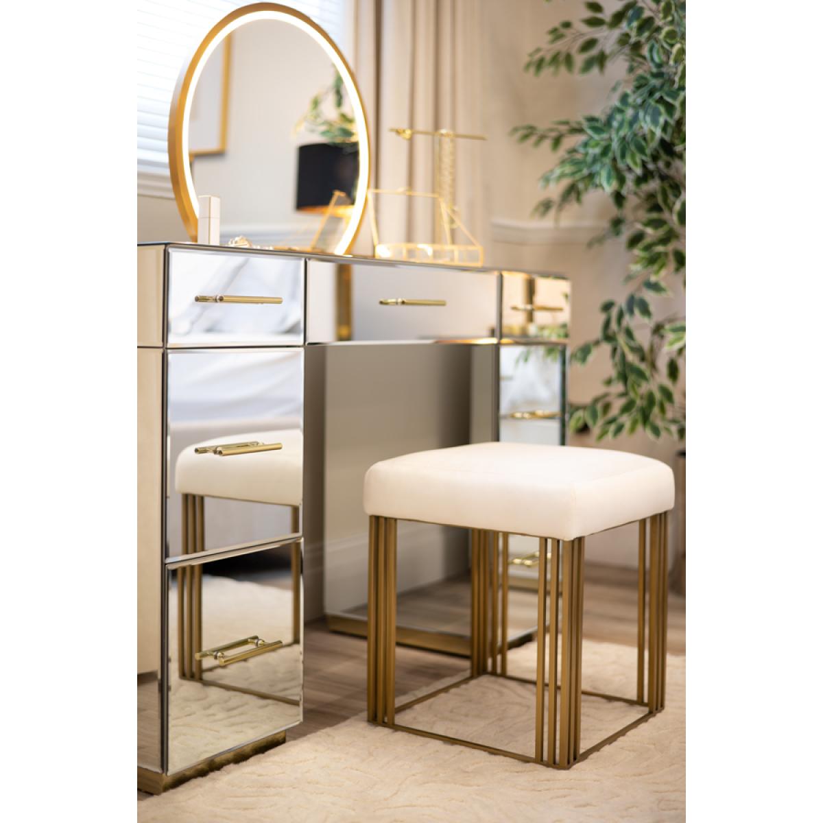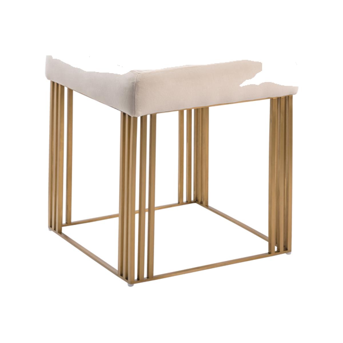 A distinctive and elegant design inspired by New York architecture. Foam padded top. Velvet upholstery fabric. Stainless steel legs with brushed brass finish. Ideal for use as a dressing table stool, footstool or for occasional seating. Fully assembled.