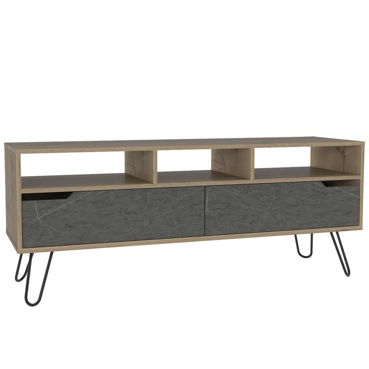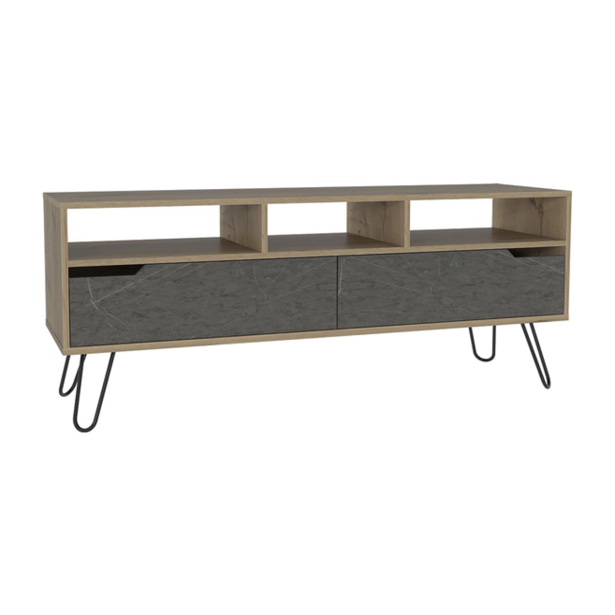 A practical and stylish TV stand designed to accommodate wide TV's, finished in hardwearing bleached pine and stone effect melamine fused with black metal hairpin legs.