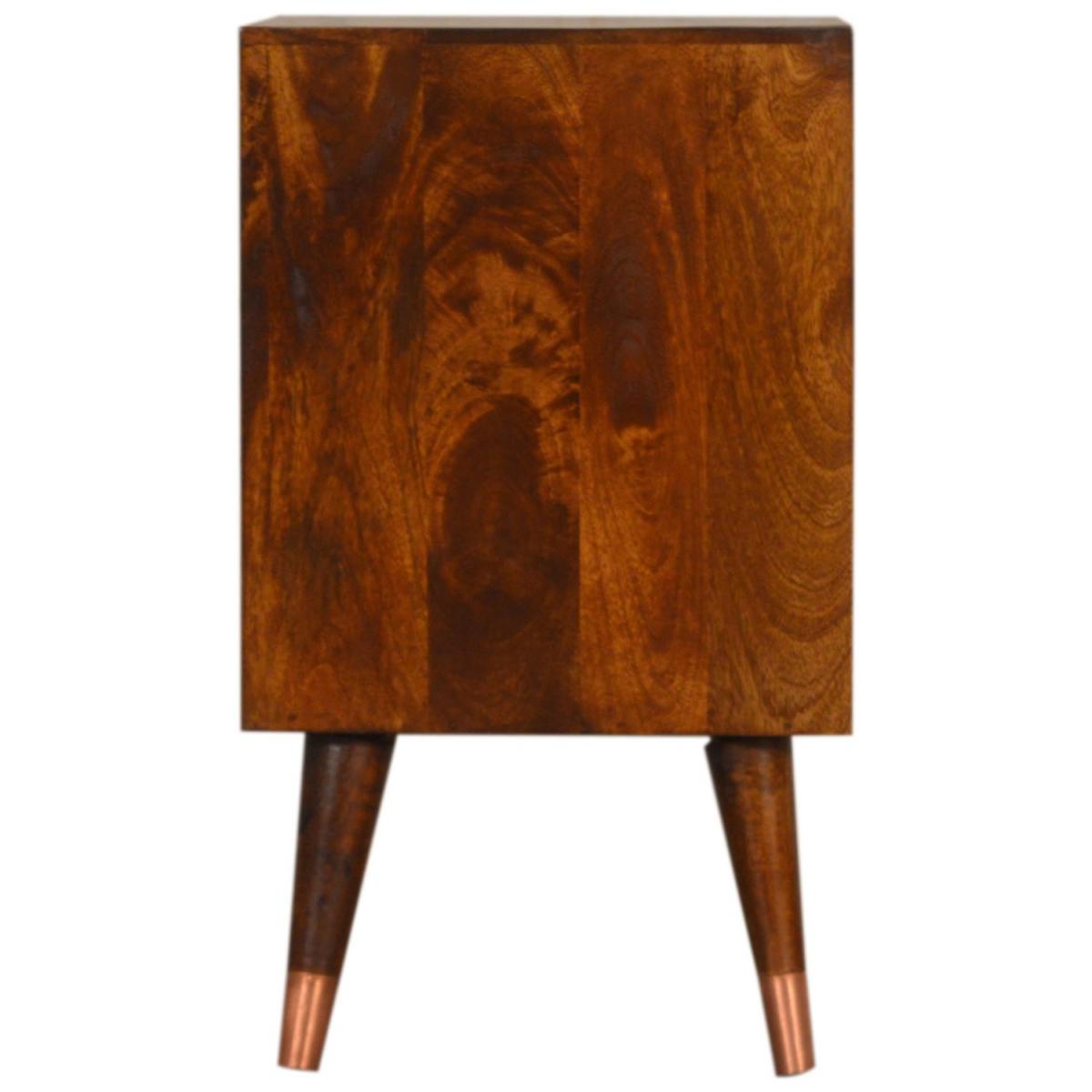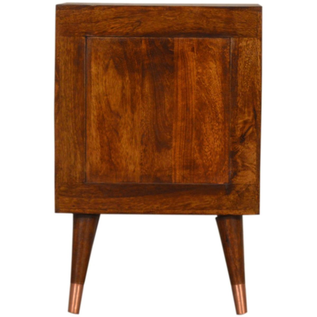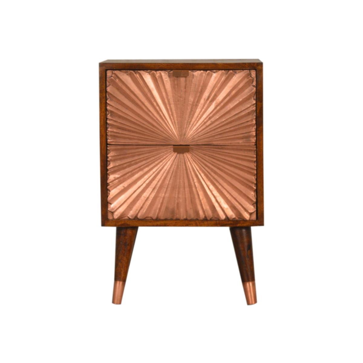 This Manila Copper Chestnut Bedside Table was designed to add a touch of elegance and charm to your bedroom, featuring copper inlay plated drawers and Nordic-style cap feet, this piece has been constructed from 100% solid mango wood and offers a rich chestnut finish and pull-out handles along with surface space to uplift your bedroom look.