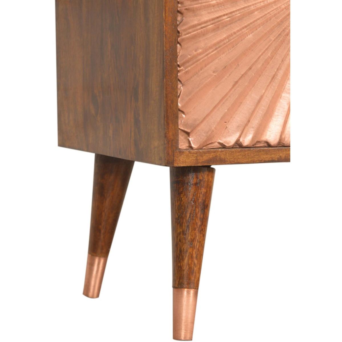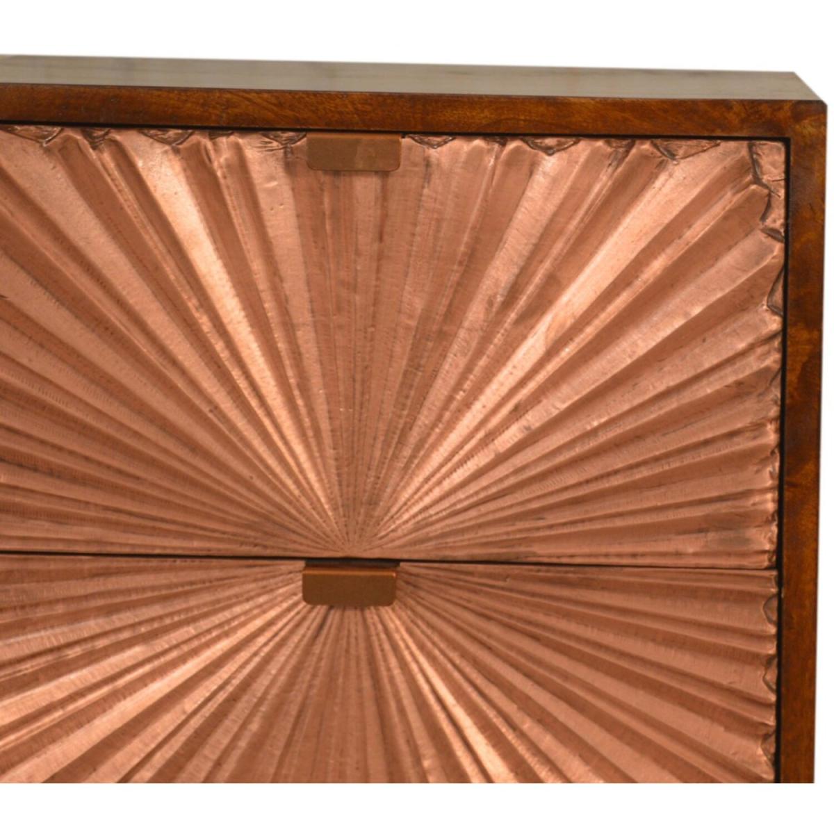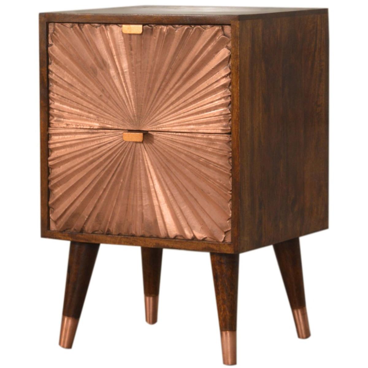 This Manila Copper Chestnut Bedside Table was designed to add a touch of elegance and charm to your bedroom, featuring copper inlay plated drawers and Nordic-style cap feet, this piece has been constructed from 100% solid mango wood and offers a rich chestnut finish and pull-out handles along with surface space to uplift your bedroom look.
