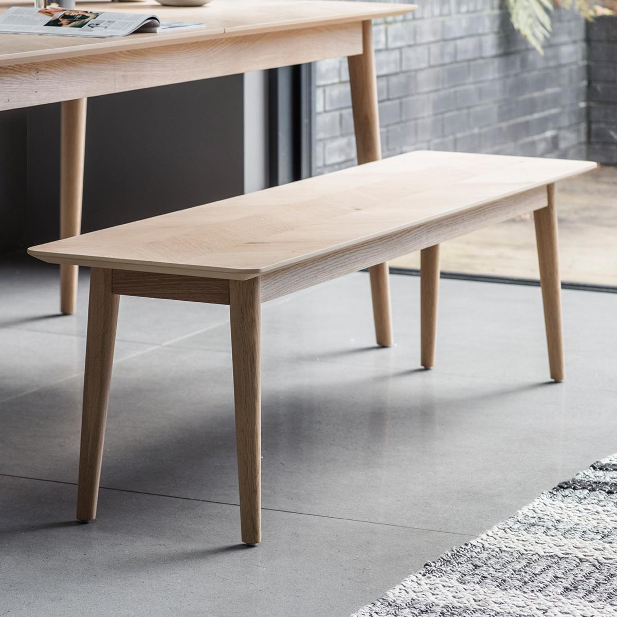 The Milano Dining Bench features a beautiful inlay chevron design, and is made using European oak and rustic oak structured veneers which show the natural beauty of the oak grain and knots. Finished in a specialist mat lacquer, which keeps the timber looking natural and dry, with brushed out grain, the range is tactile to touch and looks amazing.