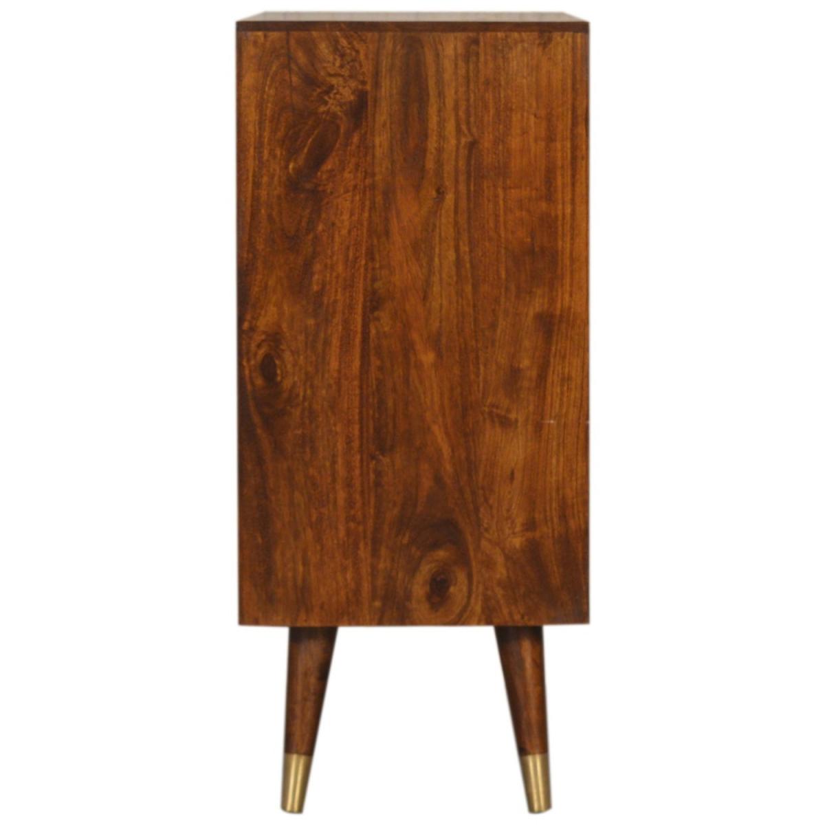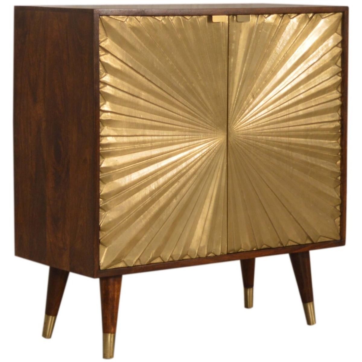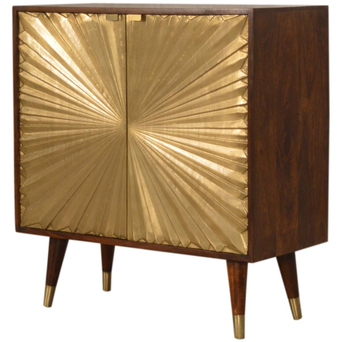 This Manila Cabinet was designed to add a touch of elegance and charm to your home, it features brass-plated doors and Nordic-style brass cap feet. It has been constructed from 100% solid mango wood in a rich chestnut finish and pull-out handles along with surface space on top to uplift your living room or hallway.