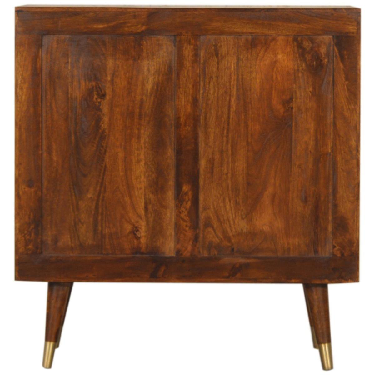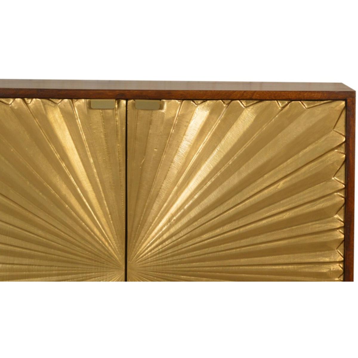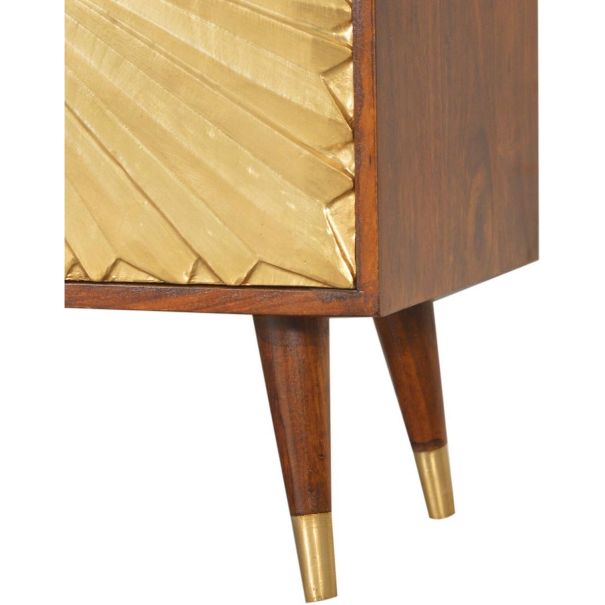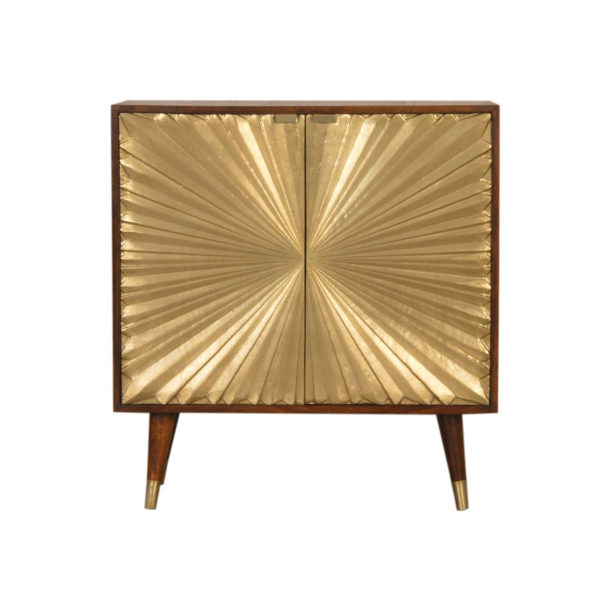 This Manila Cabinet was designed to add a touch of elegance and charm to your home, it features brass-plated doors and Nordic-style brass cap feet. It has been constructed from 100% solid mango wood in a rich chestnut finish and pull-out handles along with surface space on top to uplift your living room or hallway.