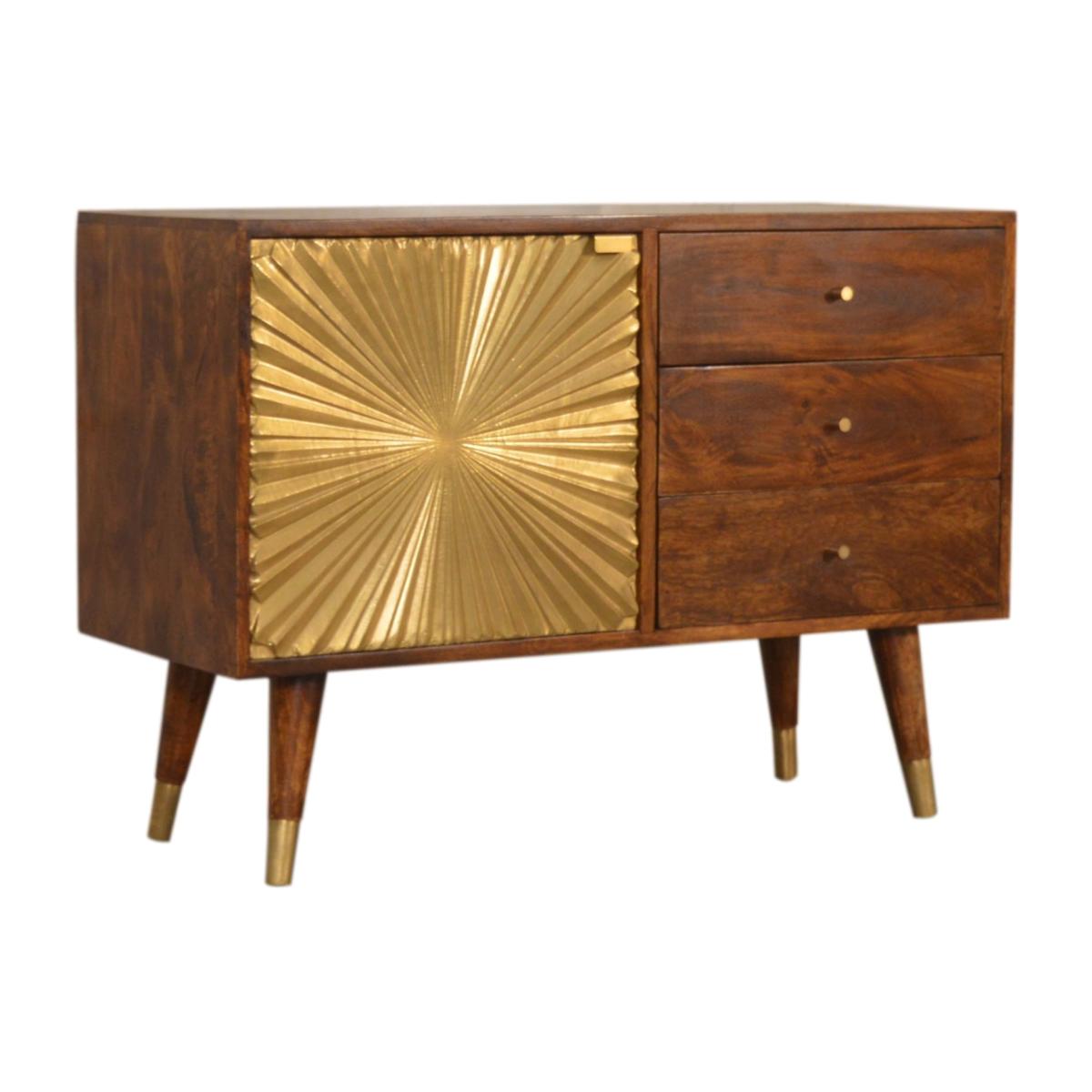 This Manila Sideboard is a stunning piece of furniture that will bring elegance and charm to your home. The sideboard has a brass plated cabinet that has a geometric pattern on the front, creating a contrast and a modern look. The sideboard also has three drawers that have pull-out handles and a chestnut finish that matches the mango wood material. The sideboard has Nordic-style brass cap feet that add some flair and sophistication. The sideboard is made from 100% solid mango wood that is durable and easy to clean. The sideboard has a spacious top surface where you can display your items or keep them organized. The sideboard is perfect for the living room or hallway, where it will enhance the style and functionality of your space. The sideboard also comes with free shipping within the UK mainland only.