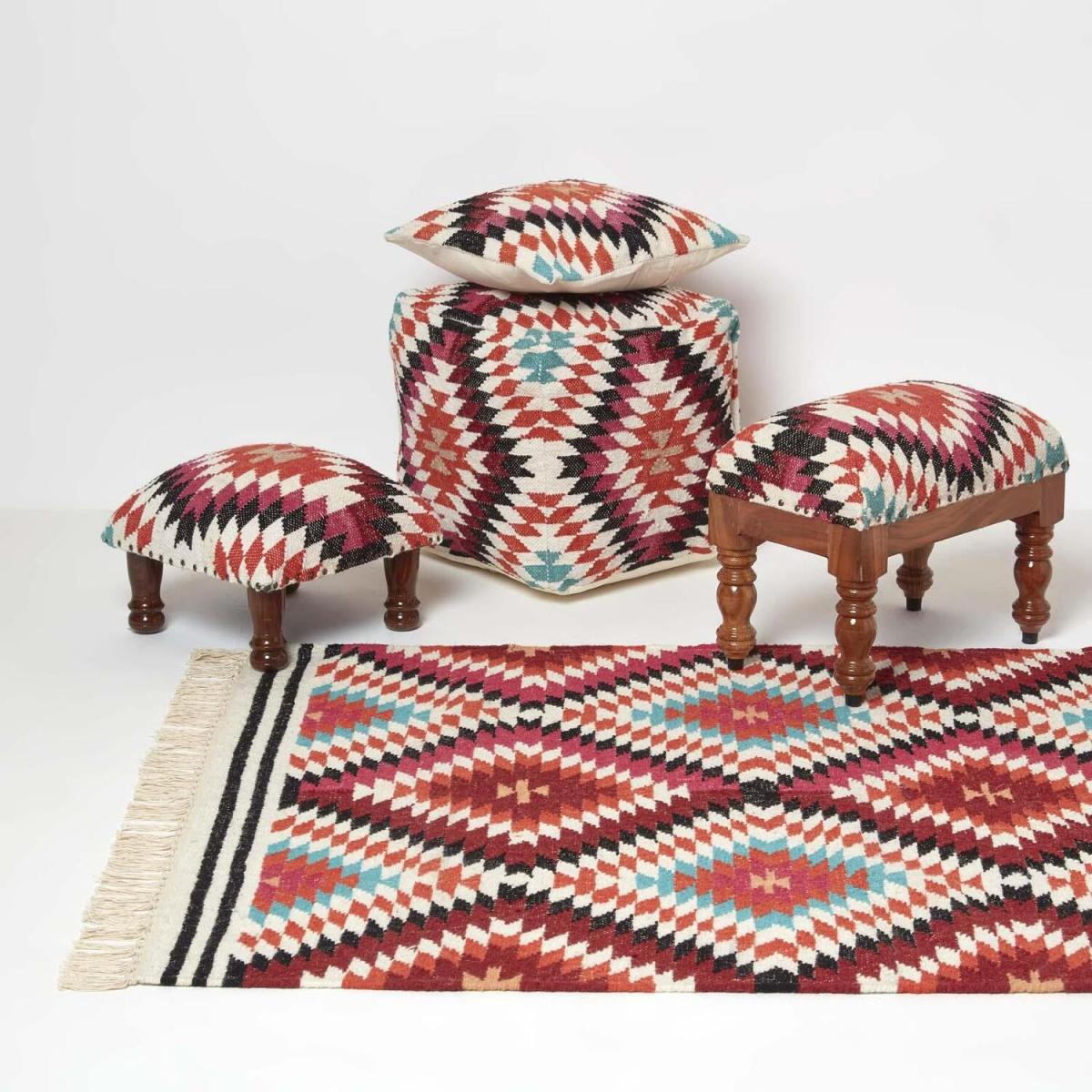 Manila - a high quality handcrafted solid wood and kilim pouffe by Homescapes. Combining modern colours with traditional handwoven kilim and a classic wooden base, this timeless piece merges comfort and style together. With a cover expertly woven from durable wool and cotton, this pouffe is expertly upholstered and generously filled with soft, bounce-back polyester fibre. Resulting in a super comfortable, stylish pouffe that will last for years to come. This colourful collection of kilim pouffes can be used in many ways, be it as occasional seats or foot rest or even as coffee and side tables. Great for brightening your interior, these vibrant pouffes help to create an inviting, warm atmosphere in which you and your loved ones can feel comfortable and at home. The Manila Homescapes pouffe comes in two sizes. Sizes available 40 x 40 x 25 cm, 50 x 30 x 40cm. Colour Pink, orange and blue. Complete the look with our coordinating collection of bean-filled pouffes, cushions and rugs available in a range of sizes.