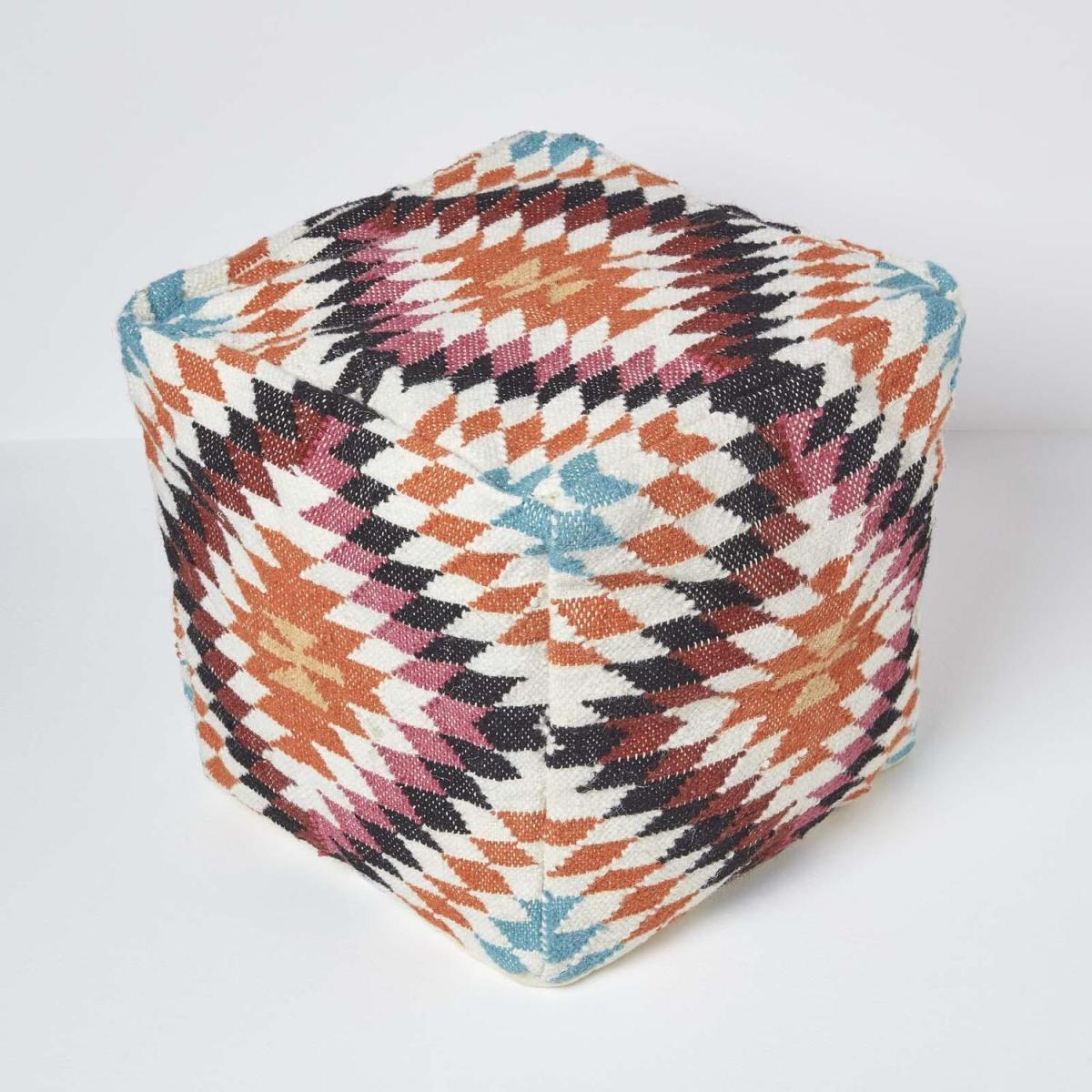 Traditionally handwoven kilim pouffe from Homescapes exclusive kilim collection. These durable, hardwearing footstools are woven from 100 cotton and 100 wool that create tapestry style decorative design, perfect for everyday use. Featuring a traditional textured design that echoes Indian and Tribal patterns, these striking and colourful pouffes are sure to make a statement in any home. Generously filled with polyester beads, that are encased within thick, 100 cotton to prevent filling leakage, these versatile beanbag style pouffes are both practical and comfy. A range exclusively designed by Homescapes, each kilim pouffe is expertly handwoven, resulting in a truly unique accessory each and every time. Using the finest quality fair-trade cotton and wool, each colour has been dyed using natural dyes and finished to a premium standard. Measures 43 x 43 x 43cm square. Spot clean only. Matching Kilim rugs, cushions and home accessories are also available from Homescapes, sold separately. Each pouffe is truly unique, images are representative of the kilim pattern and colours, due to the handcrafted nature of kilim, each pouffe design may differ slightly.
