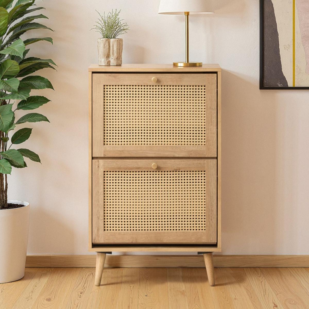 The Manila 2 Door Flip Down Shoe Storage Cabinet offers a charming fusion of natural texture and practical design. With PVC Rattan detailing on the door fronts and a warm oak-effect frame, this compact cabinet adds a subtle rustic touch to your hallway or bedroom space. Behind the two flip-down doors, the unit reveals cleverly designed compartments built to maximise the amount of shoes that can fit in the space, keeping your footwear organised and out of sight. Its slim profile makes it ideal for narrow spaces, while the flip-down mechanism allows easy access to your shoes without taking up extra space.