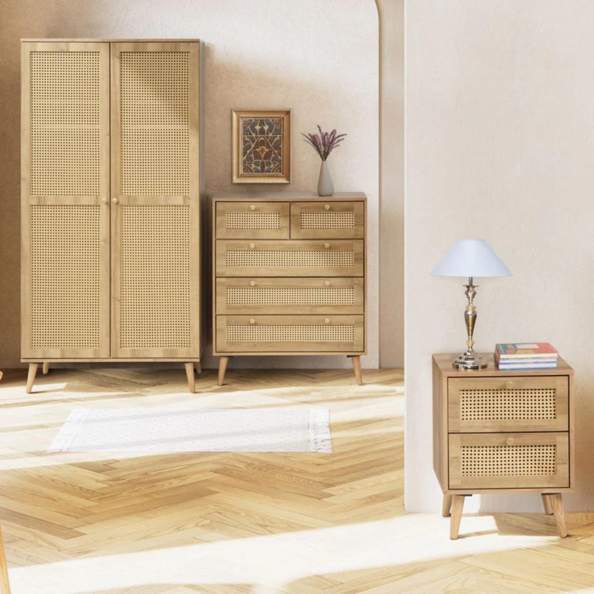 Embrace laid-back elegance and natural charm with our Manila Rattan 3 Piece Bedroom Set, a thoughtfully curated collection that brings texture, warmth, and relaxed sophistication to your space. Featuring a 2-Door Wardrobe, 3+2 Drawer Chest, and 2-Drawer Bedside Table, this set channels a bohemian rustic aesthetic with its soft wood effect finish and intricately patterned PVC rattan door and drawer fronts. The 2-door wardrobe offers hanging space and a shelf above, ideal for neatly storing clothing, outerwear, or accessories. The 3+2 chest of drawers provides a versatile combination of deep and shallow drawers, perfect for everything from bulky knits to delicate layers. Completing the set, the 2-drawer bedside table is both stylish and functional, offering the perfect spot for night time essentials within easy reach. United by gentle earthy tones, tactile surfaces, and minimalist black handles, this collection is ideal for creating a space that feels calm, grounded, and beautifully considered.