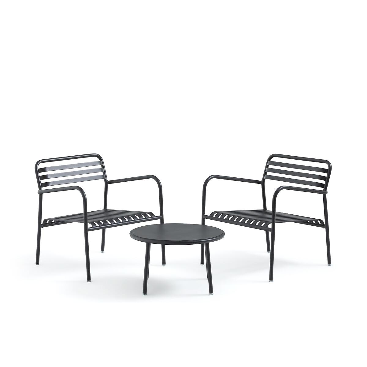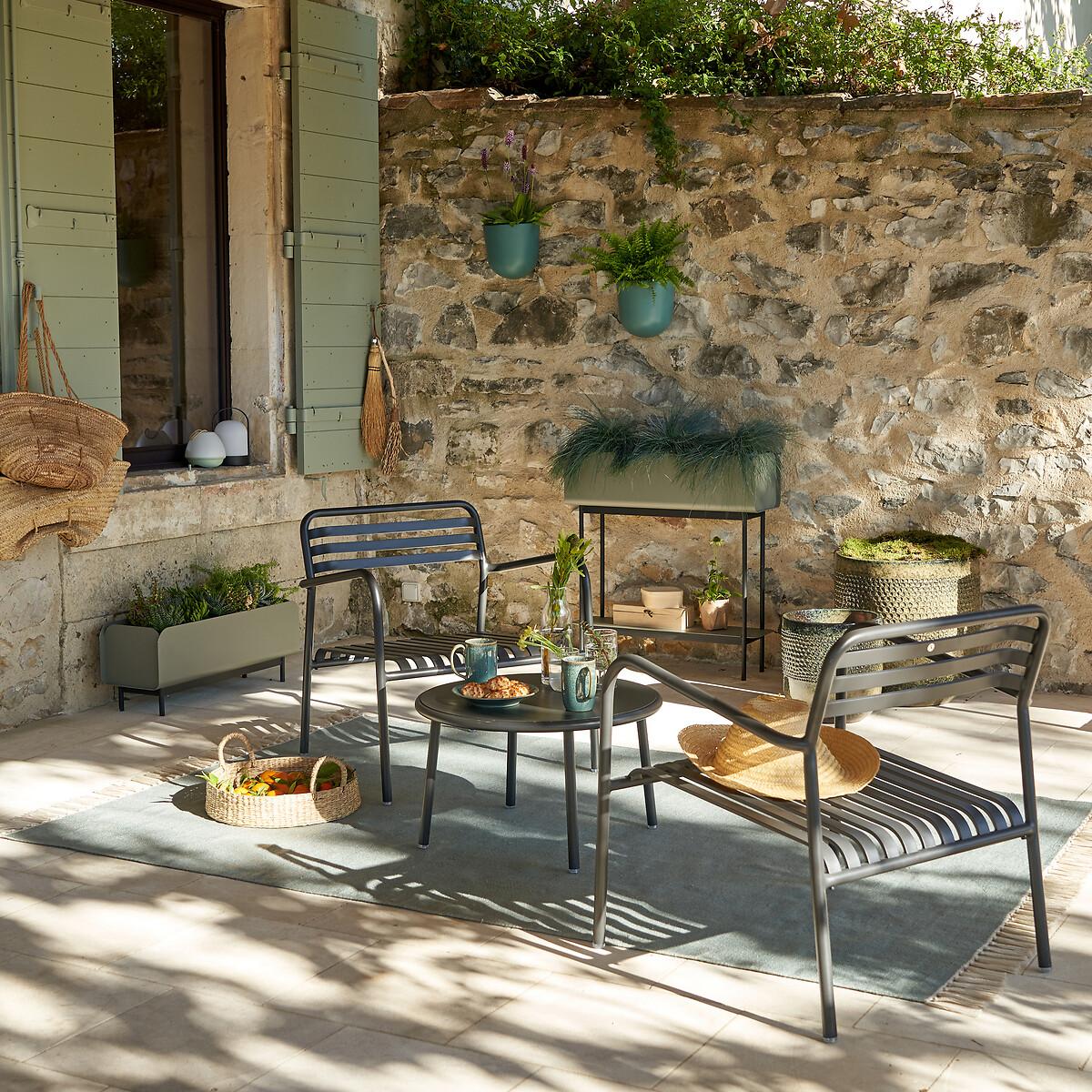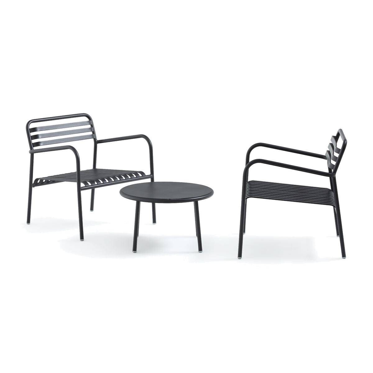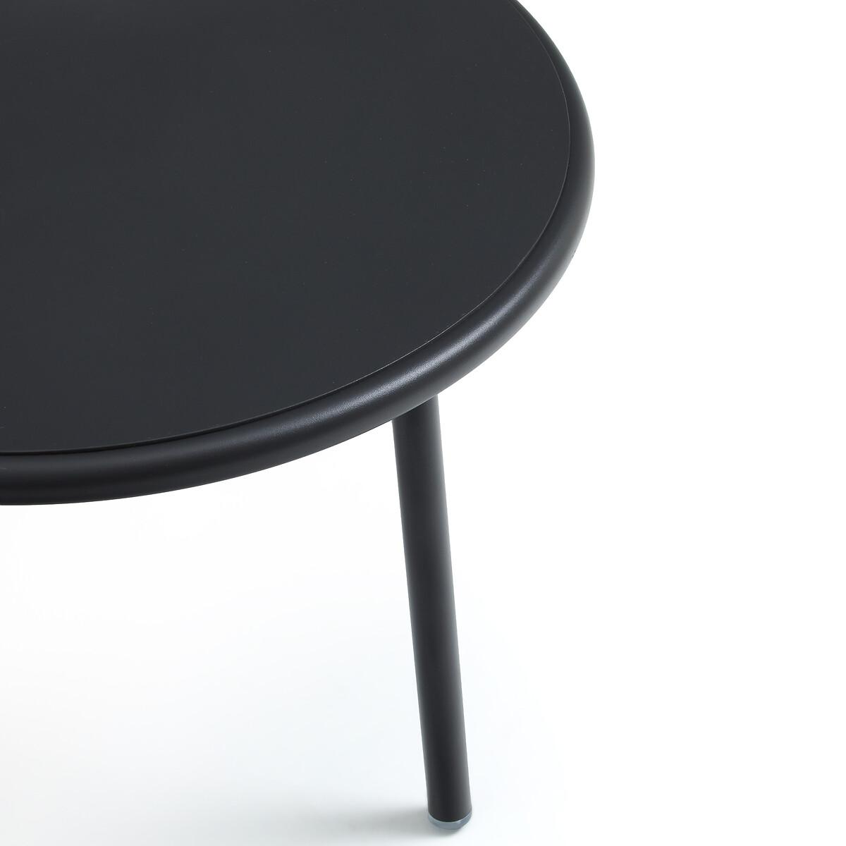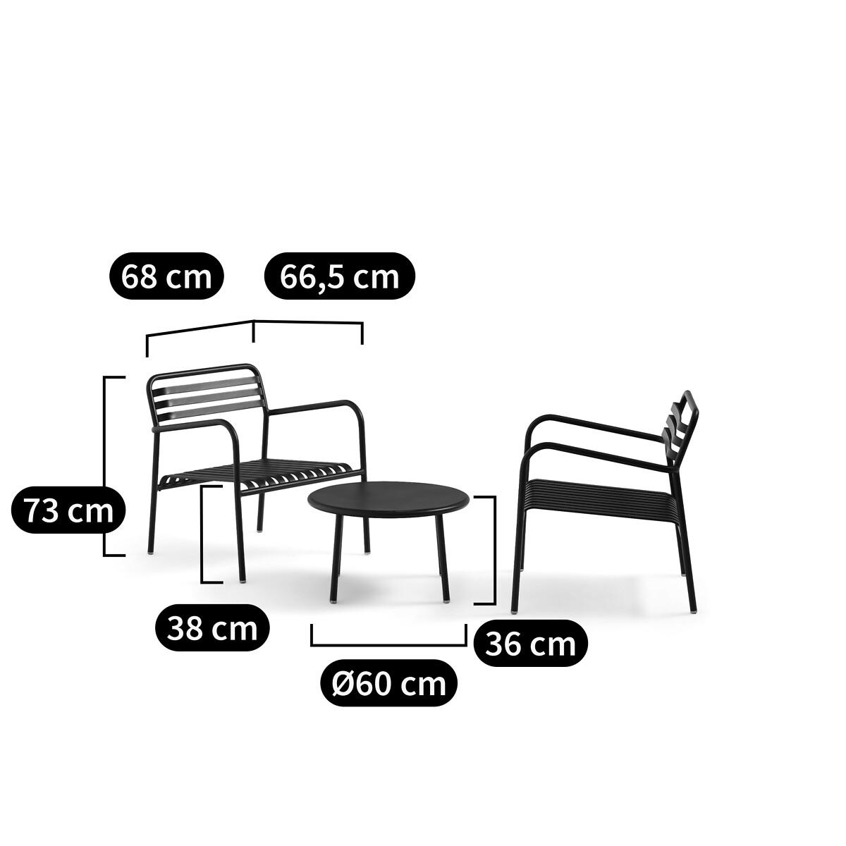 The Manni garden set is ideal for one-on-one gatherings on beautiful summer days. Practical and light thanks to its aluminium construction, this set is composed of a table and two stackable armchairs. Product Details • Structure and legs in black tinted aluminium with polyester paint • Set consisting of a round coffee table and two stackable garden armchairsDimensions Armchair • Width: 68cm • Height: 73cm • Depth: 66.5cm • Seat: L53 x H38 x D60cm • Weight: 6kg. Table • Diameter: 60cm • Height: 36cm • Weight: 3kg. Quality • Aluminium has the advantage of not rusting and is also very resistant to abrasion. Easy to clean, it can be washed with soapy water. This material is ideal for outdoor furniture. Delivery:The armchairs are sold assembled, coffee table requires assembly..Note! Please check that the openings (doors, stairs, elevators) allow the passage of the package during delivery. Dimensions and weight of parcel1 parcel • L73.5 x H84 x D72cm. 23kg