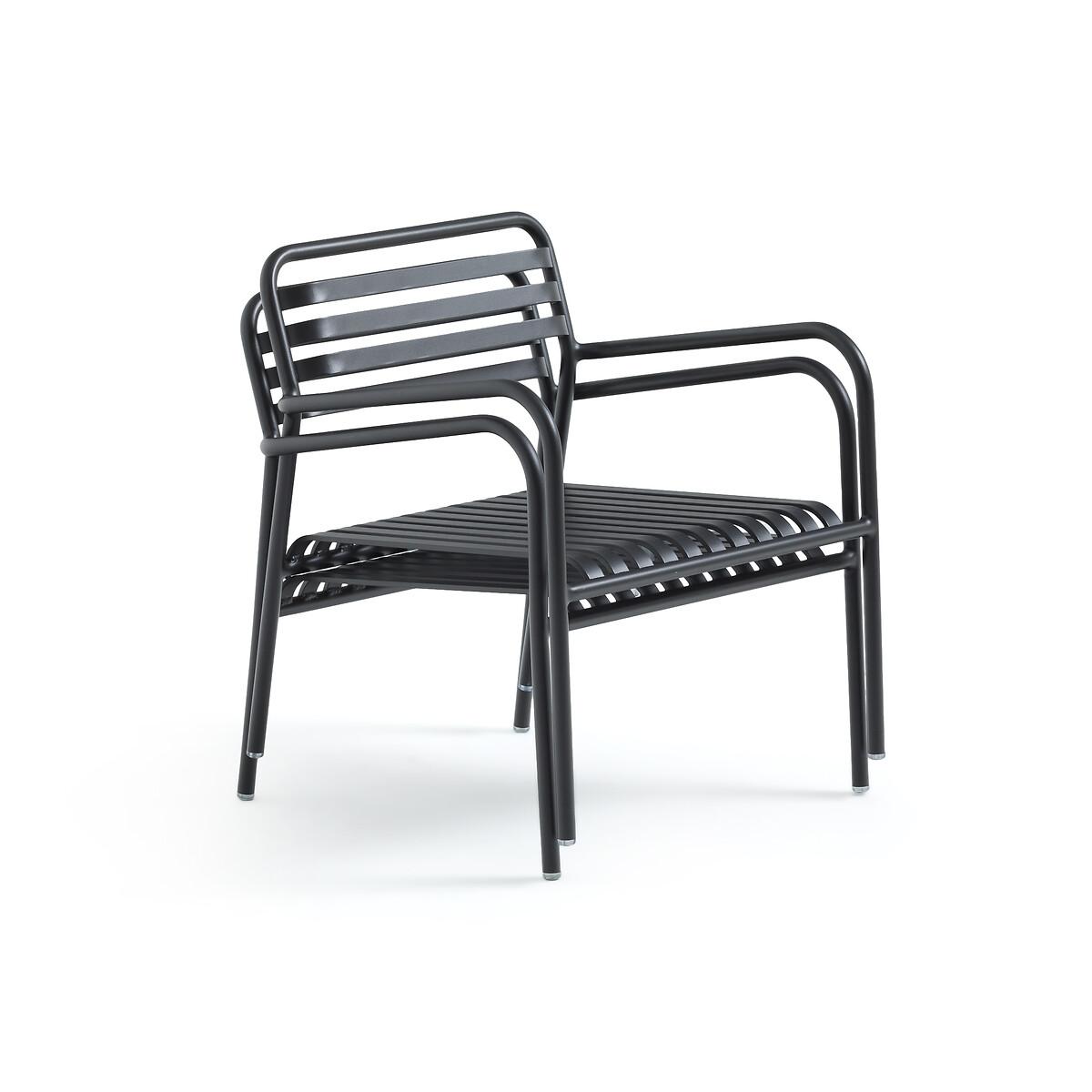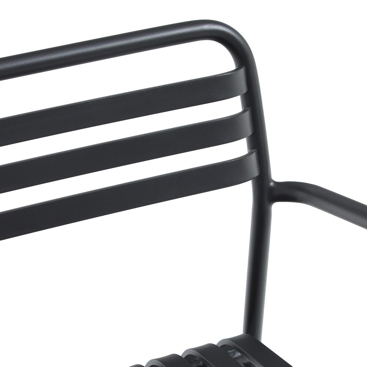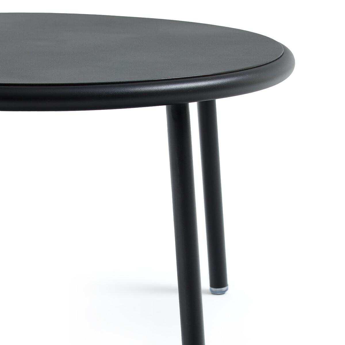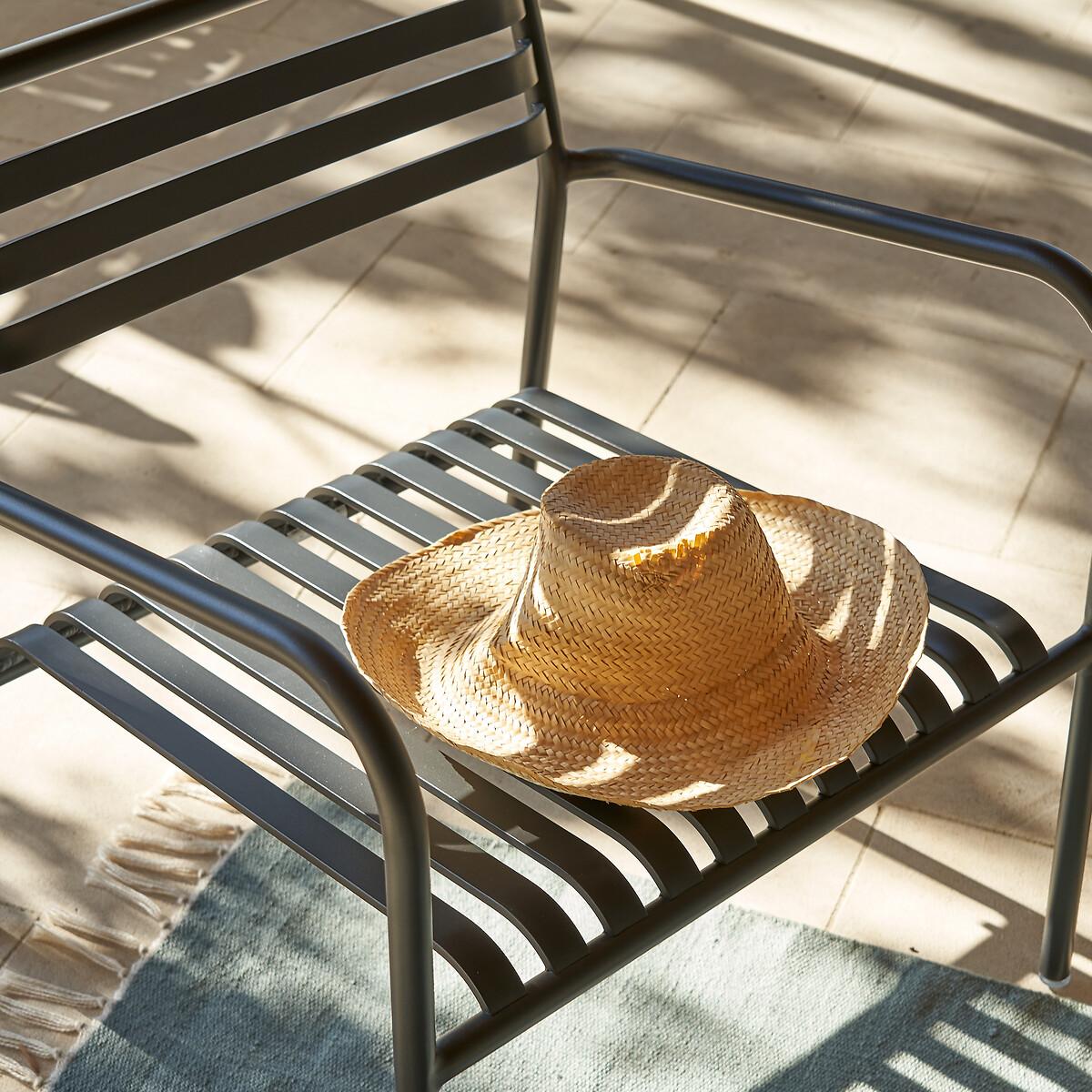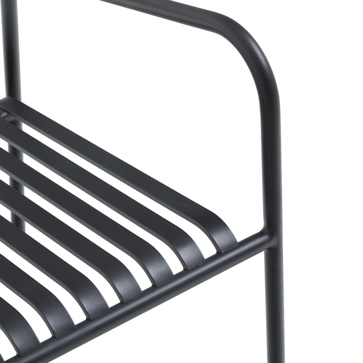 The Manni garden set is ideal for one-on-one gatherings on beautiful summer days. Practical and light thanks to its aluminium construction, this set is composed of a table and two stackable armchairs. Product Details • Structure and legs in black tinted aluminium with polyester paint • Set consisting of a round coffee table and two stackable garden armchairsDimensions Armchair • Width: 68cm • Height: 73cm • Depth: 66.5cm • Seat: L53 x H38 x D60cm • Weight: 6kg. Table • Diameter: 60cm • Height: 36cm • Weight: 3kg. Quality • Aluminium has the advantage of not rusting and is also very resistant to abrasion. Easy to clean, it can be washed with soapy water. This material is ideal for outdoor furniture. Delivery:The armchairs are sold assembled, coffee table requires assembly..Note! Please check that the openings (doors, stairs, elevators) allow the passage of the package during delivery. Dimensions and weight of parcel1 parcel • L73.5 x H84 x D72cm. 23kg